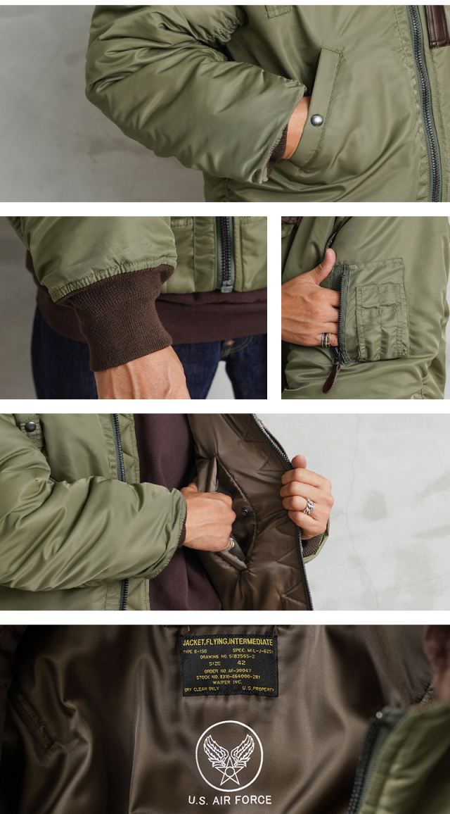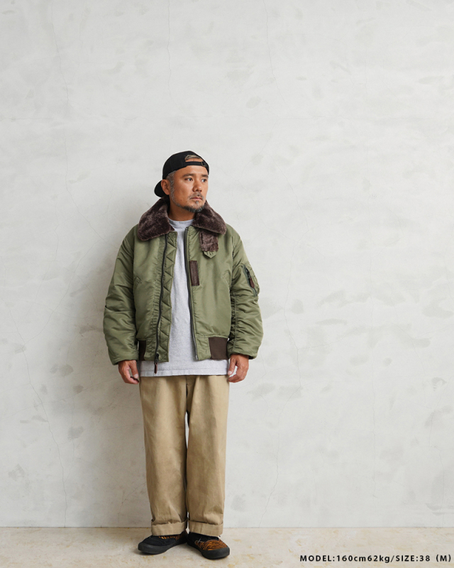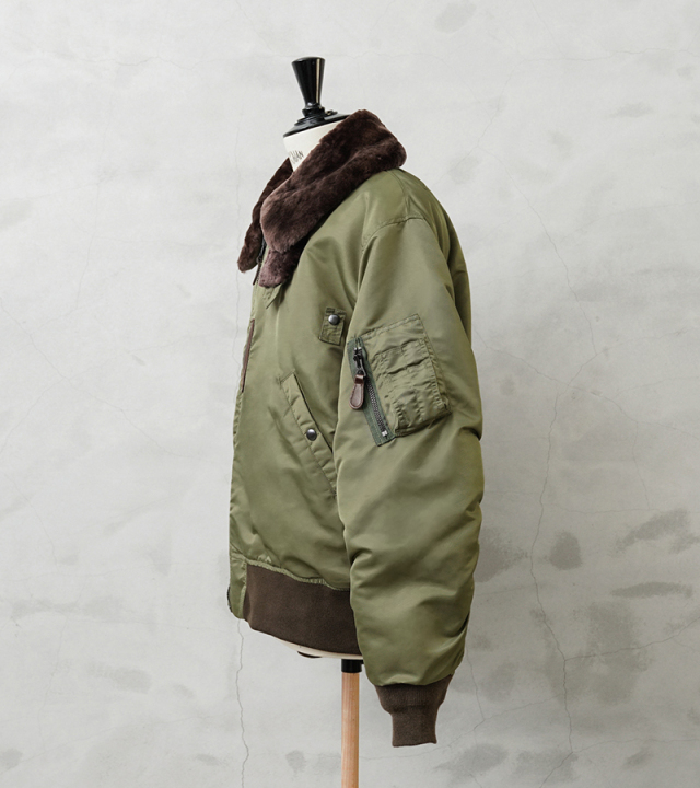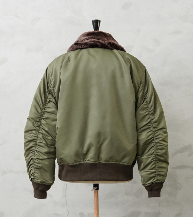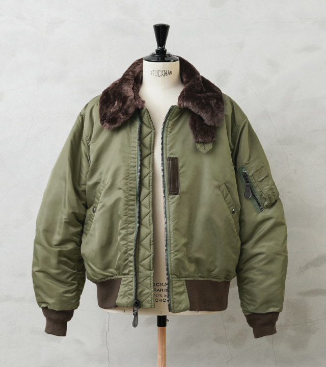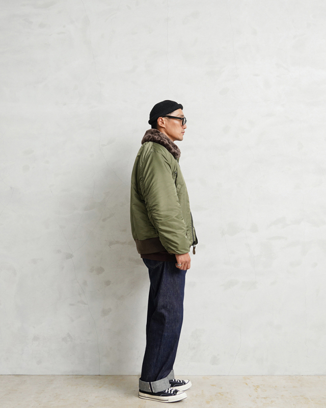 1945年に登場したB-15は当時、革新的だったナイロン素材が初めて採用されたフライトジャケット。後に続くMA-1の系譜を辿るうえで欠かせないジャケットです。後に廃止されることになる襟のムートンファーは、防寒性を高めるディテールながら時代とともにヘルメットの着用など装備の複雑化に伴いだんだんと姿を消していきます。さらに今季からサイズ感も新たに見直し、よりどっしりとした実物を彷彿とさせる無骨なシルエットを再現しています。アームホールの立体的な構造は腕が前に振られた状態で可動域も広く、なおかつ着用した際に袖口に生地が溜まるヴィンテージのフライトジャケットのような着心地にこだわりました。