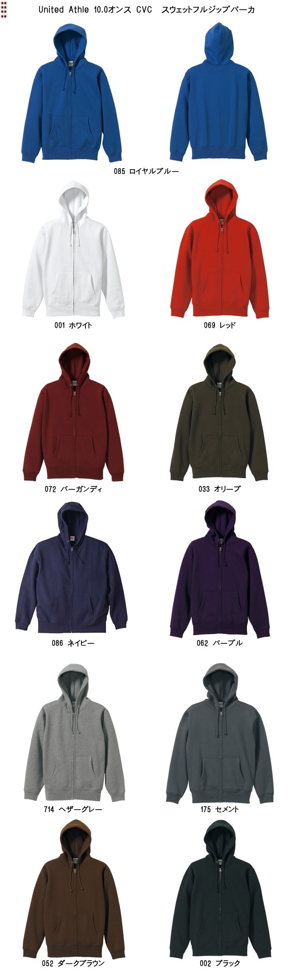 | 商品名 | United Athle ユナイテッドアスレ10.0オンス CVC スウェットフルジップパーカ 11色【5620】 |