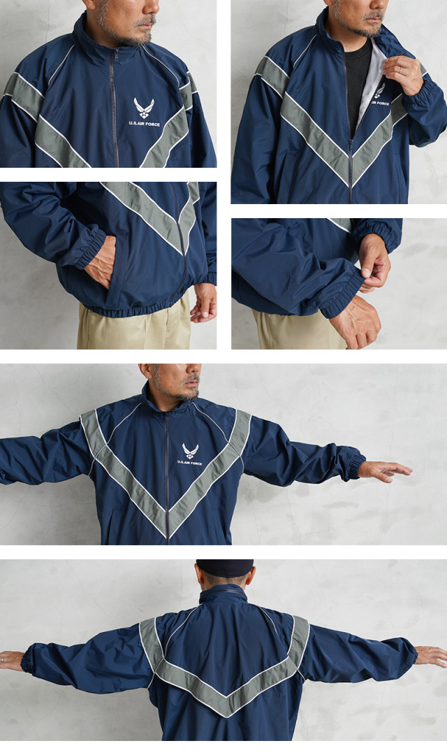 PTU(Physical Training Uniform)はアメリカ空軍兵士がトレーニング時に着用している、トレーニング用のジャケットです。エアフォースブルーカラーが特徴で、左胸にワンポイントでエアフォースの刺繍がされ、フロントとバックには安全を確保するシェブロンVと呼ばれるV型の光を反射するリフレクターがデザインされており、早朝や夜間のトレーニング時にも視認性を高めます。表地に防風、防水処理が施されたナイロン100%を使用。スタンドカラーには伸縮性に優れたフードが内蔵されています。脇下にはベンチレーションが備わっていますので蒸れを防ぎ高いパフォーマンスを維持します。背中にもVラインに沿ってベンチレーションが配置され熱がこもらない仕様になっています。