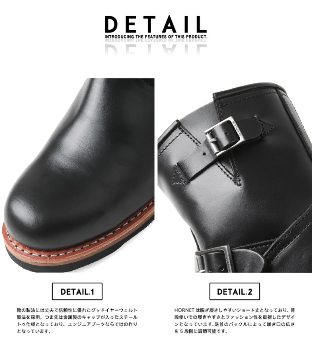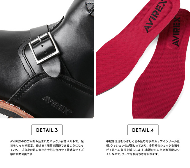 | 商品説明 | AVIREX アビレックス HORNET ショート レザーエンジニアブーツ のご紹介です。 品名:HORNET BOOTS 品番:AV2225 AVIREXより、本格的な仕上がりのショートエンジニアブーツが登場! 上質なカウハイドレザーを贅沢に使用しており、実用性と質感の良さを兼ね備えた一足です。 カウハイドレザーは適度な厚みと丈夫さが特徴で、柔軟性と強度が必要なブーツにうってつけの素材です。丁寧に鞣されたレザーが放つ鈍い光沢感と、なめらかな手触りが男心をくすぐります。オーソドックスな仕上げが施されたBLACKのほか、マットで荒々しい質感に仕上げたCRAZY HORSEの2色をご用意。本革ならではの重厚な雰囲気、そして履き込む程に味の増してゆく「自分だけの一足」感をお楽しみ頂けます。 高級靴にも採用される伝統的な“グッドイヤー・ウェルト製法”を採用。工程が複雑であるため他の製法の靴と比べてややコストが嵩みがちですが、履き心地の良さ、修理可能で長く履けることから、グレードの高いブーツ・シューズに採用されている信頼できる製法です。ソールが擦り減った場合にはオールソールと呼ばれる靴底全体を付け替える修理が可能です。 足首に設けられたバックル付きベルトは長さを4段階で調節できるようになっており、ご自身の足の大きさや形に合わせて最適なサイズ感に調節可能です。中敷きはクッション性に優れたカップインソール仕様となっており、地面からのショックを緩和。市販のインソールと交換可能な構造ですので、ブーツを長持ちさせられます。 アウトソールには車のスパイクタイヤのように大きめのパターンを持つラグソールを採用し、高いグリップ力を発揮!耐油処理が施されたオイルレジスタントソールとなっており、通常のソールとくらべ滑りにくくなっています。つま先は金属製のキャップが入ったスチールトゥ仕様となっており、エンジニアブーツの名に恥じない本格的な作りとなっています。 細部のメタルパーツや縫製、さり気なくデザインされたU.S.A.F.のシンボルマークなど、細部のディテールに関してもひとつひとつ丁寧に仕上げられており、当店で取り扱っているフットウェアのなかでも屈指の販売数と高い評価を誇るアイテムの一つ。自信を持ってお勧めできる一足です。 当店はAVIREX正規販売店ですので安心してお買い求め下さい。 |