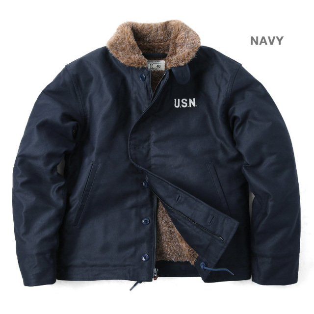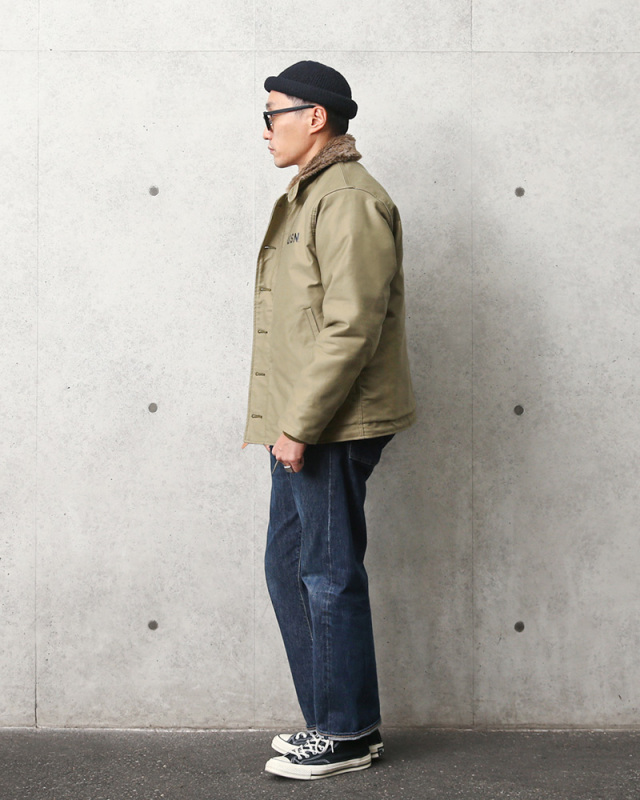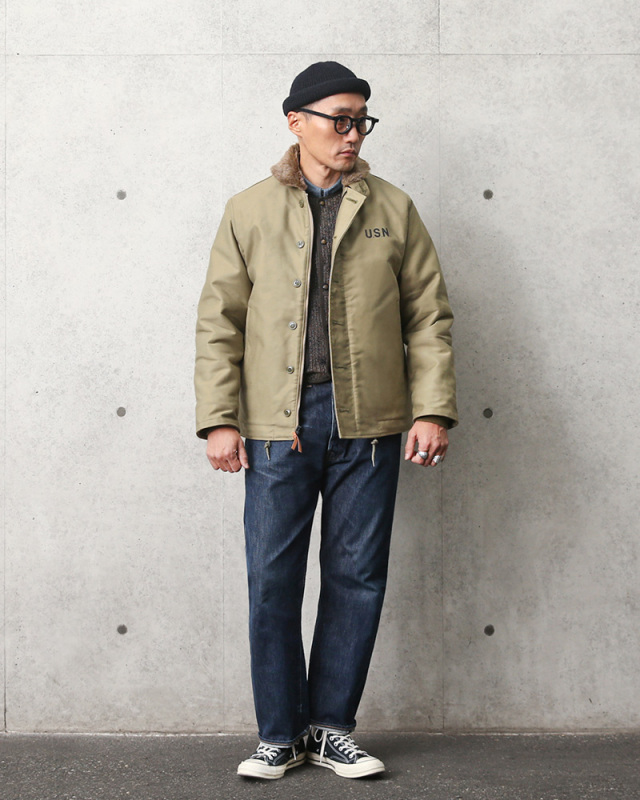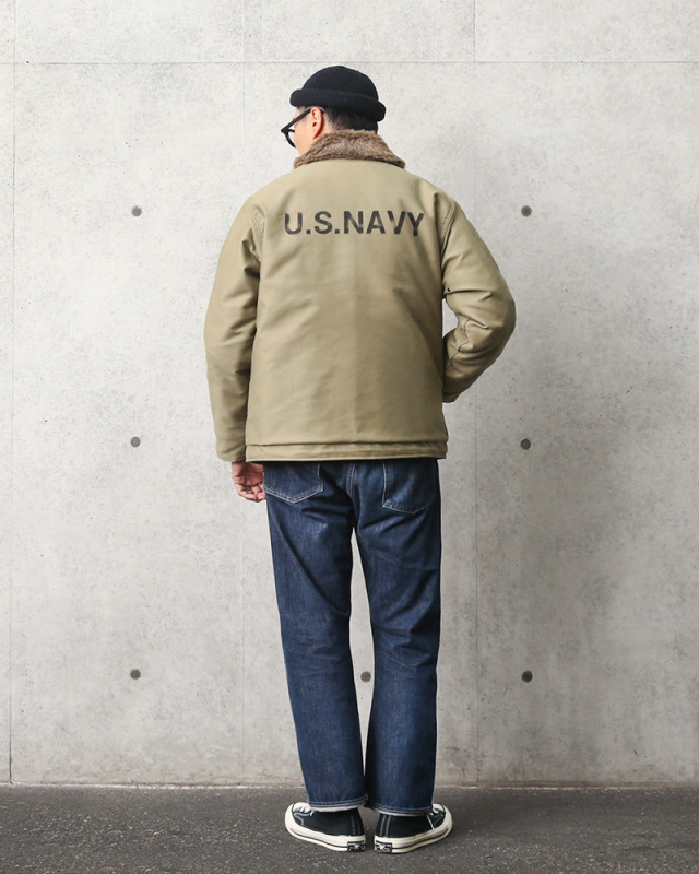 | 商品説明 | HOUSTON ヒューストン N-1デッキジャケット タイト・ステンシルモデル 日本製のご紹介です。 品番:5N-1X 1943年にアメリカ海軍によって制式採用された傑作ミリタリージャケット「N-1」を復刻再生産! ジャングルクロスと呼ばれる細畝のコットンピケや、細部の質感・ディテールなどオリジナルがもつ雰囲気を国内生産にて丁寧に復刻しました。背中にデザインされた「U.S.NAVY」のステンシルプリントが存在感抜群!身幅とアームをやや細め、着丈はやや長めにリサイズしたモデルとなっています。 N-1デッキジャケットが誕生したのは第二次世界大戦のさなか。極寒の風が吹き荒れる海上での任務に水兵達が耐えられるよう、防風・防寒性に優れたジャケットとして開発されました。旧型のデッキジャケット(1st MODEL、2nd MODEL)で得られたノウハウや現場の意見を取り込んで生まれたN-1は水兵達からの評価も高く、40年代における最も人気の高いミリタリージャケットの一つとなりました。 シェルには冷たい雨風の浸透を阻む、高密度な細畝のコットンピケ(通称:ジャングルクロス)を採用。袖口は段リブによってフィット感を高めたインナーカフス、裾には体型に合わせて絞り具合を調節出来るドローコード、ジッパーエレメント(歯)の隙間から風が入るのを防ぐフロントのウインドフラップ、立て襟でも着用できるボア仕立ての衿など、冷たい外気による冷えを防ぐ工夫が各所になされています。ライニングは体温を逃さないよう袖先までボアで仕立てられており、抜群の保温性を発揮します。 元々、冬の艦上や港での作業用として開発されただけあって、防寒性は最高クラス!国内工場にて熟練の日本人スタッフによりひとつひとつ丁寧に製作され、生地の裁断から縫製、ボタンやファスナーといったパーツの縫い付けまで徹底した品質管理がなされており、安心してご着用いただけます。 定番なだけに着こなしの幅も広く、チノ・ペインターパンツ等と合わせれば定番のワークスタイル、スラックスや白パンと合わせれば綺麗めなスタイルにも。もちろんジーンズとの相性も抜群です。 HOUSTONが提案する1ランク上のミリタリーをこの機会に是非どうぞ。 MADE IN JAPAN |