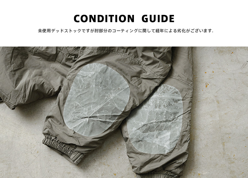 | 商品状態 | 実物新品未使用デッドストック ※実物新品未使用デッドストックですが、肘のコーティングは入荷時からひび割れが見られます。また、エルボーパッチの形状や状態には個体差があります。色合いには個体差があり、製造メーカーの違いでジッププルやタグ、ベルクロのデザイン、細部の仕様が異なります。商品の状態についてご指定頂くことは出来ませんので予めご了承ください。 |