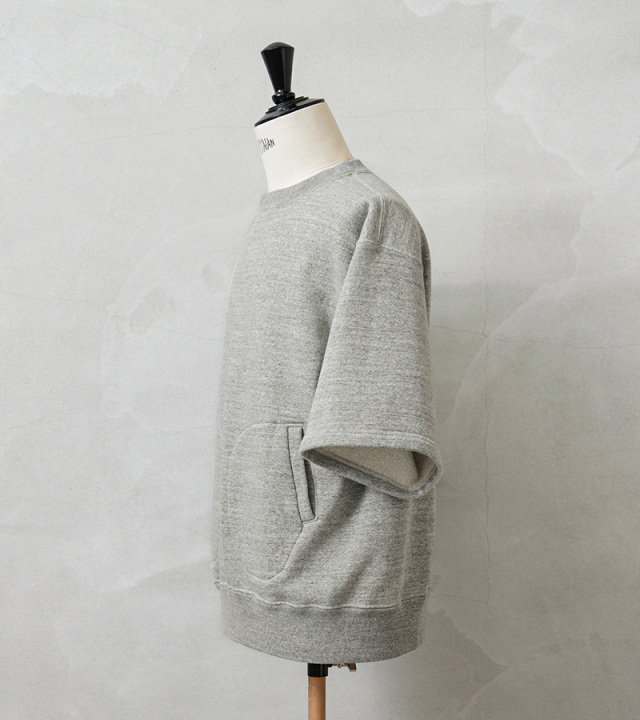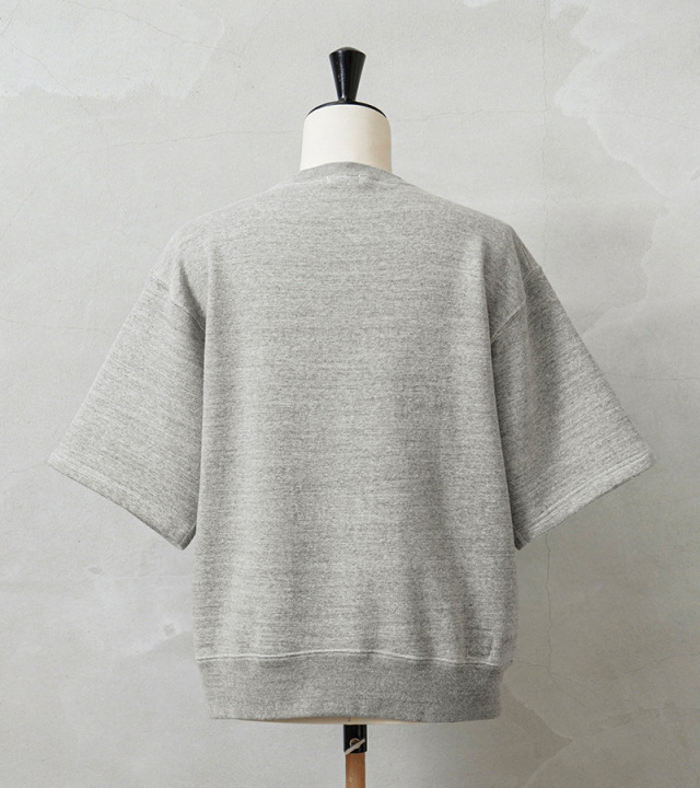 A.G.SPALDING&BROS ハーフスリーブ スウェットシャツ 日本製のご紹介です。 品番:SPL-AGS-951002 和歌山県内のみでしか存在しない希少な吊り編み機によって編み立てられた裏毛生地を使用。テンションをかけず空気を含みながらゆっくりと編み、編み上がった生地も強制的に巻き取らないことで肌触りがふんわりした、まるで手編みのような仕上がりになります。現在の高速機には出せない柔らかな風合いは洗濯を繰り返しても型崩れを起こしにくく、身体にどんどん馴染んでいくので長く愛用していただけます。 首周りと裾には長めのリブをデザインし、胴体部分はサイドの縫い目がない丸胴仕上げなので縫い代が肌に当たらずストレスフリーで上質な着心地です。そしてアイコニックなボクシンググローブ型のポケットに、現代のスタイルでの着用を前提としたゆったりとしたシルエットはスタイリングしやすく仕上げています。 アイコンディテールであるボクシンググローブがアクセントになったデザインと、希少価値の高い日本の技術を贅沢に使ったハイクオリティなアイテムです。 MADE IN JAPAN |
