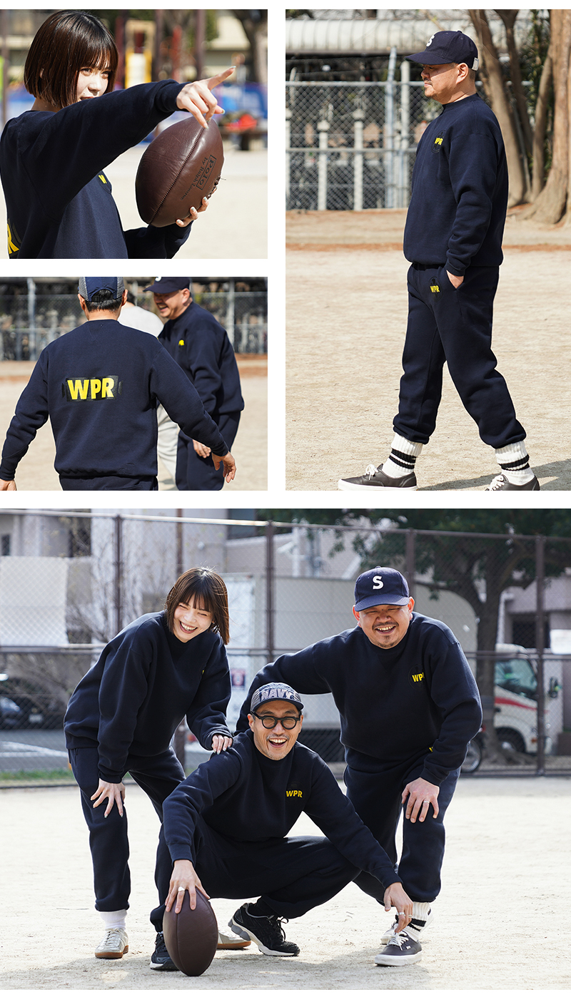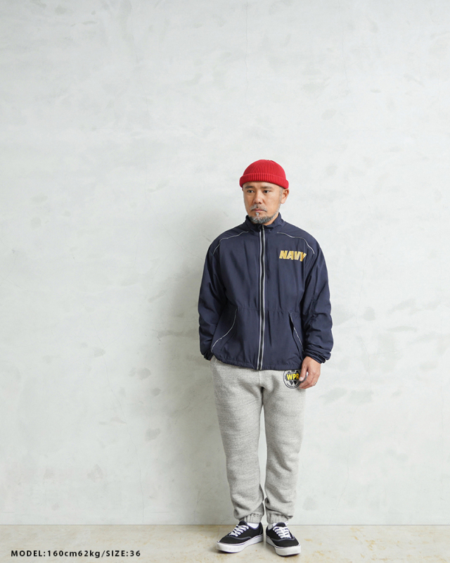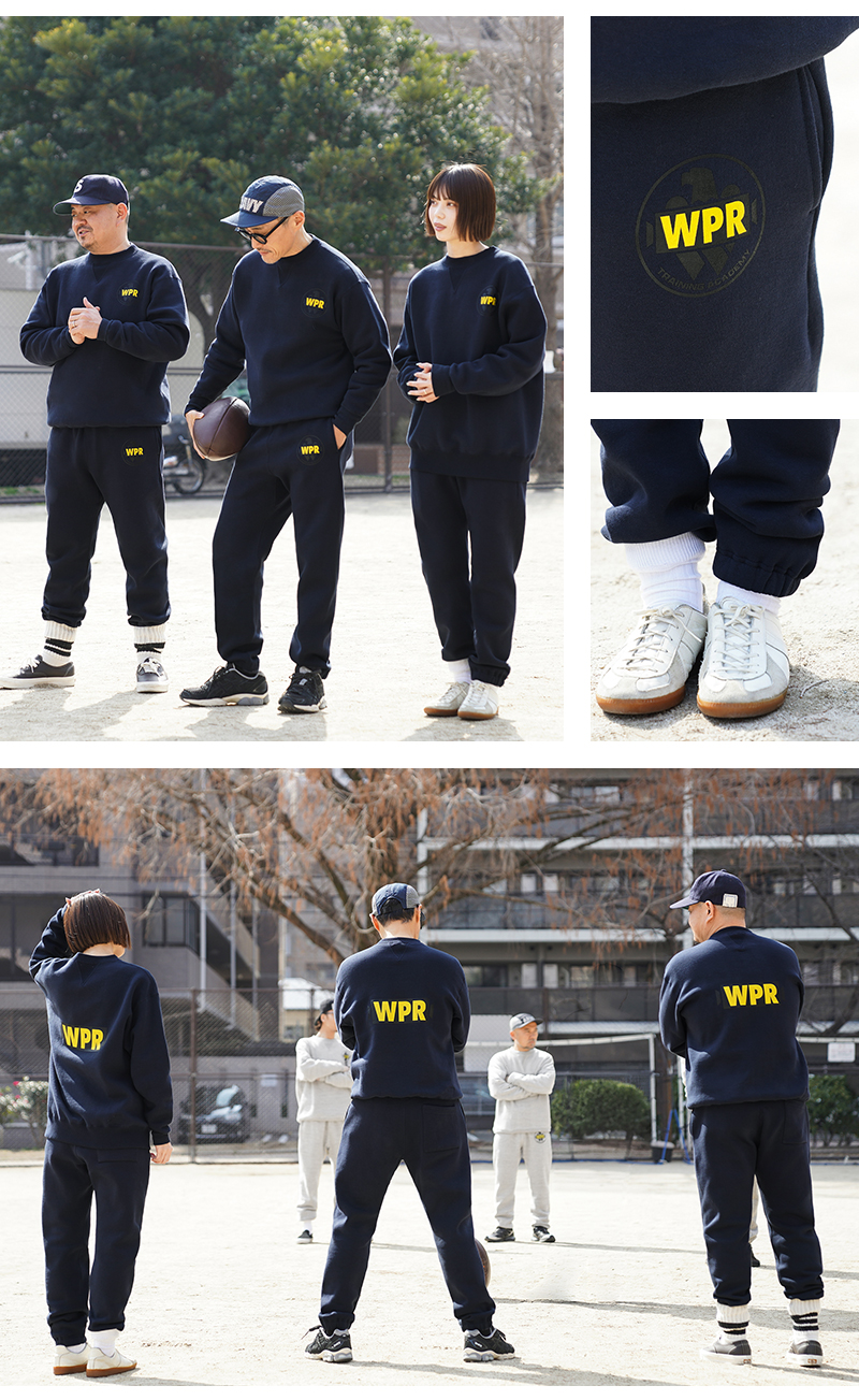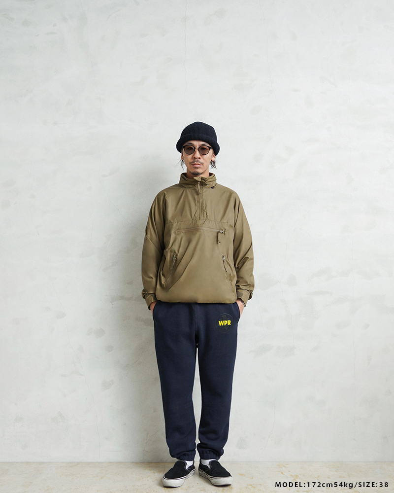 架空のWAIPER士官学校を設立。 この学校のアーミーとネイビーの生徒たちでのスポーツ大会をテーマに、A BATHING APE®の元グラフィックデザイナーで、現在はアートディレクターやHIROCK DESIGN OFFICEを主宰するアーティストハイロック(HIROCK)さんにグラフィックを作ってもらったスペシャルな別注です! ウエスト周りと裾はゴムシャーリングで適度に伸縮し、容易に調節ができるドローコードがウエストに配置されています。両サイドのハンドポケットに加え、ヒップの片パッチポケットはアーカイブに存在するセパレートポケットパーカの左から右に傾いている独特なディテールを踏襲。