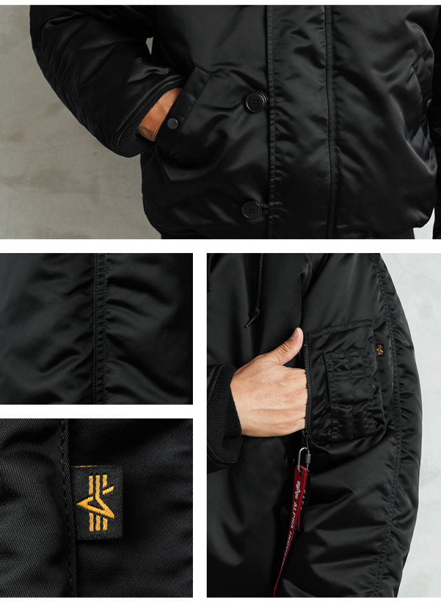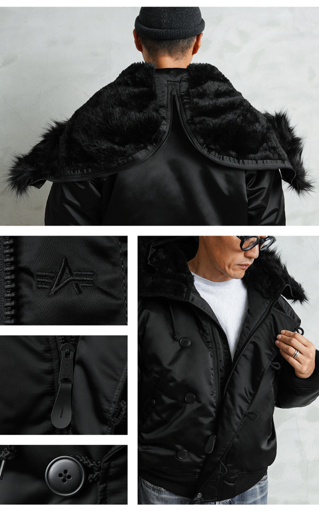 今回作成した別注N-2Bはディテールや存在感を踏襲しつつ、ファーも含めてオールブラックに仕上げることでオリジナルとはまた違ったシックで深みのある雰囲気を楽しめるデザイン。ボディの表地には、世界でもっとも古い歴史を持つ化学繊維“ナイロン66”ツイルを再現したファブリックを使用。