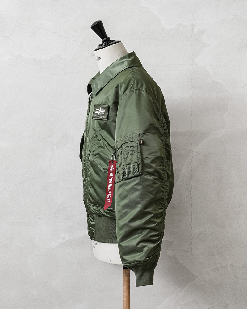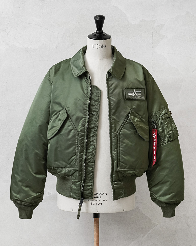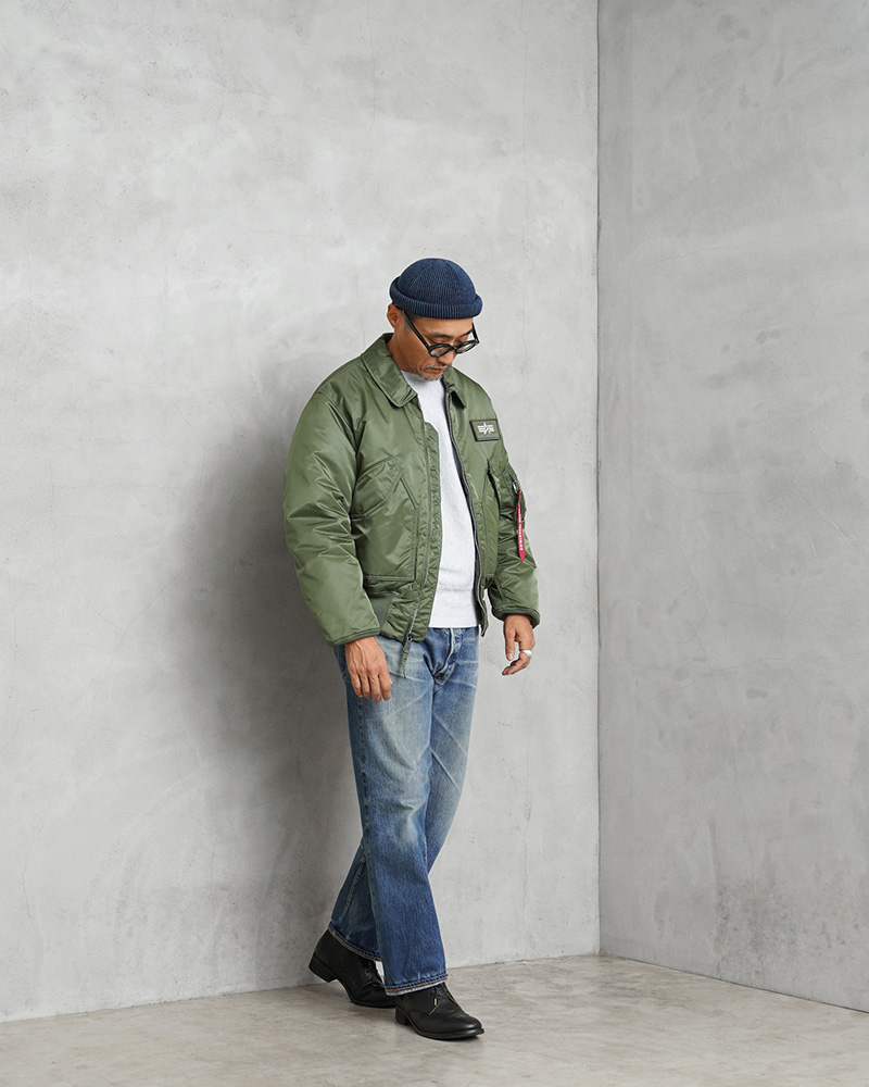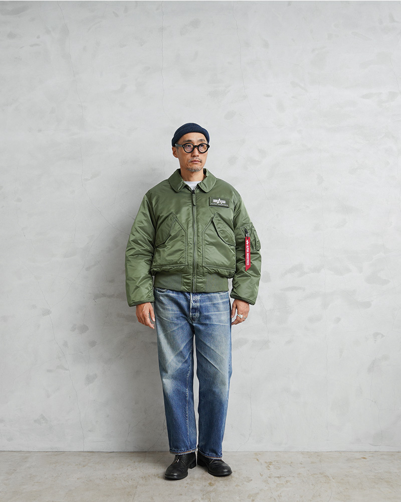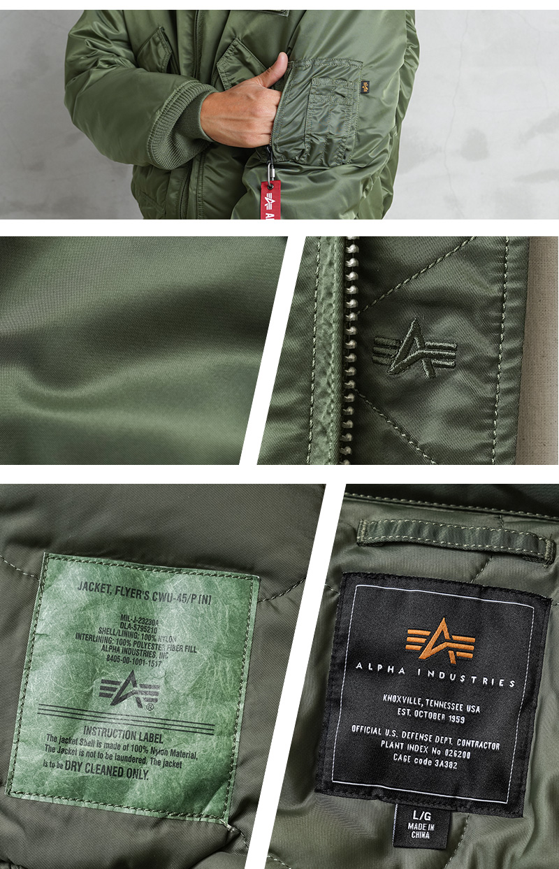 MA-1の後継モデルとして、現在までアメリカ陸・海・空の三軍および海兵隊において正式採用された現行型フライトジャケット“CWU 45/P”が、伝統を継承する本国規格の「ALPHA INDUSTRIES」より登場しました。CWU 45/Pは、MA-1と同様にインターミディエイトゾーン(-10~10℃)用としてアメリカ軍に正式採用されており、防寒性抜群。リブ仕立ての襟と袖口、斜めにカットされたフロントポケット、左上腕部のジッパー付きユーティリティポケット、気分やコーデの雰囲気に合わせて着脱可能なレッドタグが特徴的です。ミリタリーアイテムとしてのクラシックな雰囲気や機能性はそのままに、幅広いアイテムに合うよう仕上げられています。見た目だけでなく防寒性と機能性に富んだジャケットは、定番アウターとして備えて置きたい一着です。