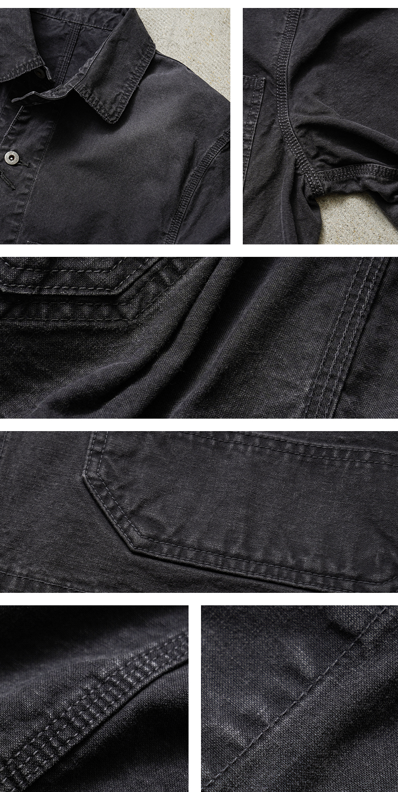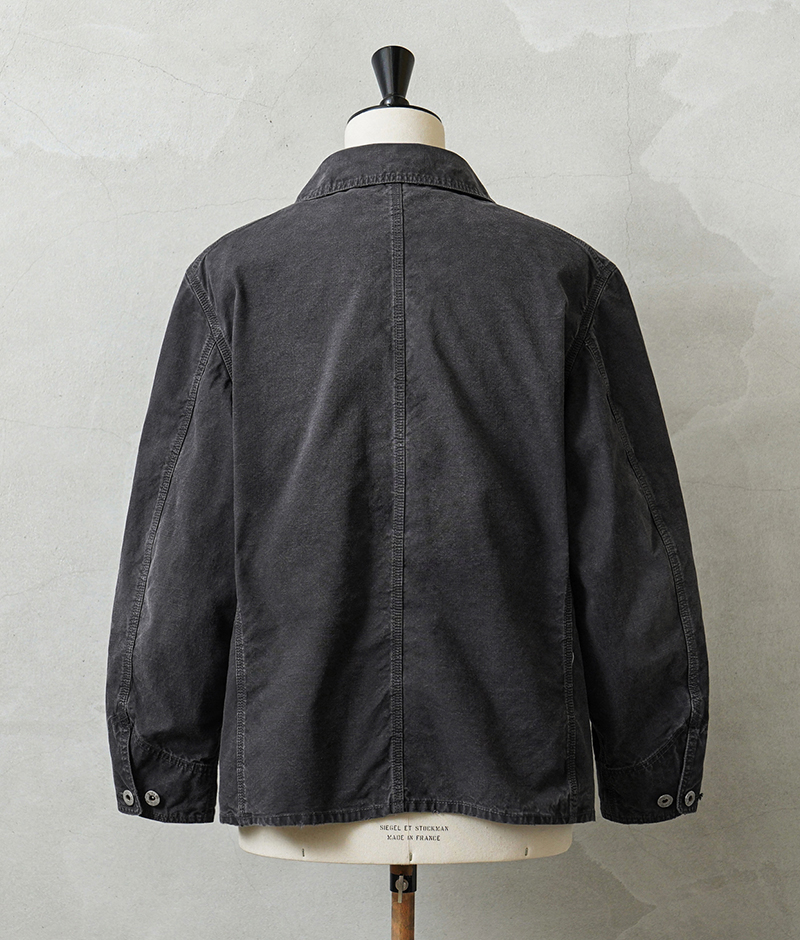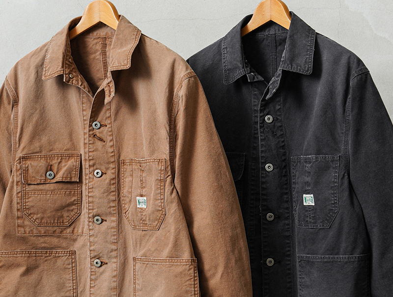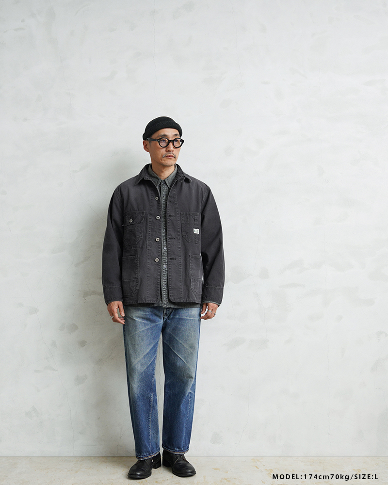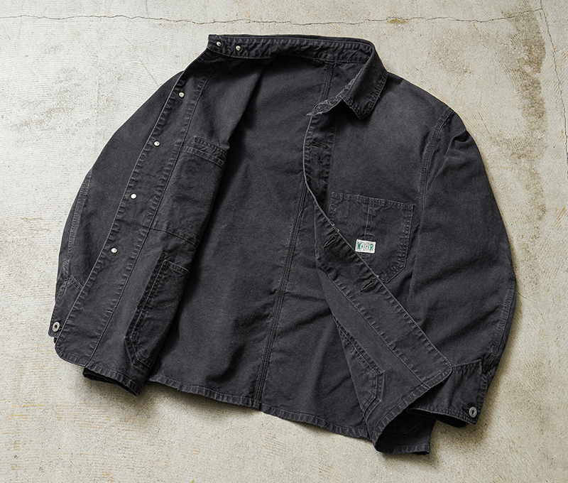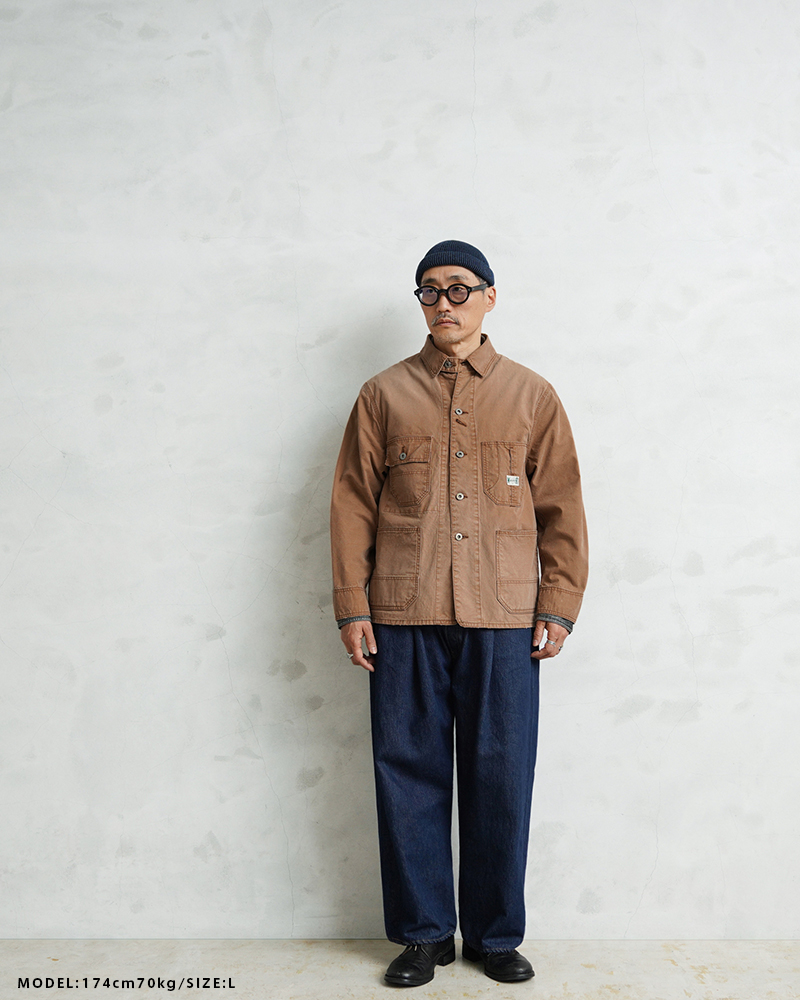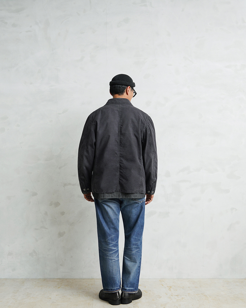 ベースにしたのは、1940年代のアメリカンワークウェア。 無骨なディテールを活かしながら、現代のライフスタイルに合わせてシルエットやバランスを再構築しています。 そしてこのモデルの大きな特徴が、生地。 採用したのは、日本の老舗生地メーカーによる特別なダック素材です。 縦横ともにムラの強い14番手のムラ糸を使用し、 ワークウェアらしい表情を引き出しやすい2/1ダック織組織で仕上げています。 さらに染色には硫化染めを採用。 これにより、着用を重ねるごとにヴィンテージのような経年変化を楽しめる素材になっています。 高密度に打ち込まれた生地は、中肉ながらしっかりとした存在感と耐久性を備えています。 そして縦糸を2本引き揃える構造にすることで、単調になりがちなダック生地に立体感と奥行きをプラス。