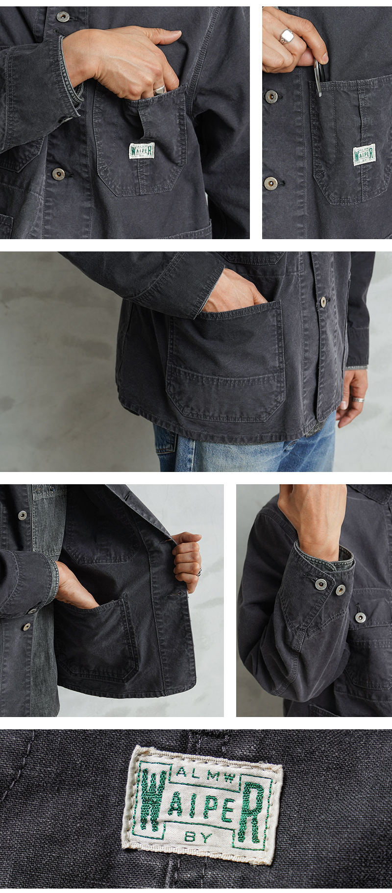| 商品説明 | ALMW by WAIPER Duck Canvas Chinstrap Chore Jacket のご紹介です。 品番:WILA-DCCJ ダック生地のカバーオールといえば、無骨でヘビーなものがほとんど。 それはそれで魅力なのですが、日常で気軽に羽織るには少し構えてしまうのも事実です。 「ダック生地で、シャツのように羽織れるワークカバーオールがあったら面白いのでは?」 そんな発想から、この一着は生まれました。 ベースにしたのは、1940年代のアメリカンワークウェア。 無骨なディテールを活かしながら、現代のライフスタイルに合わせてシルエットやバランスを再構築しています。 そしてこのモデルの大きな特徴が、生地。 採用したのは、日本の老舗生地メーカーによる特別なダック素材です。 縦横ともにムラの強い14番手のムラ糸を使用し、 ワークウェアらしい表情を引き出しやすい2/1ダック織組織で仕上げています。 さらに染色には硫化染めを採用。 これにより、着用を重ねるごとにヴィンテージのような経年変化を楽しめる素材になっています。 高密度に打ち込まれた生地は、中肉ながらしっかりとした存在感と耐久性を備えています。 そして縦糸を2本引き揃える構造にすることで、単調になりがちなダック生地に立体感と奥行きをプラス。 フラットではない、どこか表情のある生地感。 これがこのジャケットの大きな魅力です。 もう一つこのカバーオールに欠かせないのが、経年変化。 理想の経年変化を表現するために、何度もUSED加工を重ねました。 ディテール面では、30~40年代のヴィンテージカバーオールに見られるチンストラップを採用。 襟を立てたスタイルも楽しめるクラシックな仕様です。 シルエットは、無骨なワークジャケットの雰囲気を残しつつも、 厚手のダックジャケットのような重さを感じさせないバランスに調整。 まさにシャツ感覚で羽織れるダックカバーオール というコンセプトを体現した一着です。 アメリカンなタフさを引き出すのも良し。 クラシックにまとめるのも良し。 ストリートの空気感を加えても面白い。 スタイリング次第でさまざまな表情を見せてくれる、 カバーオールです。 着る人の感性で育っていく。それが、このダックカバーオールの醍醐味です。 ※USED加工は職人による手作業で行われているため、1点ごとに表情が異なります。 ※お届けする商品につきまして商品画像とは異なる部分(色味、スレ具合)、小さな穴、ダメージもある事をご理解下さいませ。 また、サイズに関しましても製品加工を施しているため、SIZE SPECと多少の誤差がございます。商品の味としてお楽しみください。 ※数量限定での受注生産となります。期間内でも予定数に達し次第終了となりますのでご了承ください。 |