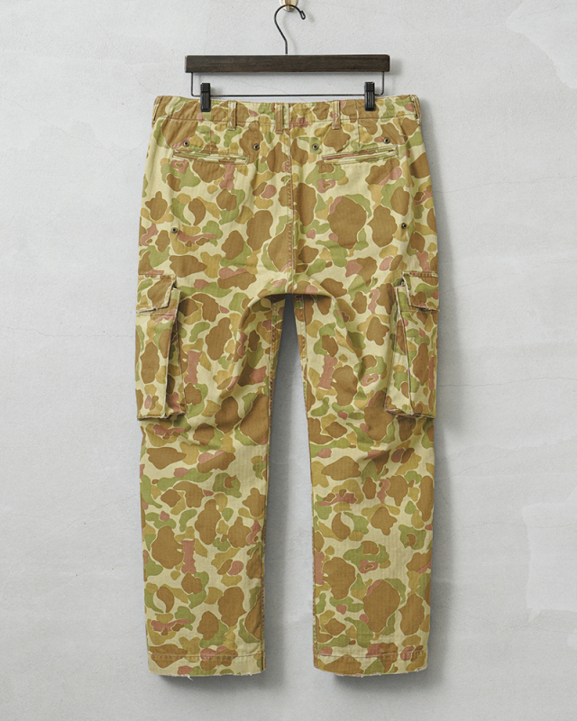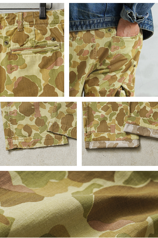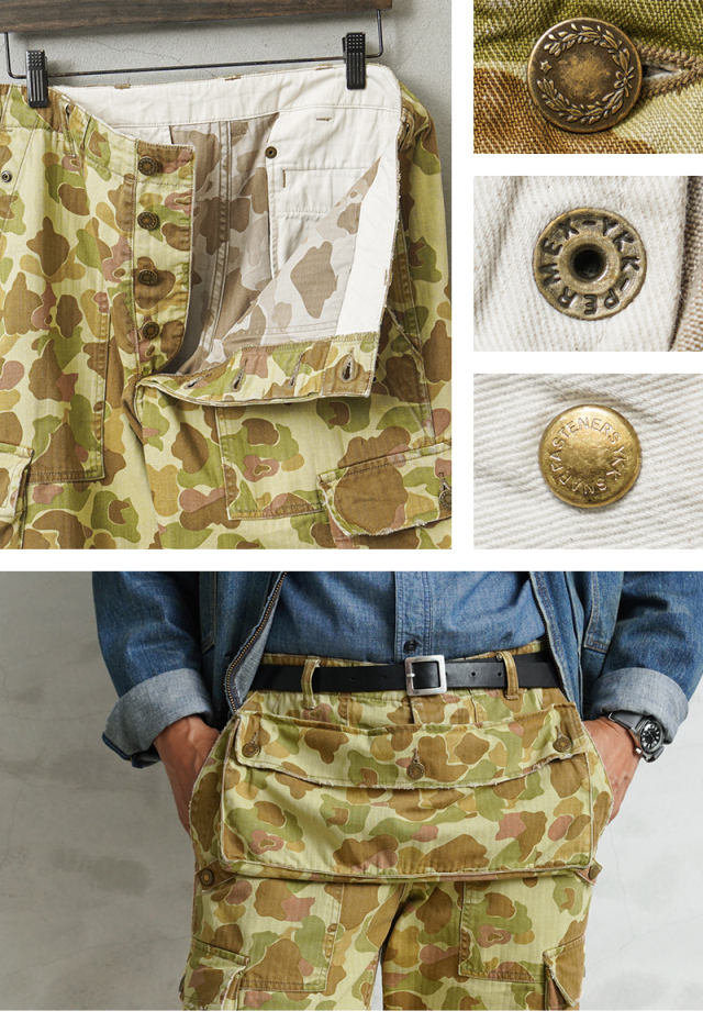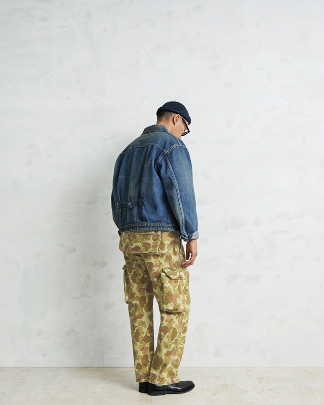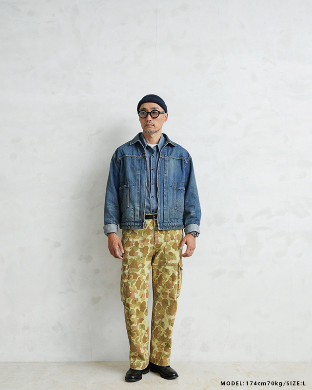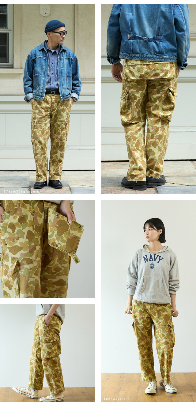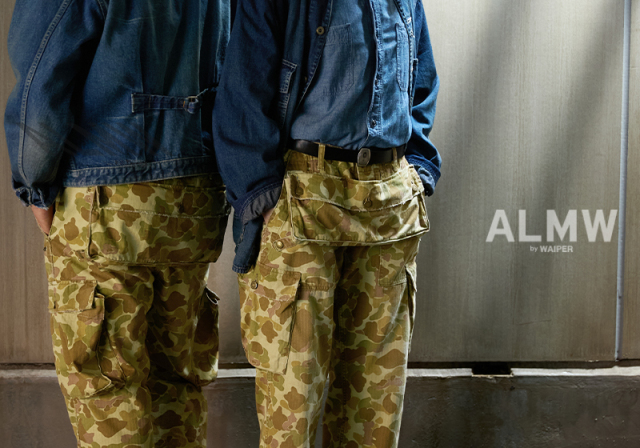 | 商品説明 | ALMW by WAIPER USMC MONKEY APRON TROUSERS DUCK HUNTER CAMO MADE IN JAPAN 品番:WILA-DMA 1940年代、アメリカ海兵隊で使用されていた「M-44トラウザーズ」をALMWの感性で再構築。 今作では、生地に米陸軍が実際に使用していた“ダックハンターカモ”のヘリンボーンツイルを採用し、さらに職人によるダメージ加工を施した、特別仕様の1本に仕上がりました。 この生地は、1943年にM-1942ジャングルワンピースとして正式採用されたのち、1944年には廃止。しかしその後、M-1942 CAMOユーティリティーコートなどに転用され、ビーチでもジャングルでも通用する汎用性の高さから評価された、歴史的背景を持つ実戦仕様のファブリックです。 顔料で両面にプリントされたカモ柄は、ビーチからジャングルまで対応する汎用性を前提にデザインされており、ヘリンボーンツイルの独特な表情が武骨さの中に上品さを宿します。 さらに、今回は一本一本職人の手作業による“ダメージ加工”を追加。最初からこなれた風合いを楽しめる一本に仕上げています。 代表的なディテールである取り外し可能なユーティリティポケットは、お尻に装着すれば王道のミリタリースタイルに。 前面に装着すれば、エプロンとしても使用可能な2WAYギミックを楽しめます。 背面にはすっきりと玉縁ポケットを配置し、カーゴパンツ本来の実用性も抜かりなし。 ややテーパードのかかったモダンなシルエットに、外側にマチを設けた大型カーゴポケット、ベイカーパンツ風のパッチポケットなど、機能とデザインの両立にも妥協なし。 レングスはもたつかず、タフさとスマートさのちょうどいいバランス感を実現しています。 ミリタリーの奥深い歴史と現代的なスタイルが交差する、唯一無二の一本。 穿き始めからこなれ感を演出し、スタイルを選ばず着まわせる万能性も魅力です。 MADE IN JAPANクオリティが光る、“ALMWらしいギミックと質感”をぜひ体感してください。 ※一点一点手作業により、加工を施すことで、リアルなエイジングを再現しております。 お届けする商品につきまして商品画像とは異なる部分(色合い、スレ具合)、穴、ダメージもある事をご理解下さいませ。 ※受注数が上限に達した場合、早期に打ち切る場合がございます。予めご了承ください。 |