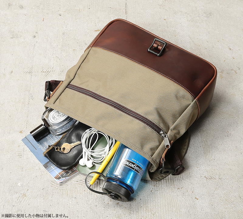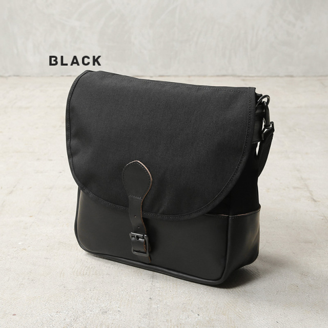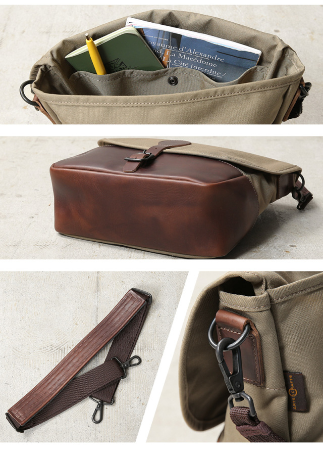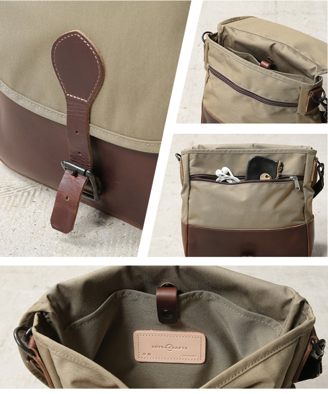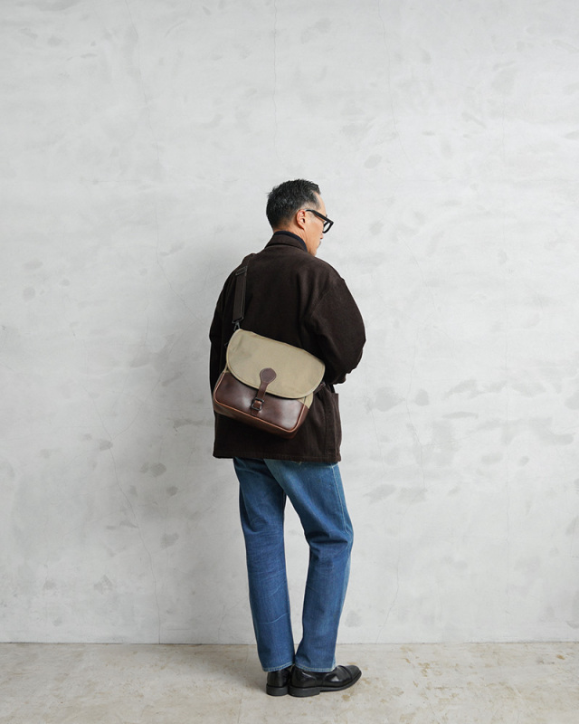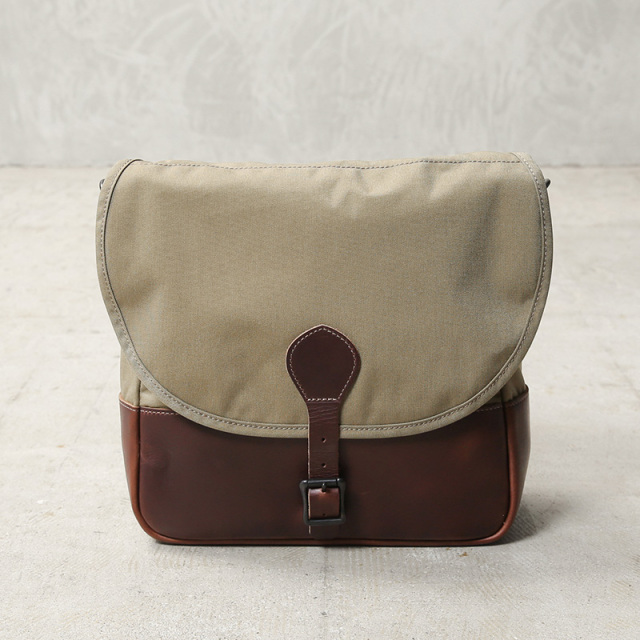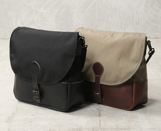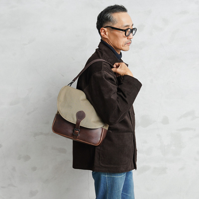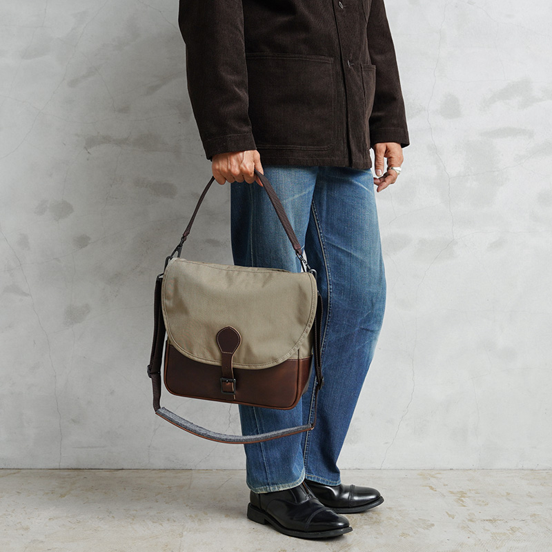 ARTS&CRAFTSより、CORDURA SPAN NYLONを使用して、ヴィンテージのハンティングバッグをアップデートしたモデルが登場。本体には、耐久性・軽量性に加え、コットンライクな独特の風合い、マットな質感が特徴のCORDURA SPAN NYLON 500デニールと、コードヴァンで有名なホーウィン社(アメリカ)のクロームエクセルレザーを採用。クロームエクセルレザーはもっともヘヴィデューティーな革。フロントのフラップ部分にはクロームエクセルレザーの美錠ベルト、フラップを開くと本体前側にファスナーポケット、メインスペースの背面には仕切りポケットがあり、口元はレザーストラップのホックで留める仕様です。