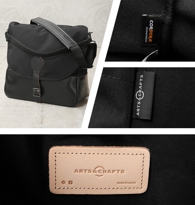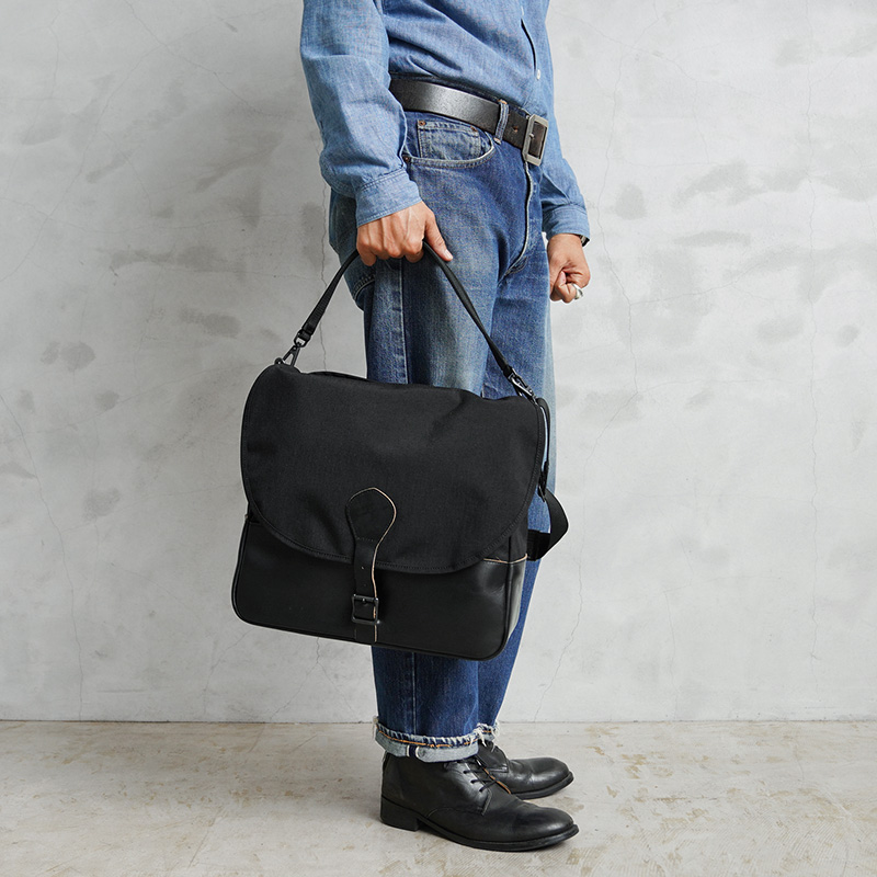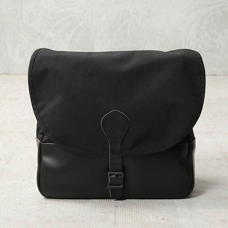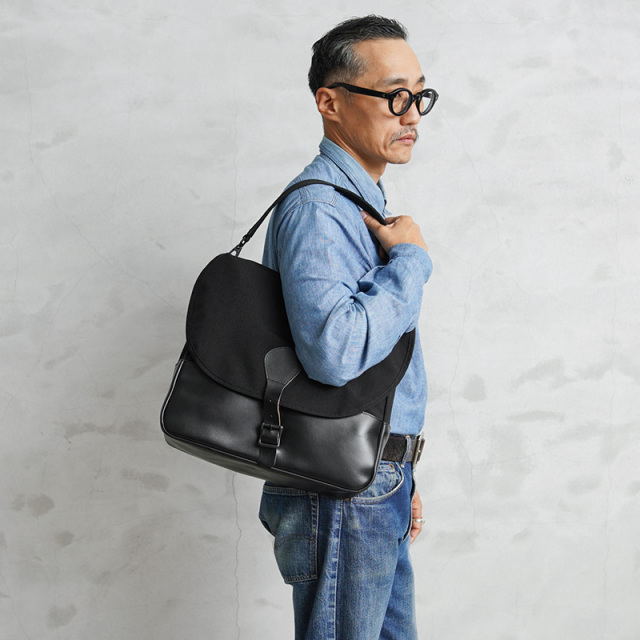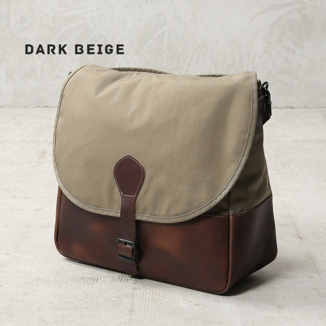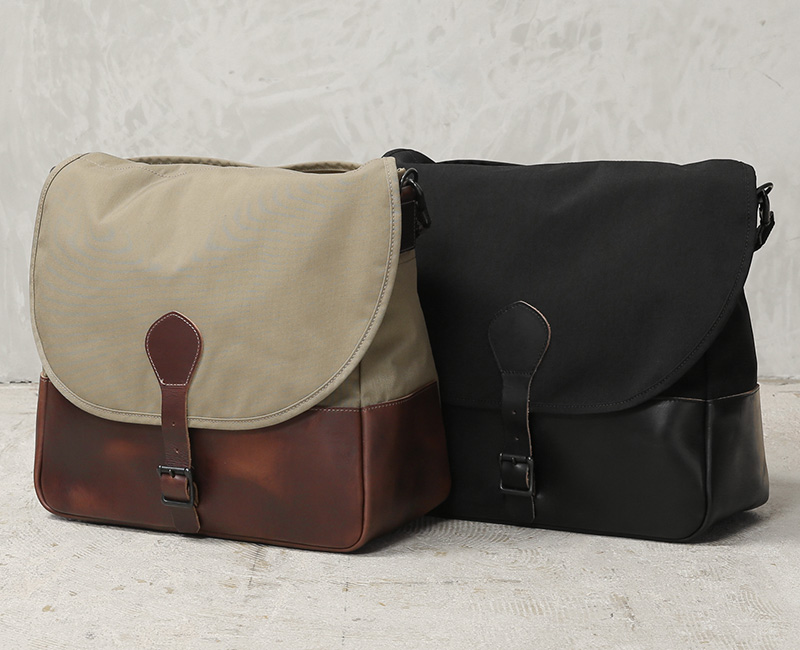 ARTS&CRAFTSより、CORDURA SPAN NYLONを使用して、ヴィンテージのハンティングバッグをアップデートしたモデルが登場。本体には、耐久性・軽量性に加え、コットンライクな独特の風合い、マットな質感が特徴のCORDURA SPAN NYLON 500デニールと、コードヴァンで有名なホーウィン社(アメリカ)のクロームエクセルレザーを採用。クロームエクセルレザーはもっともヘヴィデューティーな革。フロントのフラップ部分にはクロームエクセルレザーの美錠ベルト、フラップを開くと本体前側にファスナーポケット、メインスペースの背面には仕切りポケットがあり、口元はレザーストラップのホックで留める仕様です。