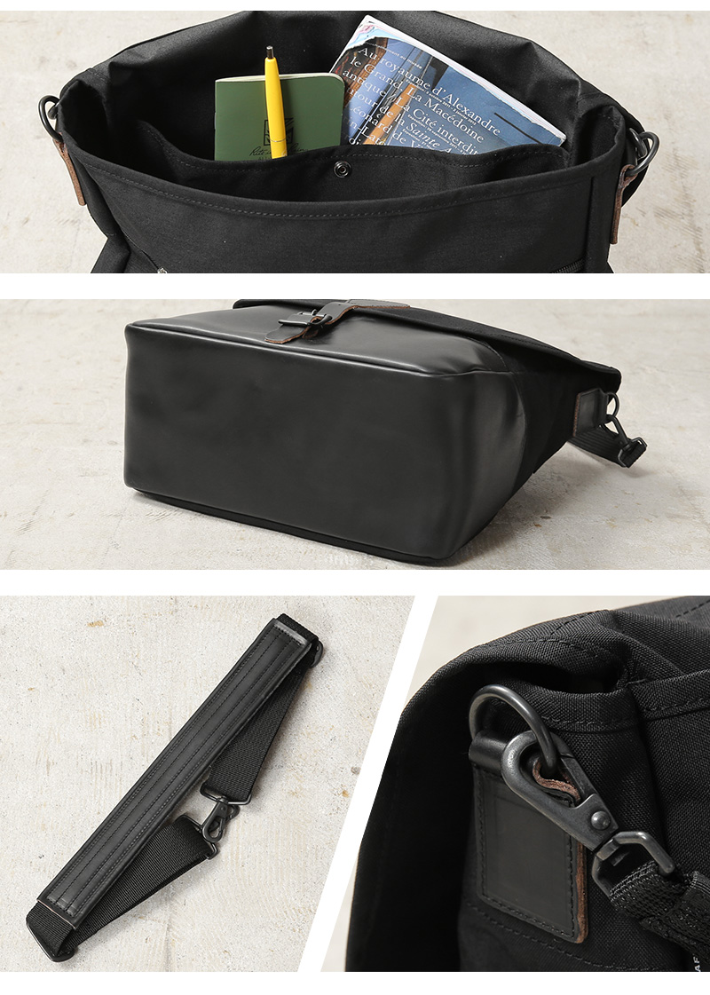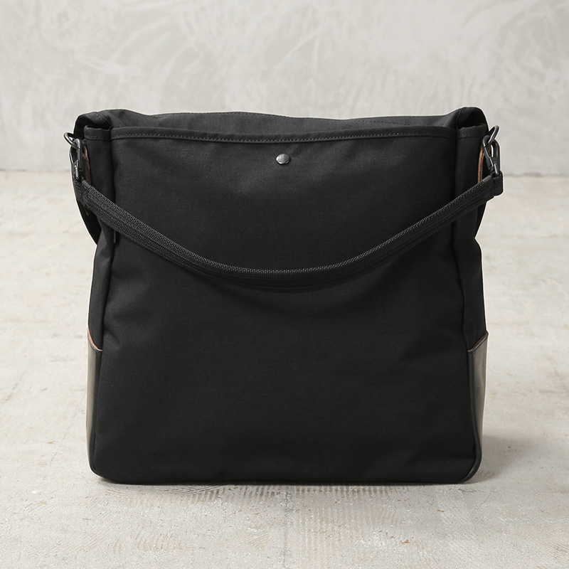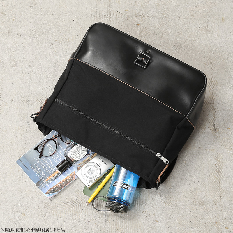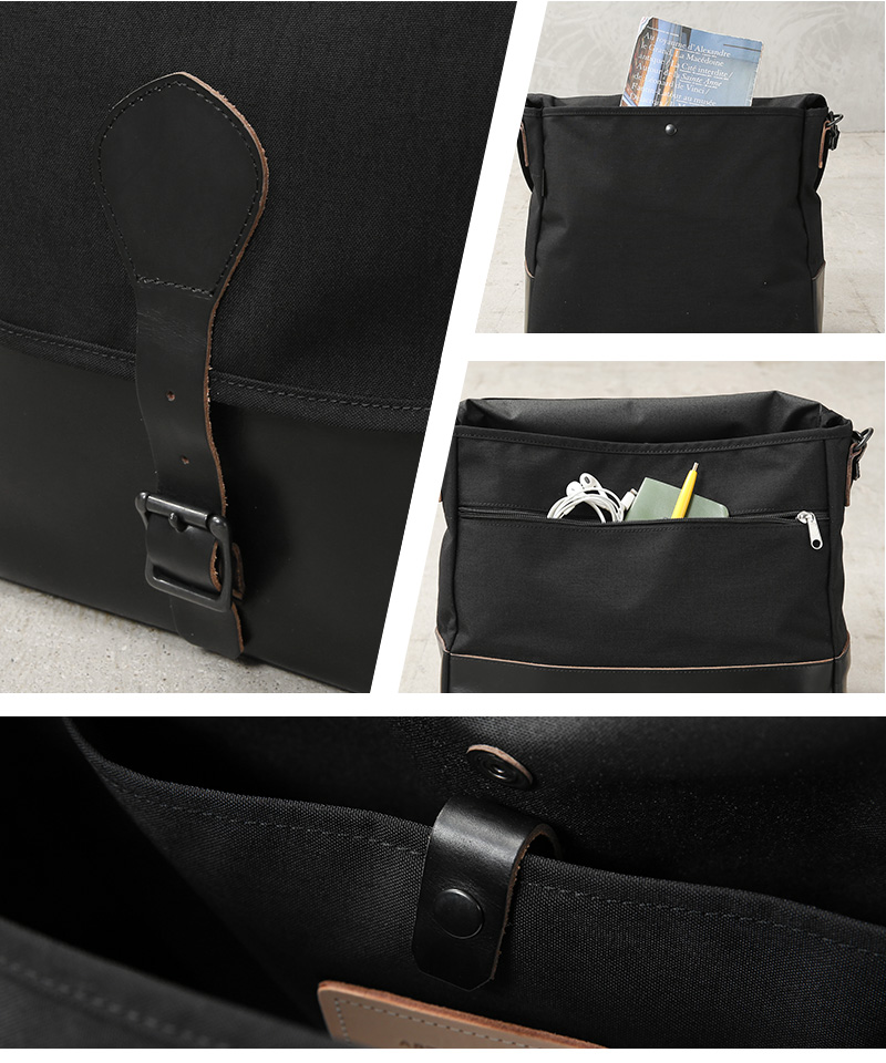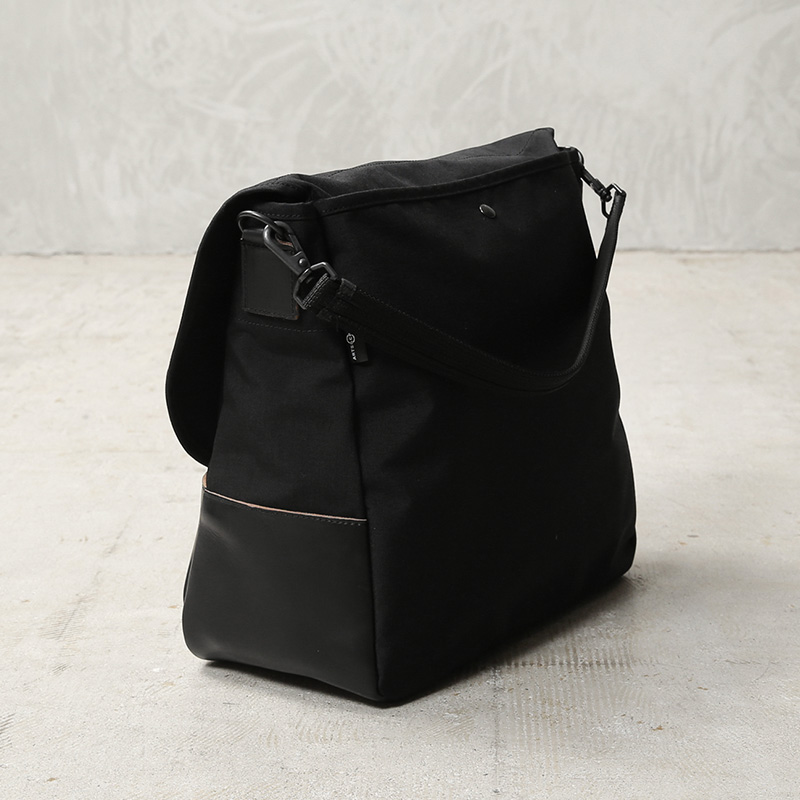 ARTS&CRAFTSより、CORDURA SPAN NYLONを使用して、ヴィンテージのハンティングバッグをアップデートしたモデルが登場。本体には、耐久性・軽量性に加え、コットンライクな独特の風合い、マットな質感が特徴のCORDURA SPAN NYLON 500デニールと、コードヴァンで有名なホーウィン社(アメリカ)のクロームエクセルレザーを採用。クロームエクセルレザーはもっともヘヴィデューティーな革。フロントのフラップ部分にはクロームエクセルレザーの美錠ベルト、フラップを開くと本体前側にファスナーポケット、メインスペースの背面には仕切りポケットがあり、口元はレザーストラップのホックで留める仕様です。
