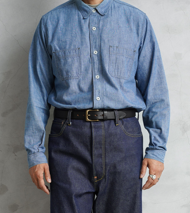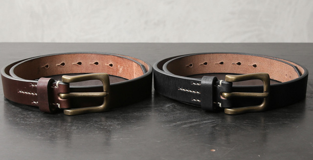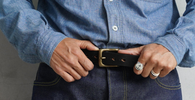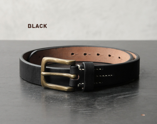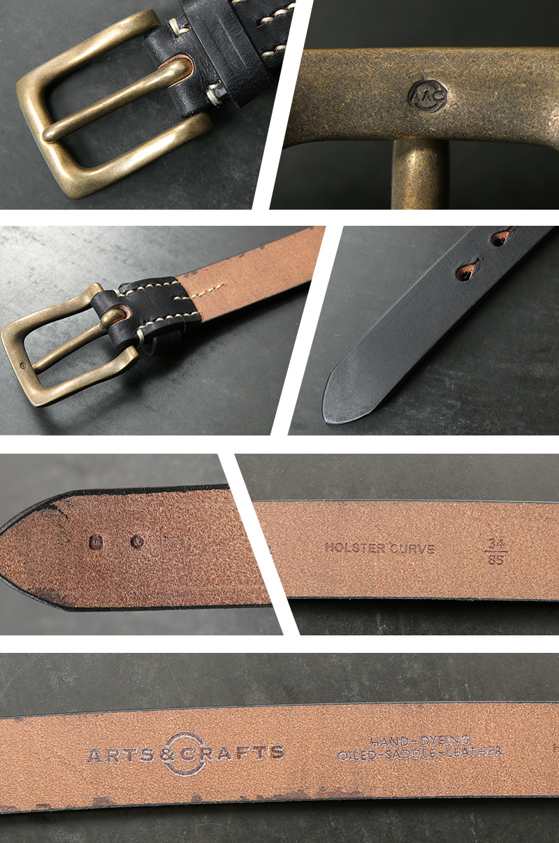 ARTS&CRAFTSより、「男が持つべき定番ベルト」をキーワードに道具的要素と無駄の無い潔さが凝縮されたレザーベルトが登場。ホルスター付きガンベルトのディティールからヒントを得た帯につけられたゆるやかなカーブは、無理なく体にフィットするよう計算し癖付けられたもの。特に重厚な革の場合、体に馴染むまでに若干の時間を要しますがカーブをつけることにより違和感なく体にフィットさせる事が出来ます。表革には馬具に使われる重厚なブリティッシュUKオイルレザーを使用。バックルはキャスト型から造り上げたオリジナルで、無垢の真鍮地に黒メッキをかけた後、バフでわざとメッキをぼかし、バックル自体をクラシックな雰囲気に仕上がっています。また、バックル留部分の飴色の麻糸は特注色で、一目ずつ丁寧に縫い込まれた熟練した職人によるハンドステッチです。