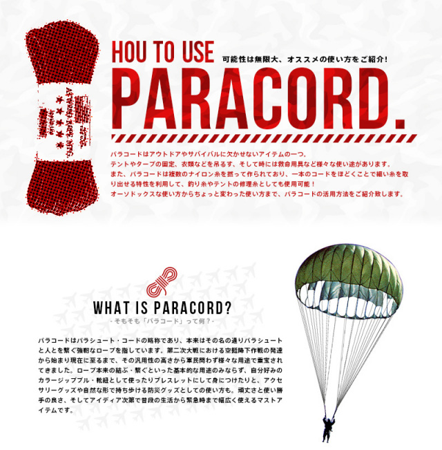 | 商品説明 | ATWOOD ROPE MFG. アトウッド・ロープ 7Strand 550Lbs パラコード 100フィートのご紹介です。 品名:Strand 550 Paracord 米軍~警察や消防にも納入しているATWOOD ROPE社のパラコードです。多種多様なロープを製造・販売している同社にとって、最もスタンダードかつカラーバリエーションが多い定番のアイテムです。 こちらのパラコードは7本のストランド(撚り糸)で構成されており、ストランドは更に3本に分けられる様になっています。テントや荷物などの固定にはもちろん、これ一本で釣り糸やテントの修理糸など幅広い用途で使用可能! ロープ専門メーカーならではの高い強度と信頼性は言うまでもなく、バリエーションが豊富なのも大きな魅力の一つ。ここまで豊富なバリエーション展開はATWOOD ROPE社だけです。いつ訪れるかわからない「もしも」の事態に備えて1つは持っておきたいアイテムです。 ・ Diameter - 5/32" (4mm) ・ Tensile Strength - 550 lb. (249 kg) ・ Weight (oz/100ft) - 8oz (227g) ・ 7 Strand Core (8 lines in 1 ) ・ Lightweight & Strong ・ Color will not run or bleed ・ UV, Rot, Mildew Resistant ・ Made in The USA パラコードとは パラコードはパラシュート・コードの略称であり、本来はその名の通りパラシュートと人とを繋ぐ強靭なロープを指しています。第二次大戦における空挺降下作戦の発達から始まり現在に至るまで、その汎用性の高さから軍民問わず様々な用途で重宝されてきました。ロープ本来の結ぶ・繋ぐといった基本的な用途のみならず、自分好みのカラージッププル・靴紐として使ったりブレスレットにして身につけたりと、アクセサリーグッズや自然な形で持ち歩ける防災グッズとしての使い方も。頑丈さと使い勝手の良さ、そしてアイディア次第で普段の生活から緊急時まで幅広く使えるマストアイテムです。 ※パラコードを束ねているラベルの変更に伴い、新旧デザインのラベルが混在しております。 複数のバージョンがあり、ラベルをお選びいただくことはできませんので予めご了承下さい。 |