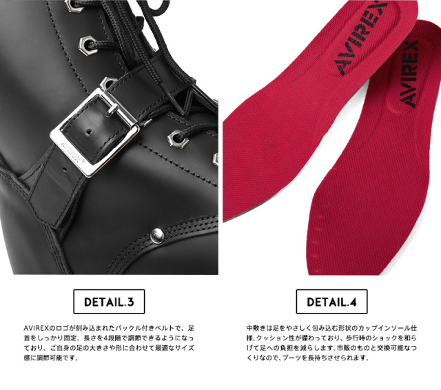 | 商品説明 | AVIREX アビレックス YAMATO サイドジップ レザーバイカーブーツ のご紹介です。 品名:YAMATO BOOTS 品番:AV2100 AVIREXより、バイカー向けにデザインされたブーツが登場! 上質なカウハイドレザーを贅沢に使用しており、実用性と質感の良さを兼ね備えた一足です。 カウハイドレザーは適度な厚みと丈夫さが特徴で、柔軟性と強度が必要なブーツにうってつけの素材です。丁寧に鞣されたレザーが放つ鈍い光沢感と、なめらかな手触りが男心をくすぐります。オーソドックスな仕上げが施されたBLACKとWINEのほか、マットで荒々しい質感に仕上げたD/BROWNの3色をご用意。本革ならではの重厚な雰囲気、そして履き込む程に味の増してゆく「自分だけの一足」感をお楽しみ頂けます。 高級靴にも採用される伝統的な“グッドイヤー・ウェルト製法”を採用。工程が複雑であるため他の製法の靴と比べてややコストが嵩みがちですが、履き心地の良さ、修理可能で長く履けることから、グレードの高いブーツ・シューズに採用されている信頼できる製法です。ソールが擦り減った場合にはオールソールと呼ばれる靴底全体を付け替える修理が可能です。 トゥにはバイクでのシフトアップ/シフトダウン操作を行う際に擦り減りやすい箇所を保護するためのシフトガード付き。側面には素早く脱ぎ履きできるサイドジッパーが設けられています。ベルクロ付きのフラップで隠れるようになっており「サイドジッパーは便利だけど見た目が…」という方も気にせずお使い頂けます。 足首に設けられたバックル付きベルトは長さを4段階で調節できるようになっており、ご自身の足の大きさや形に合わせて最適なサイズ感に調節可能です。中敷きはクッション性に優れたカップインソール仕様となっており、地面からのショックを緩和。市販のインソールと交換可能な構造ですので、ブーツを長持ちさせられます。アウトソールには車のスパイクタイヤのように大きめのパターンを持つラグソールを採用し、高いグリップ力を発揮!履き口の後ろには、ブーツの脱ぎ履きを楽に行えるプルタブが設けられています。 強度が必要な箇所はダブルステッチやトリプルステッチで縫い上げられており、縫製に関しても頑丈に仕上げられています。また、シューレースを通すアイレットや革を留めるリベットなど、細部のディテールに関してもひとつひとつ丁寧に仕上げられており、当店で取り扱っているフットウェアのなかでも屈指の販売数と高い評価を誇るアイテムの一つ。自信を持ってお勧めできる一足です。 当店はAVIREX正規販売店ですので安心してお買い求め下さい。 |