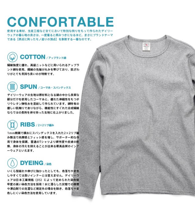 | 商品説明 | AVIREX アビレックス デイリーウエア 長袖クルーネックTシャツのご紹介です。 カラダのシルエットにやさしくフィットする、ストレッチ性に優れた素材を使用したデイリーウェア。使用する素材、生産工程など全てにおいて特別な拘りをもって作られたデイリーウェアの着心地の良さは、一度着ると病みつきになるほど。まさにブランドテーマである【原点に拘ったモノ造りの頂点】を象徴する一着なのです。 生地には耐久性に優れ洗濯しても伸びにくいリブ素材を採用し、「デイリーウェア」の名に恥じないタフさを実現!単体ではもちろんの事、インナーにも使えるユーティリティーウェアとして何枚あっても困らない究極の定番アイテムです。ただシンプルなだけじゃない、それがいつまでも人気で在り続ける理由なのです。 COTTON/アップランド綿 繊維強度に優れ、高級ニットなどに用いられるアップランド綿を使用。繊維の先端が丸みを帯びており、肌ざわりがとても気持ち良いのが特徴です。 SPUN/コーマ糸・スパンデックス デイリーウェアの生地は原材料となる綿の中から良質な部分だけを使用したコーマ糸と、優れた伸縮性をもつポリウレタン弾性糸を混紡して作られています。綿特有の優しい肌触りでありながら、機能性にすぐれた合成繊維ならではの長所を併せ持った生地に仕上がりました。(組成:綿95%、ポリウレタン5%) RIBS/2×2リブ編み 1mm間隔で横糸にスパンデックスを入れた2×2リブ編み製法で肉厚感とフィット感を増し、サポーター的な作用で身体を保護。普通のTシャツより疲労度や皮膚の乾燥、身体の冷えを抑えることが出来る最高品質のインナーウェアといえます。 DYEING/染色 いくら型崩れや伸びに強かったとしても、色落ちや変色しやすくては良いインナーとは言えません。デイリーウェアは日本工業規格(JIS)によって定められた染色堅牢度の高い染色方法を採用!水に濡らした状態での摩擦や漂白剤での洗濯など規定外の場合を除き、色落ちや変色しにくい染色方法を使用しています。 当店はアビレックス正規販売店です。安心してお買い物をお楽しみ下さい。 注意事項 ※1 メーカーの生産の都合上、現在襟元のタグが異なる場合がございます。 ※2 タグについてはお選びいただけないことをご了承下さいますようお願い致します。 |