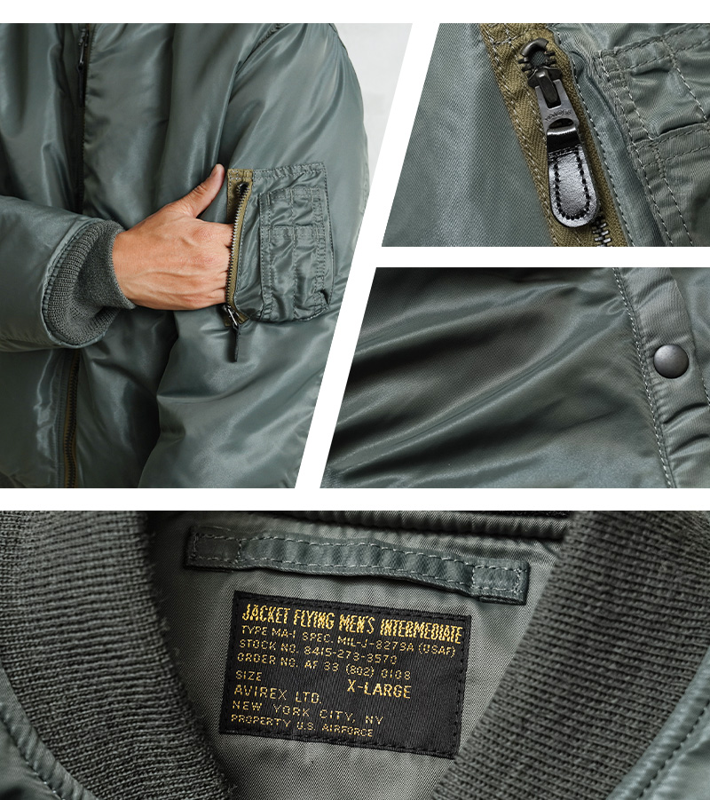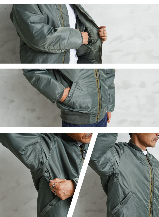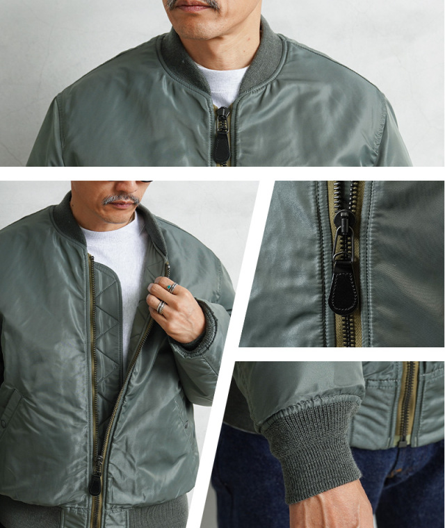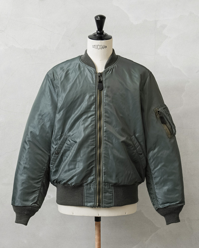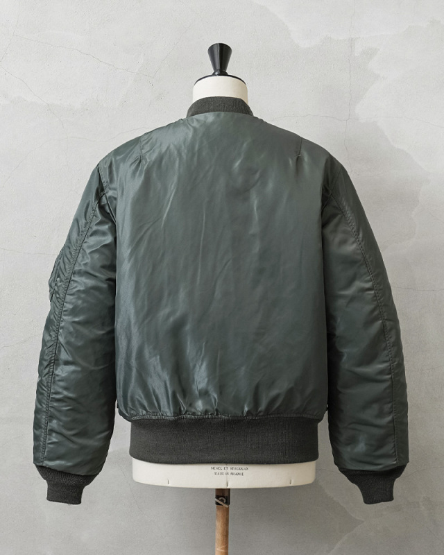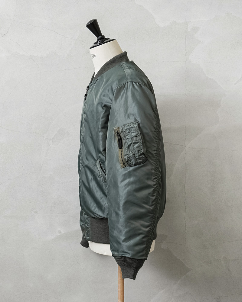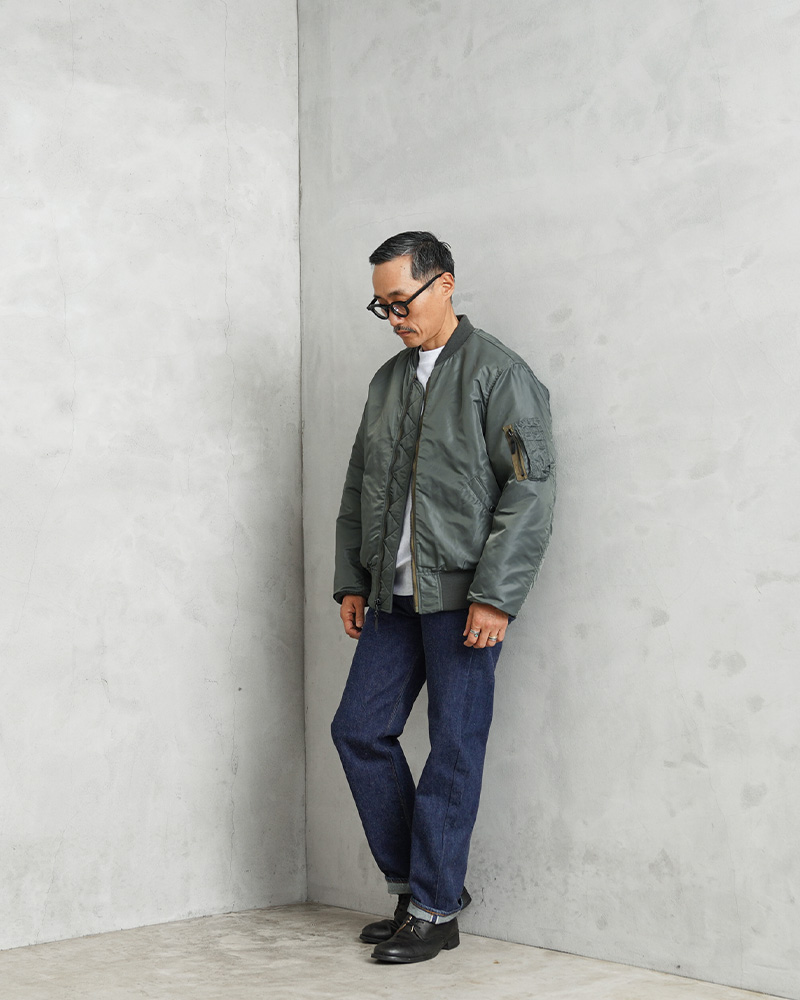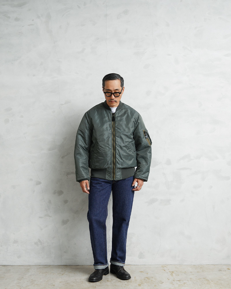 50年代に前身のB-15からボディーをナイロン素材に統一したのがMA-1。30年近い現役の中で、ライナーがオレンジのリバーシブルや、フロントポケットにフラップが付くなど、トータル6回のスペック改編が行われた大定番フライトジャケットです。MIL-J-8279Bの前期と中期の間の1959年モデルにクローズアップしたフラッグシップな一着。3rdモデルは両脇のドットボタン開閉式ICSコード用ループがついていないタイプが主流ですが、こちらは3rdモデルでも希少なループ付きのモデルを再現。