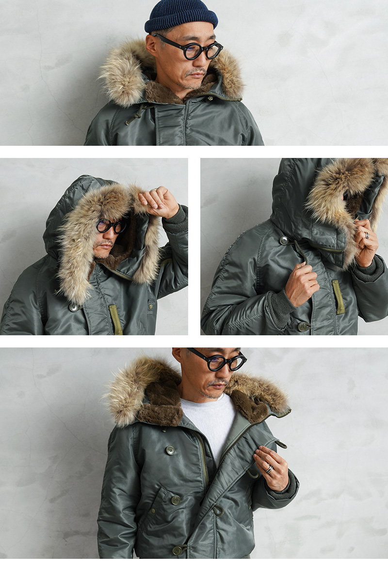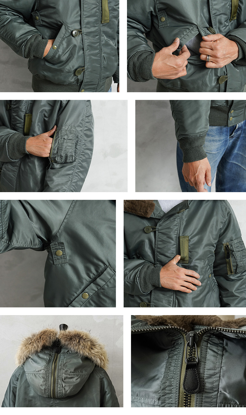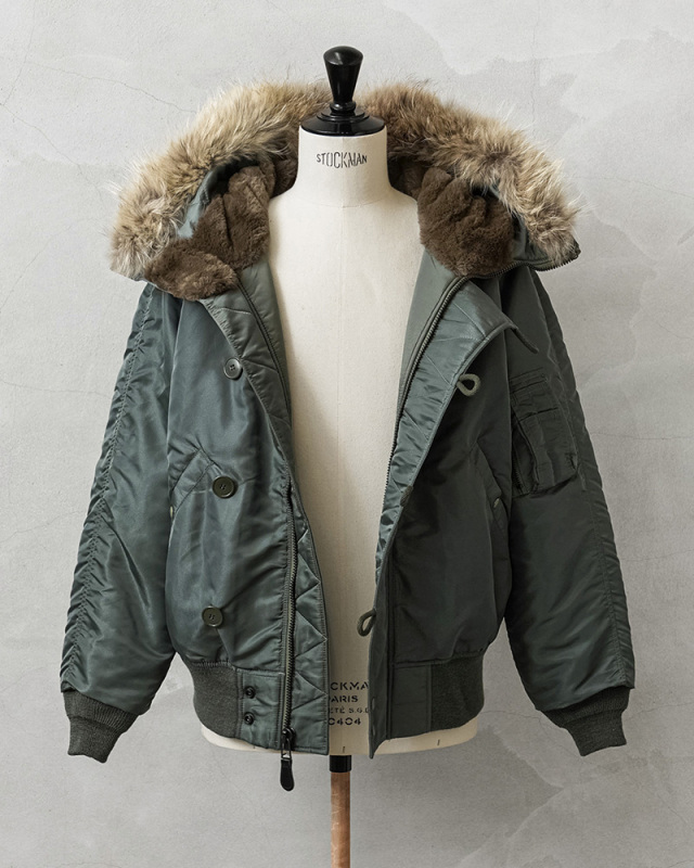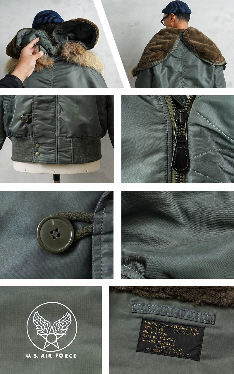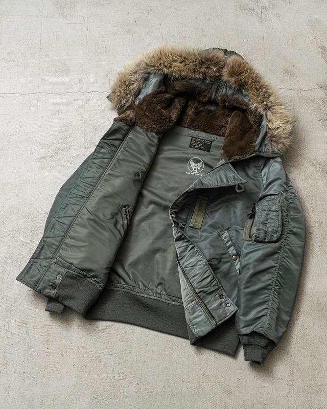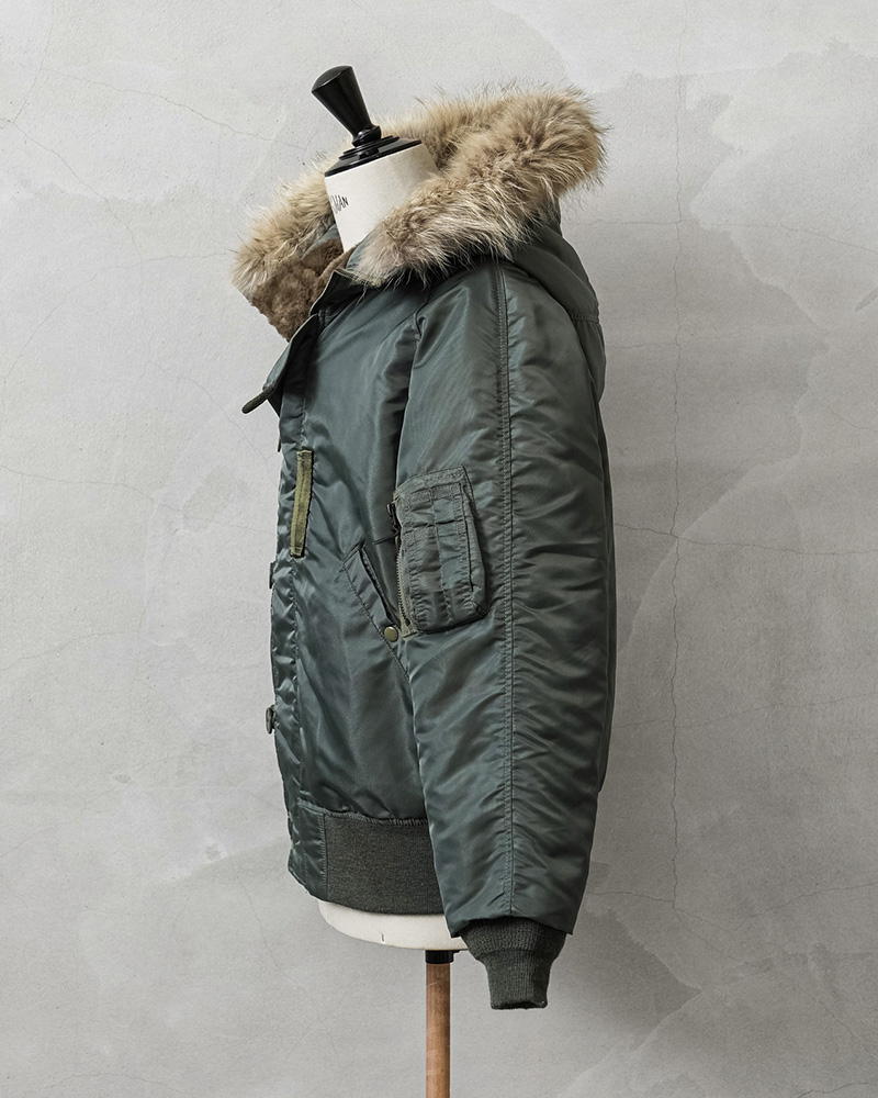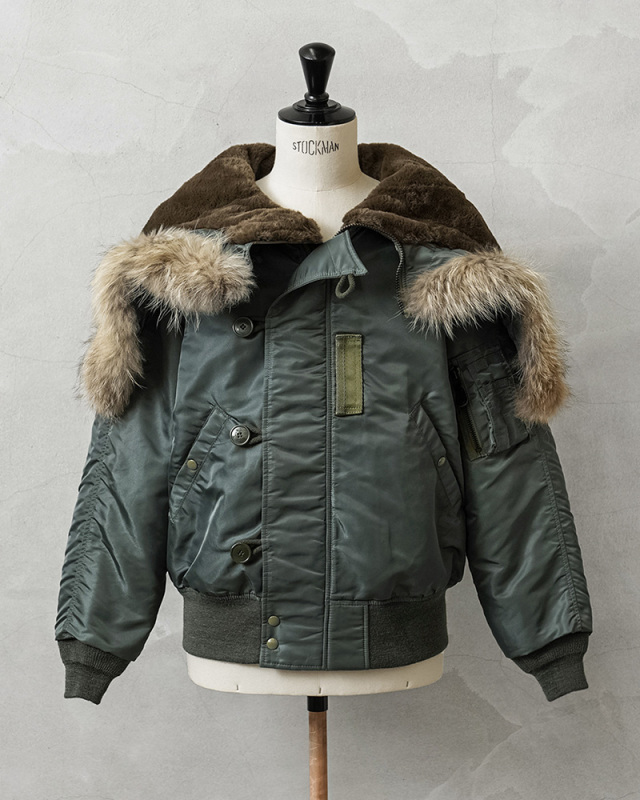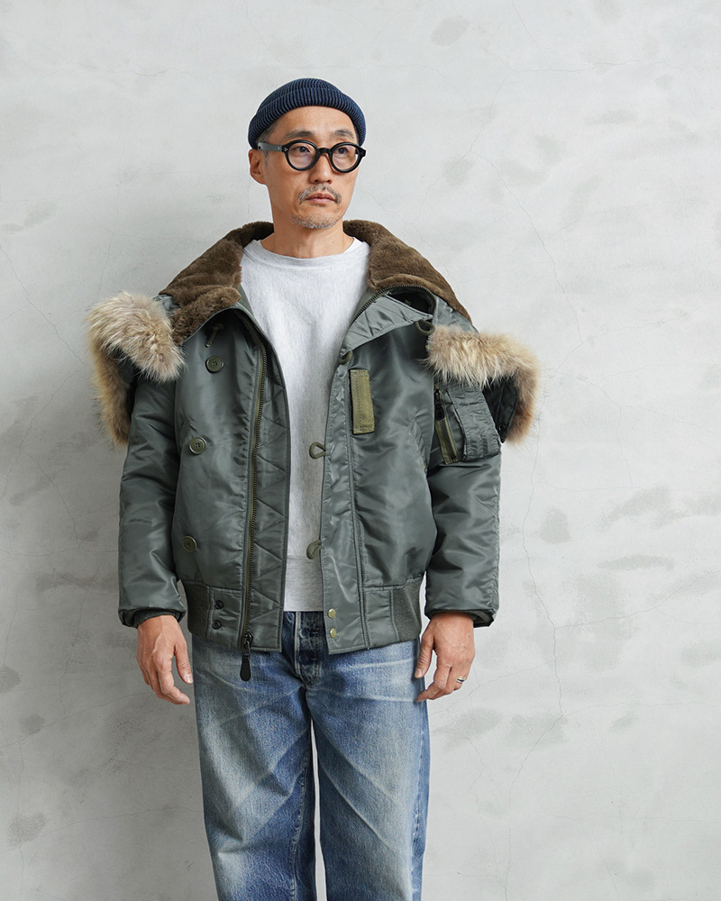 1950年代初期にヘビーゾーン(-10℃~-30℃)用のフライトジャケットとして開発されたN-2シリーズ。U.S.A.F.(米国空軍)の指定色エアフォースブルーのN-2A。そのエアフォースブルーが戦闘時に目立つことや高空での太陽光線吸収という問題点を解決するために改良を加えられたのがN-2B(SPEC.MIL-J-6278D)です。胸元の酸素マスクホース固定用のオキシジェンタブが特徴的な初期型の仕様を見事に再現した一着。ヴィンテージ仕様のジッパーやウール100%のリブなど細部に至るまでこだわった至極の逸品です。