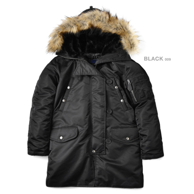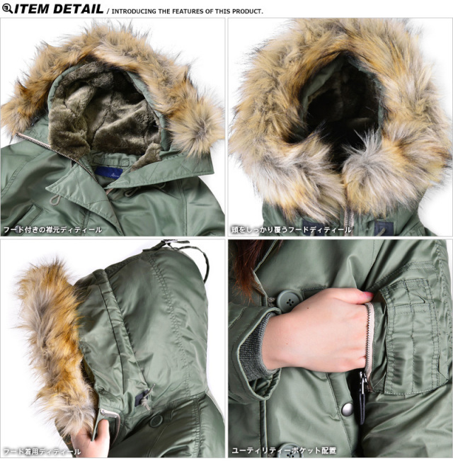 | 素材 | 表地:ナイロン100% 裏地:ポリエステル100% 中綿:ポリエステル100% リブ:アクリル70%、毛30% フード裏:アクリル50%、ポリエステル50% ファー部分:アクリル92%、ポリエステル8% |
