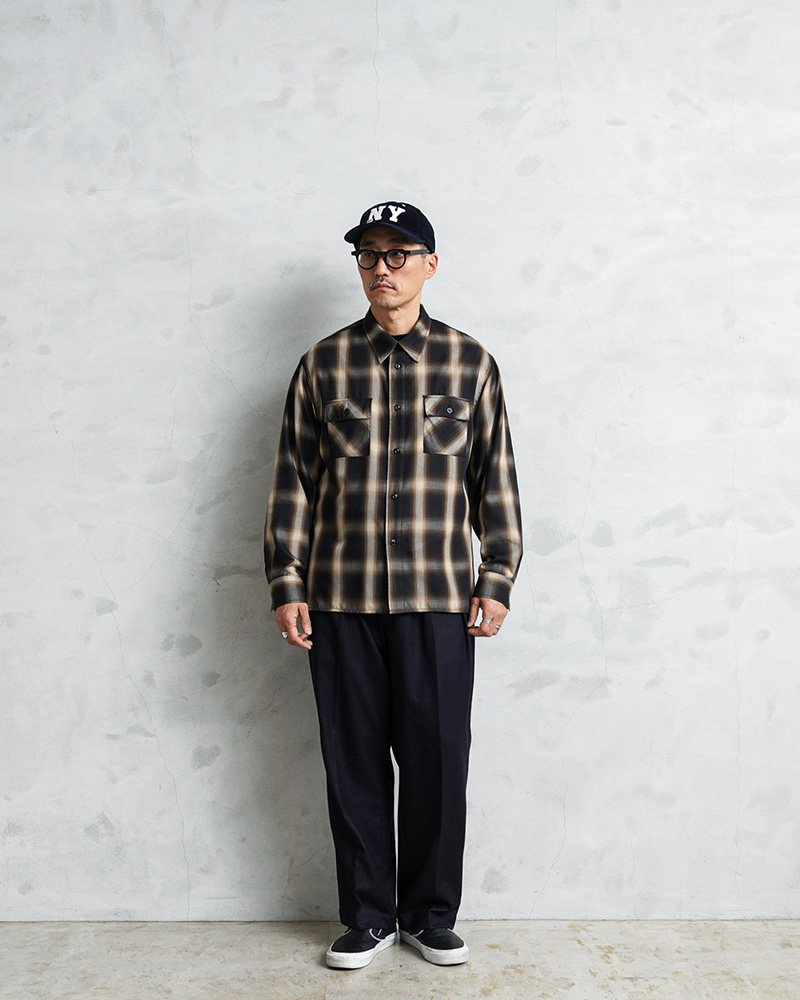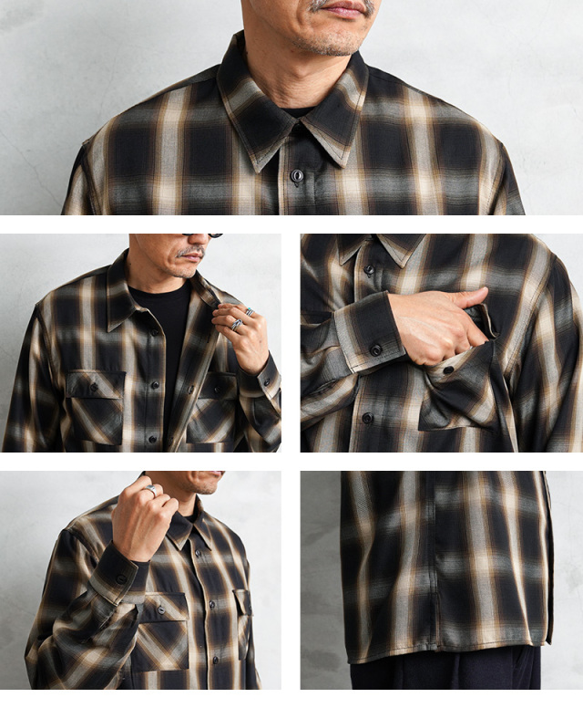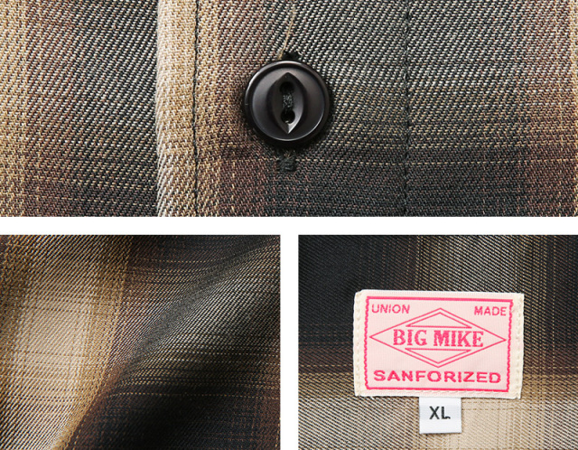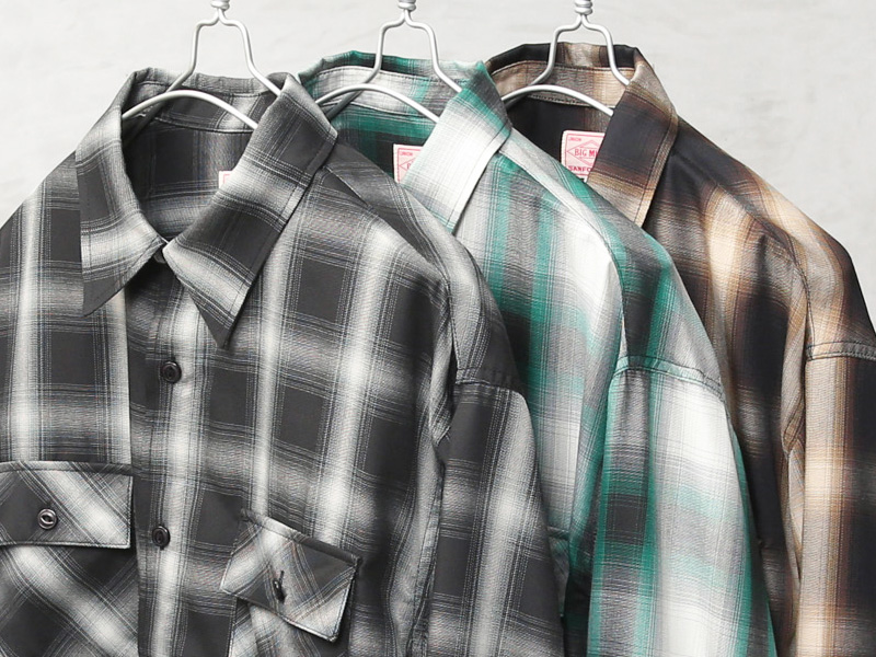 BIG MIKEから、着心地柔らかなレーヨンとポリエステル混紡のスリッド入り、オンブレチェックシャツが登場しました。レーヨンとポリエステルを混紡した素材を使用。レーヨンの柔らかさと吸湿性にポリエステルの速乾性と耐久性の両素材を活かした仕様でサラッとした着心地の良さが特徴です。2本針巻き縫いやフラップ付き胸ポケットなどヴィンテージライクなディテールが魅力的に仕上がっており、また猫目ボタンを採用しているので、糸がくぼみのところにあり擦れるのを防いでくれます。