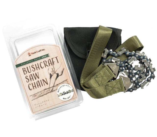 | 商品説明 | チェーン状の手動のこぎりです。 コンパクトで軽量なので、ブッシュクラフトやキャンプでの持ち運びに便利です。 一般的なチェーンソーの刃が一方向の動作であるのに対し、ブッシュクラフトソーチェーンの刃は左右両方向で木を削ることができ、手動でも素早く簡単に木を切断できます。 2人で1つずつ両側のハンドルを持ち、2人で効率よく作業することもできます。 作業の際は、ソーチェーンの両端まで全体を使うようにゆっくりご使用ください。 作業中は両端を絞りすぎず、広げて作業するとよりスムーズに切断できます。 カッターは規則的に隙間なく配置し、扱い易いセミチゼルカッターを採用しております。 硬質クロムコーティングを施し刃持ちを良くしています。 【使用上の注意】 人が作業するために特別に設計されたチェーン状の手動式ノコギリです。 カッター部分は非常に鋭利になっておりますので、素手では触らないようにしてください。 作業中は危険防止の為、手袋、セーフティグラスをお使いください。 火のそばに置くとやけどや変形の恐れがあります。 変形・破損した場合、直ちに使用を中止してください。 取扱には十分注意し、お子様の手の届かないところに保管してください。 |
