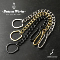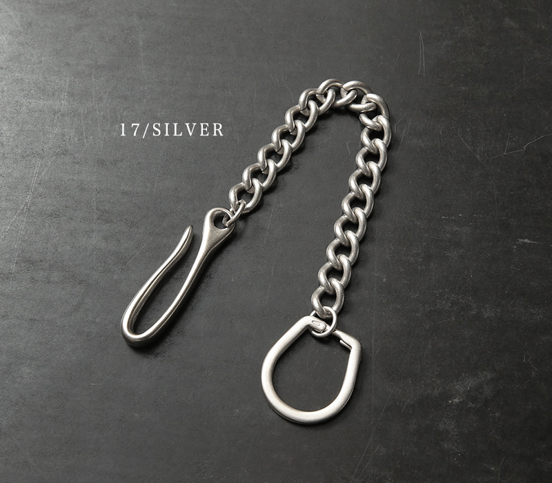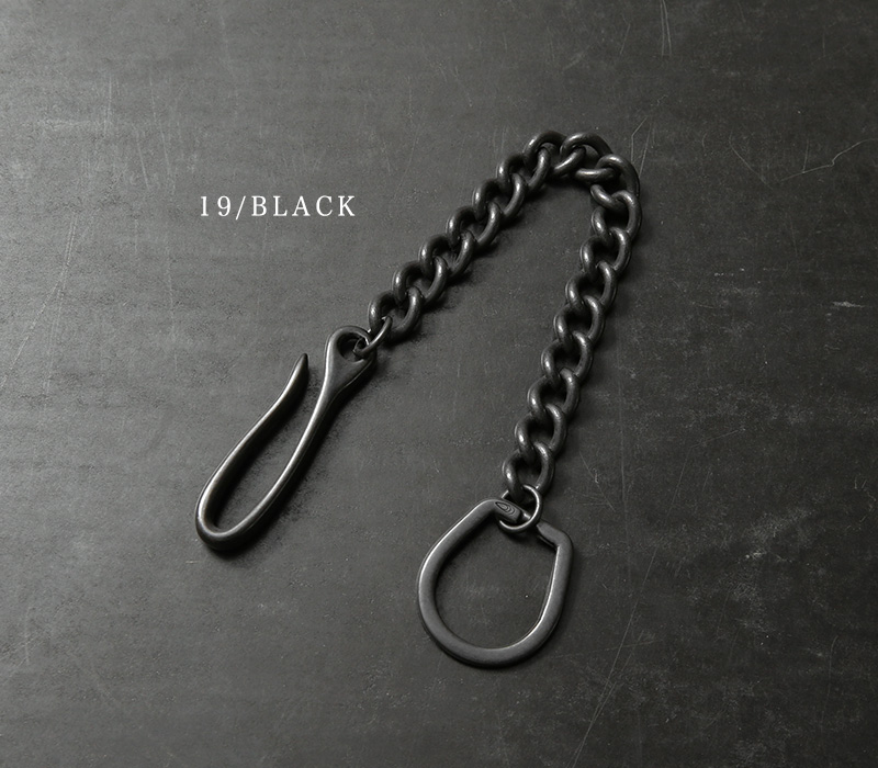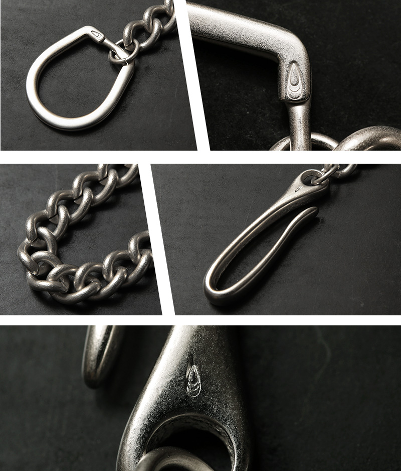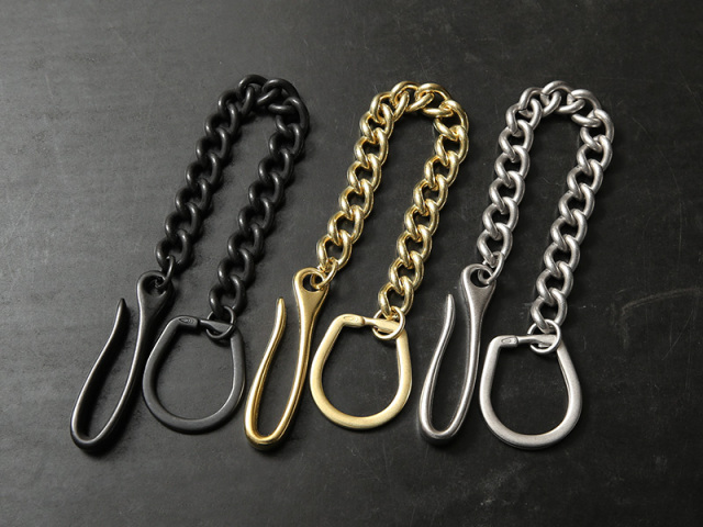 BUTTON WORKSより、釣り針のようなフィッシュフックが特徴的なキーチェーンが登場。真鍮製のフィッシュフック、チェーン、オリジナルのホースシューリングを合わせた造りになっています。それぞれのカラーで鍍金方法やこだわりが異なり、 ◎米軍物に使われるダールブラックのメッキを施して、ミルスペックギアのようにマットに仕上げた19/BLACK。 ◎使っていくほど経年変化が楽しめる、光沢のある真鍮メッキで仕上げた54/GOLD。 ◎通常のニッケルメッキとは異なり、光沢が無くくすんだ特殊なメッキ技法で仕上げた17/SILVER。 使うほどにメッキが剥がれたり、下地のカッパーメッキが現れたりと、本物のヴィンテージアイテムのような趣を感じることができます。