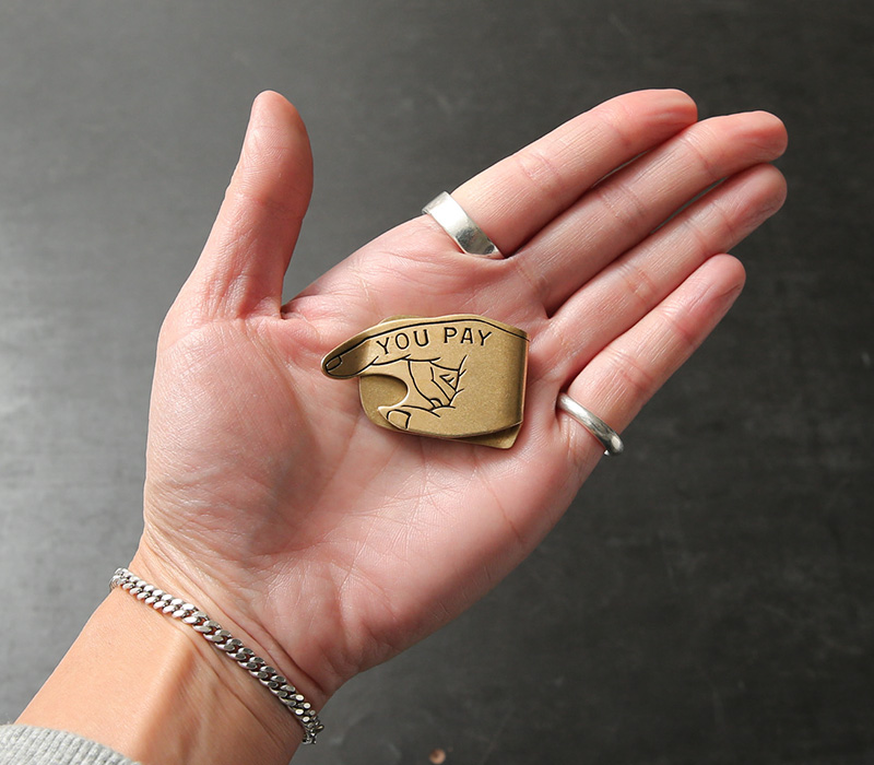 アメリカの飲料メーカーが、かつてノベルティーとして生産していたキーホルダーを再現、“You Pay Spinner”のデザインをマネークリップにアレンジしています。裏側は、ヴィンテージ市場で定番となっているアメリカの某大手百貨店チェーンのロゴにインスパイアされたデザイン。 指のモチーフがお札を挟んでいるように見えて洒落が効いています。真鍮ならではのゴールドカラーは使い込むほどに味わいが増し、愛着の湧くアイテムです。