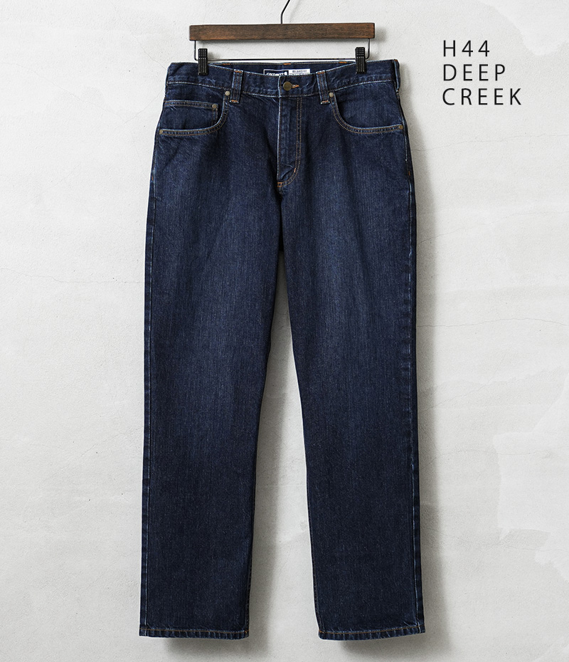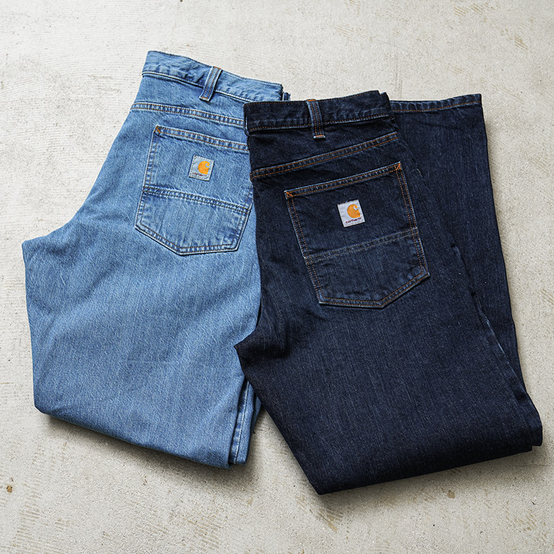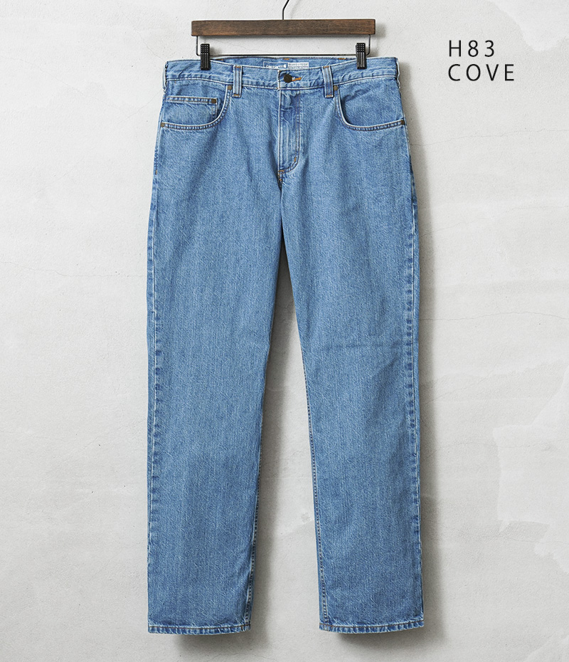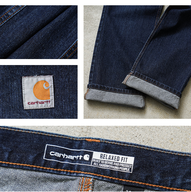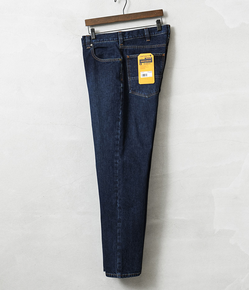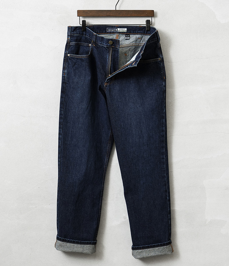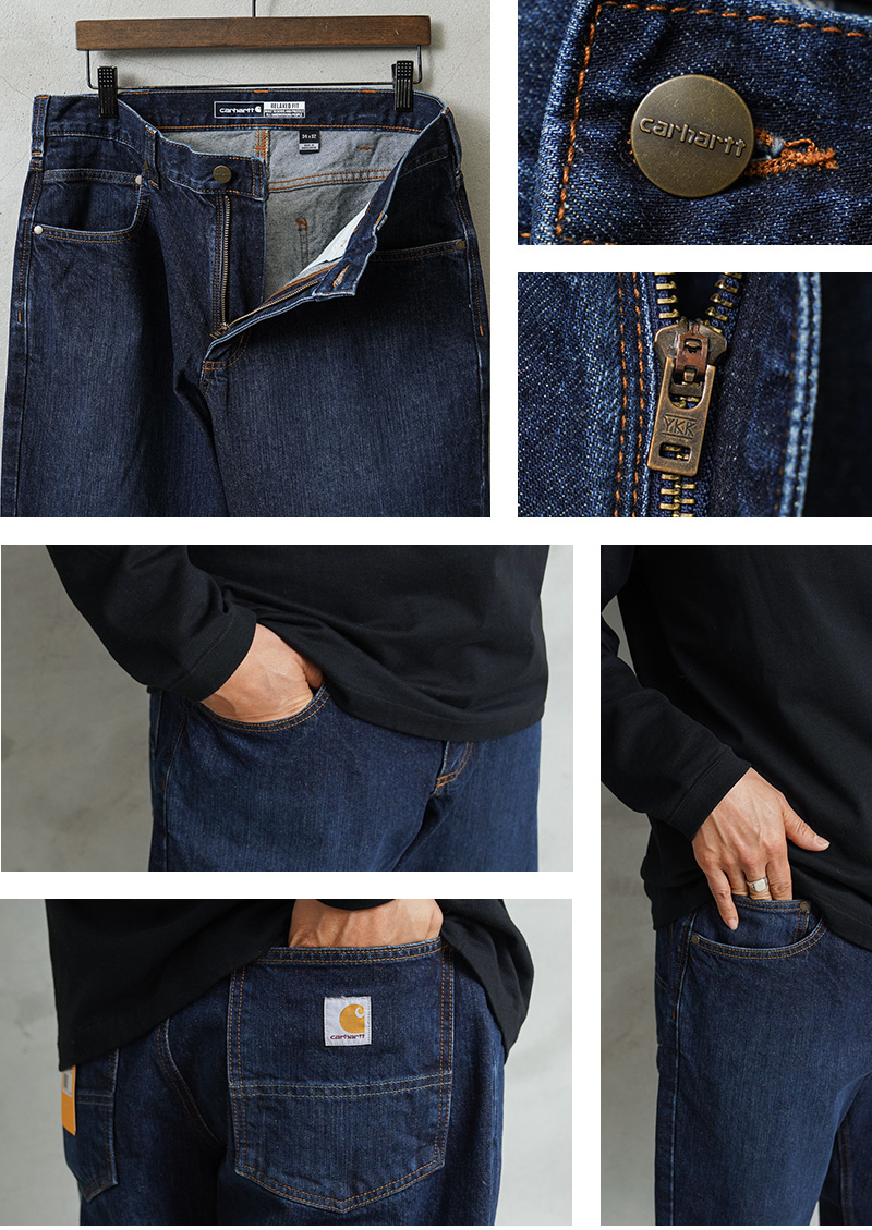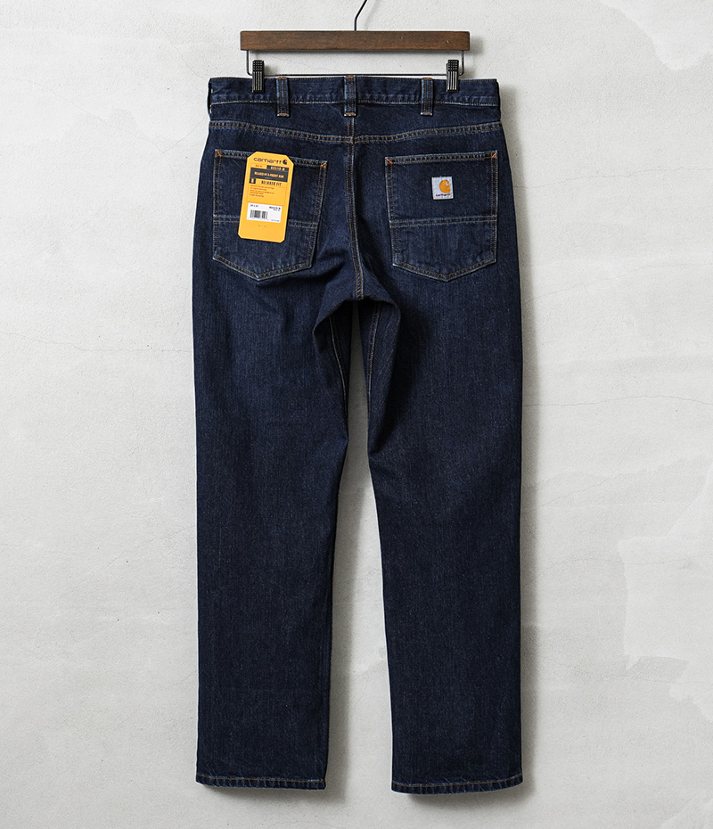 カーハートより、中厚手のウォッシュドデニムを使用した、リラックスフィットデニムが登場しました。コットン100%の程よい厚みのウォッシュドデニム生地を採用。サラッとした肌心地はもちろん、耐久性に優れ、また穿きこむことで自然な風合いに育っていくのも特徴です。バックポケット下部分は2重に補強され安心。もも周りにかけてゆとりのあるフィット感と裾にかけて細くなるテーパードシルエットが上品な印象を与えています。