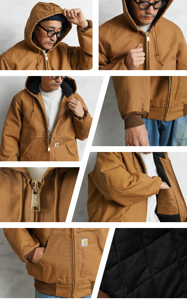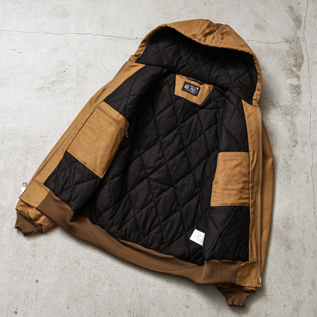 ブランド定番の12ozコットンダックを使用したフルジップパーカースタイルのジャケットです。表地にはCarharttの代名詞的な素材であるダック地を使用。着込んでいくほどに味わいの増す素材となっています。 本体およびフードの内側には、保温性に優れたキルティングフランネルライニングを採用。さらに、袖部分には滑りのよいナイロンキルティングライニングを使用し、真冬の屋外でもしっかりと暖かさを確保します。防寒性と快適な着用感を兼ね備えた設計で、厳しい寒さの中での作業やアウトドアシーンでも頼れる一着です。