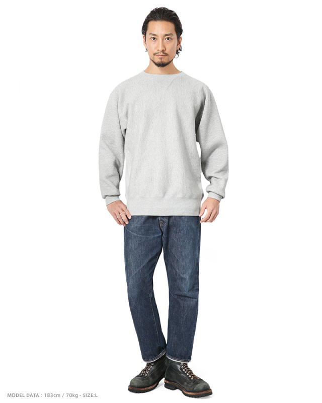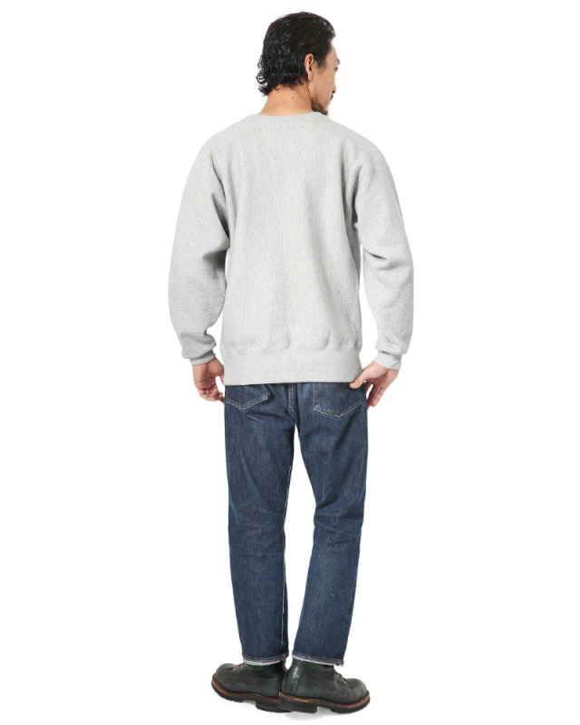 ミリタリーをはじめとする古着アイテムと切っても切り離せない関係のChampion! 1970年代の米軍士官学校であるUSMAモデルのリバースウィーブを忠実に再現したこちらのアイテム。 首元のガゼットや編地と霜降りの色目が際立つ少しオートミール寄りの杢グレーの色味が絶妙に良い仕上がり。 もちろん、USMAのブランクボディ仕様ということで当時の単色青タグにネームを入れるためのヘリンボーンテープが首元に縫われています。 シルエットはもはや定番に返り咲いたクラシックな太めの袖、ヴィンテージスウェットらしい広めにえぐれたクルーネックなど、アメリカンスウェットの当時の雰囲気をクラフトマンシップあふれるジャパンメイドで再現した自信作! 長く付き合っていきたい良質な1枚です。 シンプルなスウェットだからこそ良いものをチョイスしたいところ。 こういた普遍的なアイテムは20年越しで次の世代に着続けててもらいたいとすら思います! |
