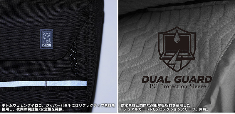 CHROMEから中の荷物を徹底的に守るタフな設計で、デイリーユースに適したサイズのバックパックが登場。内部にPCを水と衝撃の両方から守る「デュアルプロテクトラップトップスリーブ」を内蔵しており、取り外して使用することも可能。 水を通さない素材とクッション材を組み合わせ、14インチまでのPCを雨と衝撃の両方からガードします。スリーブだけを取り出して、バッグインバッグのように単体使用もできます。外装にはバイアス状の模様が特徴で破れに強い強度を持つCHROMEオリジナルの素材を採用。メインポケットは日常使いに丁度良いB4サイズに対応し、トップのベルトを調節することで内容量をさらに拡張でき、ボトム部分にはシューズやランチボックスを収納できる独立したジップポケットを備えています。
