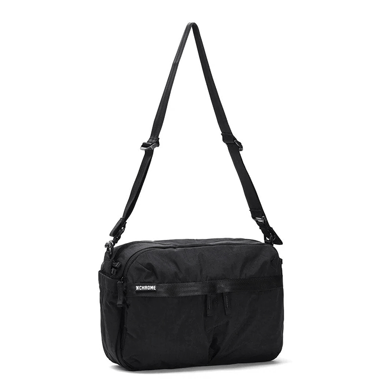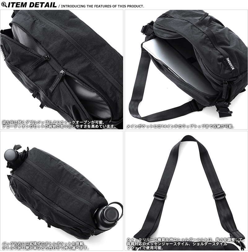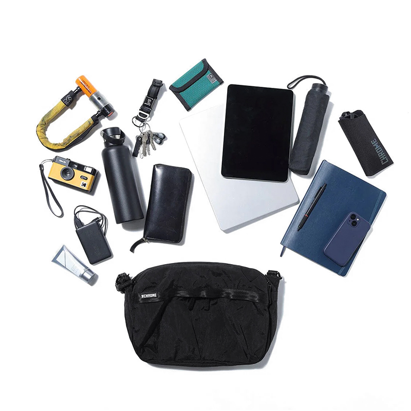 CHROMEから中身が一目瞭然!取り出しもスムーズで機能的なショルダーバッグが登場。カジュアルで柔らかな表情でありながら、400デニールの強度を備えたタフなリサイクル素材を採用。シワや縮みがほどこされており、シボと呼ばれる縞模様が特徴のクリンクル加工の生地です。 肌に生地が密着しないため、肌あたりが爽やかで、独特の質感と見た目がユニークでヴィンテージな雰囲気を演出します。メインスペースは、大きく開くアコーディオンガセットによりポケット内が小物で溢れていても内部の確認や出し入れがとてもスムーズ。 最大14インチのラップトップが収納可能で、クイックリリース機能付きのベルトにより、メッセンジャースタイルとショルダースタイルの2WAYで使い分けができます。