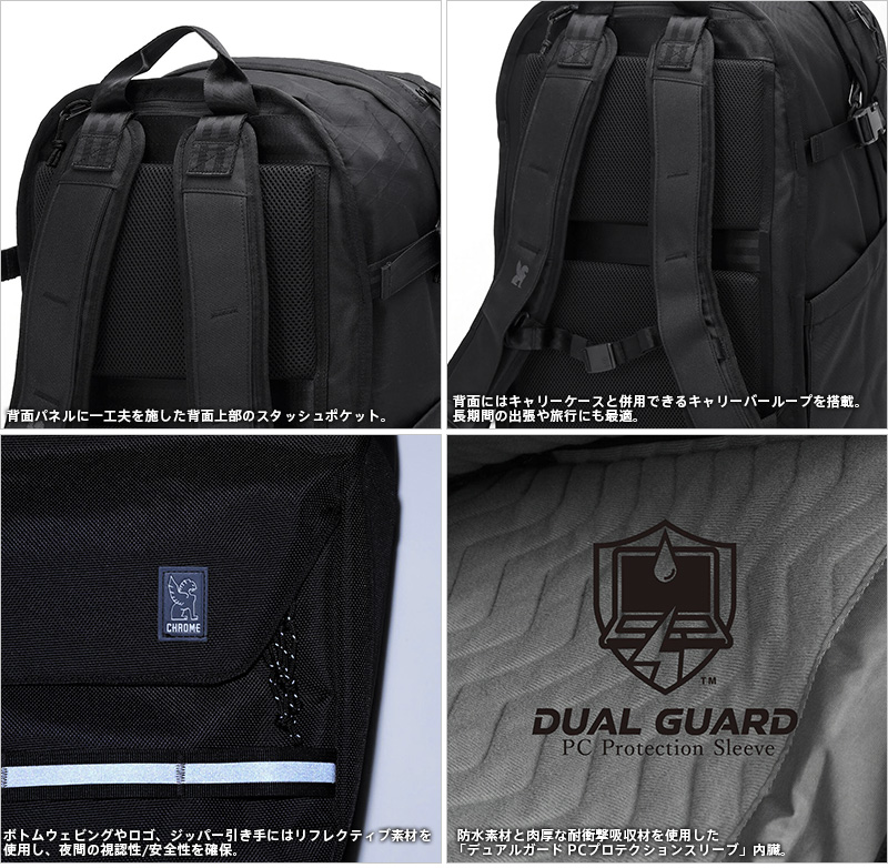 CHROMEから大容量でありながら、中の荷物を徹底的に守るタフな設計のバックパックが登場。内部にPCを水と衝撃の両方から守る「デュアルプロテクトラップトップスリーブ」を内蔵しており、取り外して使用することも可能。 水を通さない素材とクッション材を組み合わせ、15インチまでのPCを雨と衝撃の両方からガードします。スリーブだけを取り出して、バッグインバッグのように単体使用もできます。外装には頑丈な1680Dバリスティックポリエステル、内部には完全防水の210Dコーティングナイロンを採用しており、突然の雨でも安心。45Lの大容量に加え、トップのベルトを調節することで内容量をさらに拡張でき、ボトム部分にはシューズやランチボックスを収納できる独立したジップポケットを備えています。