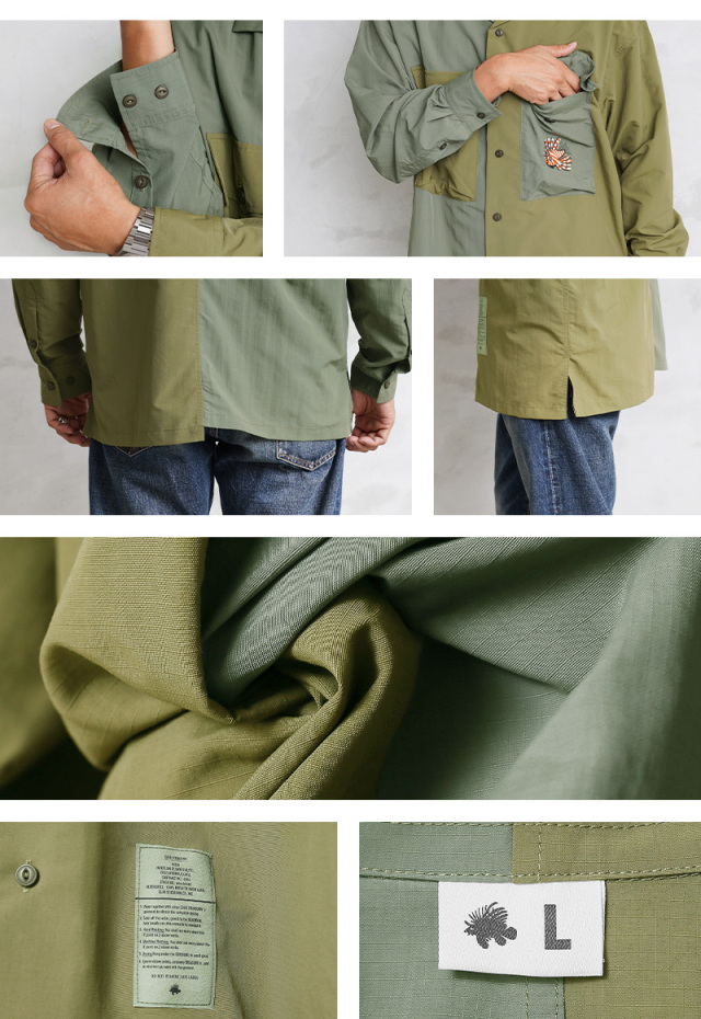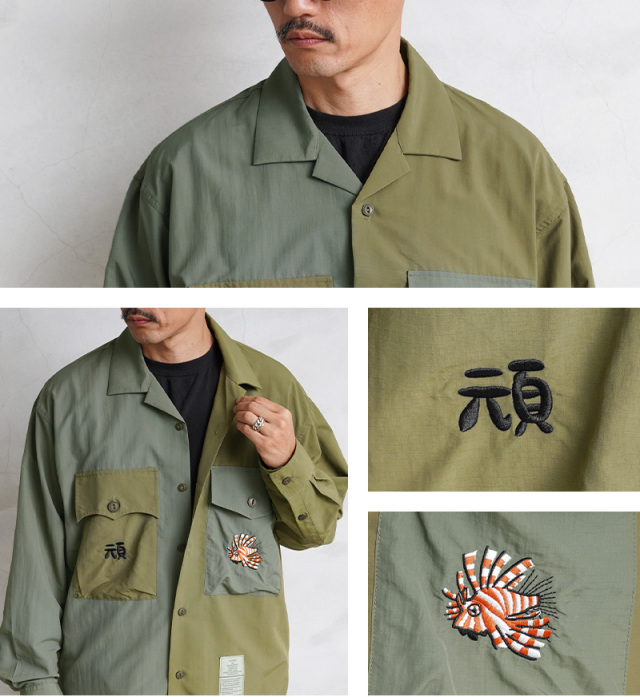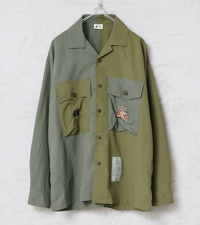 異なるカラーを組み合わせた遊び心があるデザインのスーベニアシャツです。 使用されているリップストップ生地は格子状に繊維が編み込まれているので、破れやほつれができてしまった場合でも、そこから裂け目が広がってくるのを防いでくれます。またフロントや袖口のボタンは糸が擦り切れにくくなっている猫目ボタンを採用など細部のディティールにもこだわりました。 フロントのポケットには「頑」の文字と、ブランドのマークにもなっている「Lion Fish」が刺繍されています。左右で違う生地を使用しているので裾の長さがアシンメトリーになっていたり、左袖には米軍アイテムでよく見られるラベルを配置など、遊び心を感じるデザインが施されています。 バランスよくまとまったデザインなので、コーディネートのメインとしては勿論、Tシャツの羽織など幅広いシーズンで着用できるアイテムです。 |