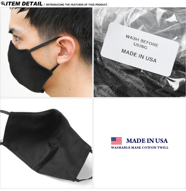 | 商品説明 | MADE IN USA コットンツイル ウォッシャブル マスクのご紹介です。 丈夫なコットンツイル生地を使用し、ネットに入れての洗濯が可能なマスクになります。シンプルなブラックカラーで使いやすいアイテムです。高さがある方なので口、鼻をすっぽりカバーでき、肌触りの良い生地感で快適な付け心地。コットンは吸湿性にも優れているため、他素材での蒸れ感が気になる方にはオススメのアイテムです。 ※こちらの商品は医療用ではなく、ウイルスの侵入を防ぐ物ではありません。抗菌防臭加工はされておりません。開封後に一度洗ってからの着用をオススメします。 MADE IN USA |