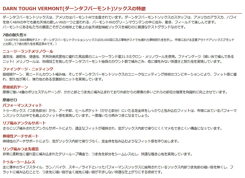 ![]() DARN TOUGH VERMONT(ダーンタフバーモント)ソックスは、祖父、父と三代、30数年間バーモント州ノースフィールドに居を据え、より革新的で耐久性に優れたソックス(靴下)を作り続けるCabat Hosiery Millのオリジナルプライベートブランドとして設立され、7年目を迎えます。 DARN TOUGH VERMONTソックスはデザインからテスト、生産、出荷までの工程すべてをアメリカで行っています。 その他のDARN TOUGH VERMONT ダーンタフバーモントはこちら | ||||||||||