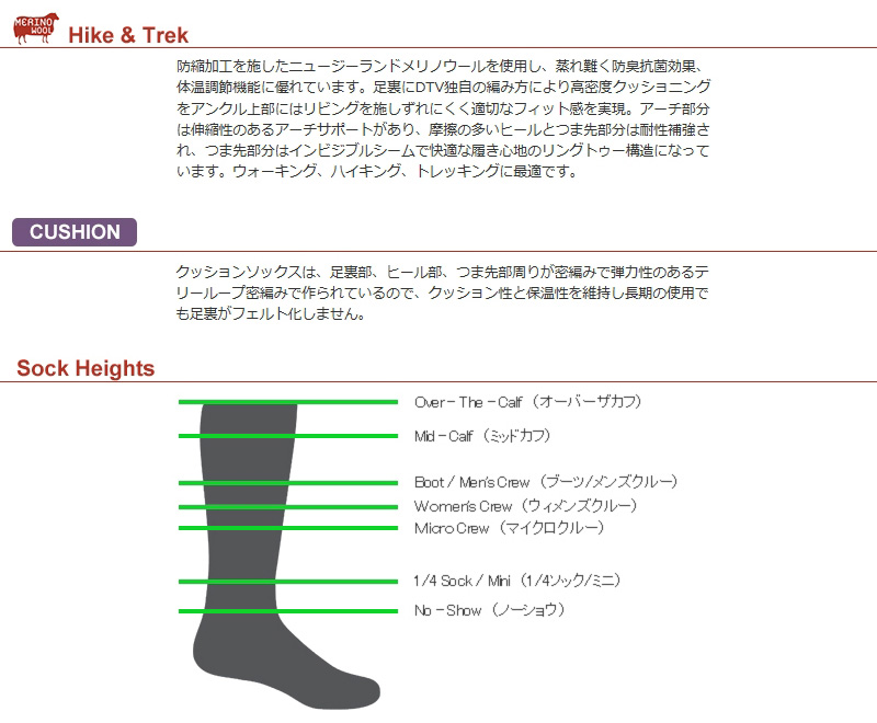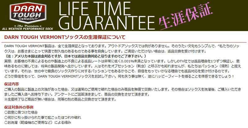 DARN TOUGH VERMONT ダーンタフバーモント TACTICAL BOOT EXTRA CUSHIONのご紹介です。 品番:T4033 ■丈:BOOT ■クッション:EXTRA CUSHION entire foot & leg ソフトで暖かい最高品質のニュージーランド産のメリノウールを使用しています。 メリノウールは難燃性に優れ、足の温度を一定に保ち、蒸れにくく防臭抗菌作用が高いことが特徴です。 ダーンタフ独自の編み方による高密度な足底のクッション、足首部分はずれにくくフィット感を高めた作りとなっています。また、土踏まず部分は伸縮性のあるアーチサポートを備え、つま先とかかと部分は耐久性を高め摩擦に強いつくりとなっています。TRUE SEAMLESS(リング編みつま先構造)により非常に柔軟性に優れ密に編み込まれたテリーループ構造で、つま先部分をシームレス化し、快適な履き心地を実現しています。 【お手入れ方法】 ソックスを長持ちさせるために洗濯の際は裏返し、洗濯機の液温は40℃を限度とし、弱水流で洗ってください。漂白剤及び、ドライクリーニングは避けて下さい。乾燥機に掛ける場合は、低温にしてください。 DARN TOUGH VERMONT製品は、全て生涯保証となっております。 アウトドアソックスでは例がありません。そのうたい文句もシンプルで、“私たちのソックスは、お客さまにとって快適で耐久性のあるものである事を自負しています。ご満足いただけない場合は、返品交換を受け付けます。 (注:アメリカ本国は返金対応ですが、日本では返品交換対応となりますのでご了承下さい。) 実際、お客様の不満によるものや製造上の不良による返品レートは非常に低く0.001%未満となっています。しかしDTV社では返品理由を1つずつ検証し、意味あるものに関しては、将来の製品開発へ生かしています。 人はそれをオブセッション(執念)と呼ぶかも知れませんが、私たちはパッション(情熱)と捉えています。それは、世の中で最良のソックス作りに対するパッションでもあるからこそ、自信をもっていかなる理由でも返品対応を受け付けるのです。 どうか自信をもって、DARN TOUGH VERMONTソックスをお試し下さい。 何も失う事は無く、逆にハッピーフィートを得ることを体感できるでしょう! 【保証内容】 ご購入の製品に製造上の欠陥があった場合、又は通常のご使用で破れた場合のみ商品を無償で交換いたします。 その場合はソックスを洗濯後、ご購入いただきましたご購入店へお持ち頂くか、郵送で送ってください。 アンケートにご回答頂きまして、商品の交換をさせて頂きます。 ※生産終了など商品が無い場合は、同等の別の商品と交換させて頂きます。 【保証対象外の事例】 ・故意に傷つけた場合 ・何かに引っ掛けられた事で起こったほつれや破れ ・お洗濯(乾燥機のご使用など)による縮み |