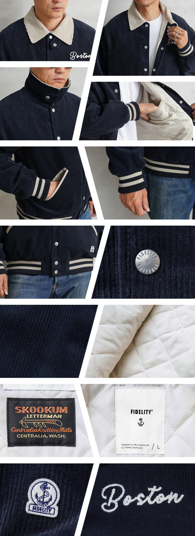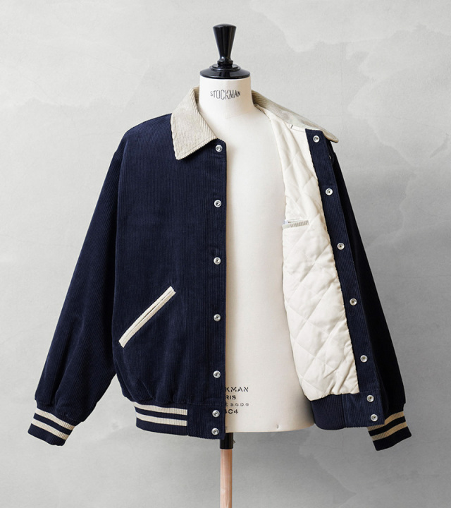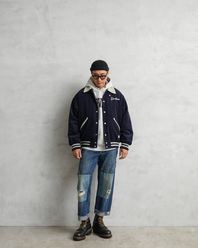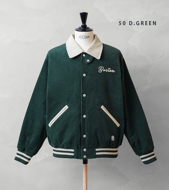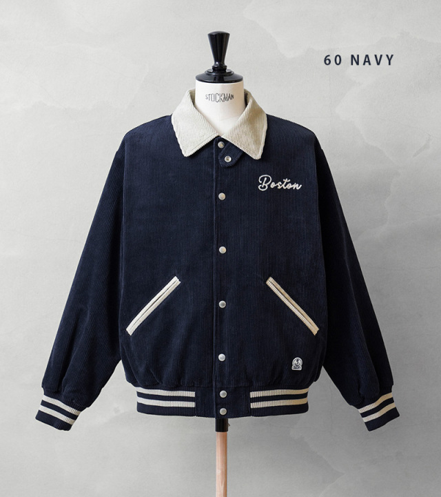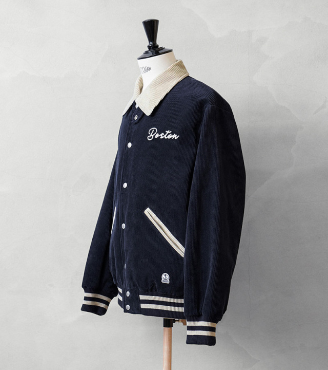 ヴィンテージのアワードジャケットをモチーフに、コーデュロイで仕上げた、SKOOKUM/スクーカムとのコラボで生まれたアイテムの登場です。生地は季節感が感じられるコーデュロイ生地で少し光沢感のある上品な仕上がり。レトロな雰囲気とスポーツテイストを感じる襟、ポケットと、リブライン。左胸にはFIDELITY発祥の地BOSTONの刺繍、右裾には錨マークのワッペンを配置、とても良いアクセントになっています。襟元にはチンストラップが付き、スタンドカラー着用でき、デザイン性と防寒性を兼ね備えたディテール。落ち着いた色合いとシンプルなデザインで、幅広い方にご着用いただける一枚です。
