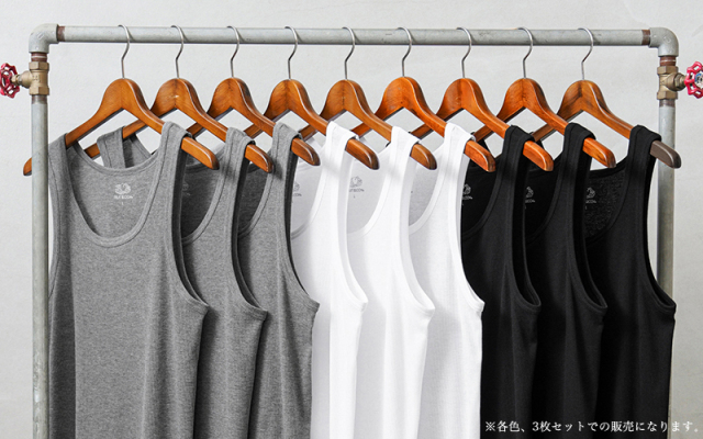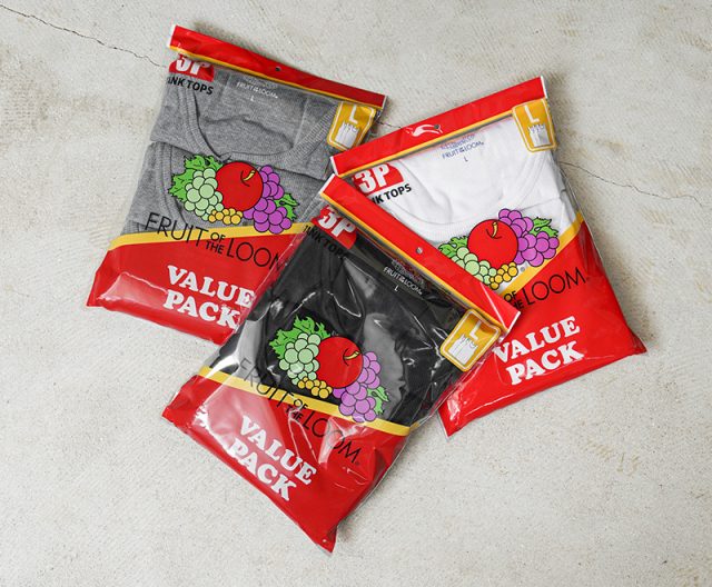 アメリカの老舗アパレルFRUIT OF THE LOOMから、フルーツパッケージに入った3Pセットのタンクトップが登場しました。 やや薄手で、柔らかくストレッチ性のあるリブ素材は体にフィットするので着心地抜群。タグは背中に違和感を与えないためにプリントタイプ、胴体部分はサイドの縫い目がない丸胴仕上げなので縫い代が肌に当たらずストレスフリーな着心地です。 使い勝手の良いカラーバリエーションと、インナーとして着回しやすいシンプルなデザインは何枚あっても困らない優秀アイテムです。