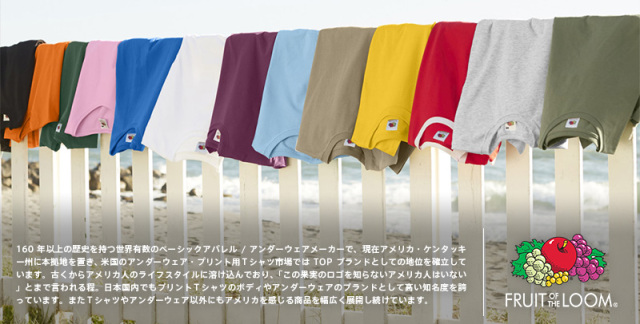 | ブランド | ![]() 160年以上の歴史を持つ世界有数のベーシックアパレル/アンダーウェアメーカーで、現在アメリカ・ケンタッキー州に本拠地を置き、 米国のアンダーウェア・プリント用Tシャツ市場ではTOPブランドとしての地位を確立しています。古くからアメリカ人のライフスタイルに溶け込んでおり、「この果実のロゴを知らないアメリカ人はいない」とまで言われる程。日本国内でもプリントTシャツのボディやアンダーウェアのブランドとして高い知名度を誇っています。またTシャツやアンダーウェア以外にもアメリカを感じる商品を幅広く展開し続けています。 その他のFRUIT OF THE LOOM フルーツオブザルームはこちら |