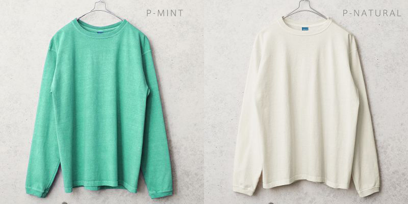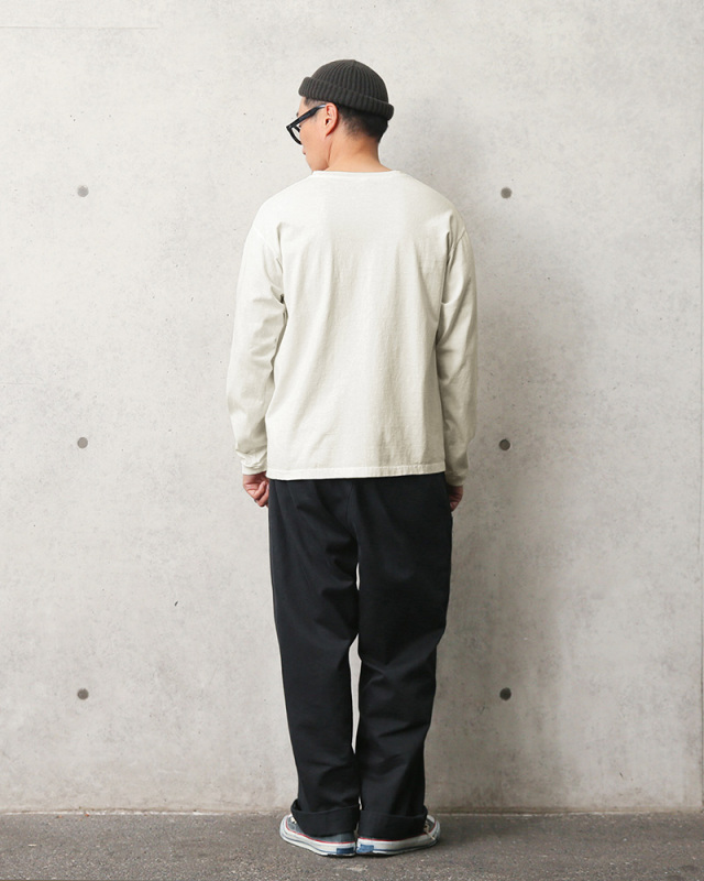 生地には肌に優しく、日本の気候に最適な生地感と強度にも優れたUSAコットンを使用。 ※製品染め商品の特性上、一点一点染めているためお色やサイズに若干の誤差がございますので予めご了承ください。また、独特のユーズド感のある表情、多少のゆがみや擦れ、縫い目部分のしわ、編み地の筋やムラなどは製品の特徴です。素材の持つ不均一感やラフ感をお楽しみください。