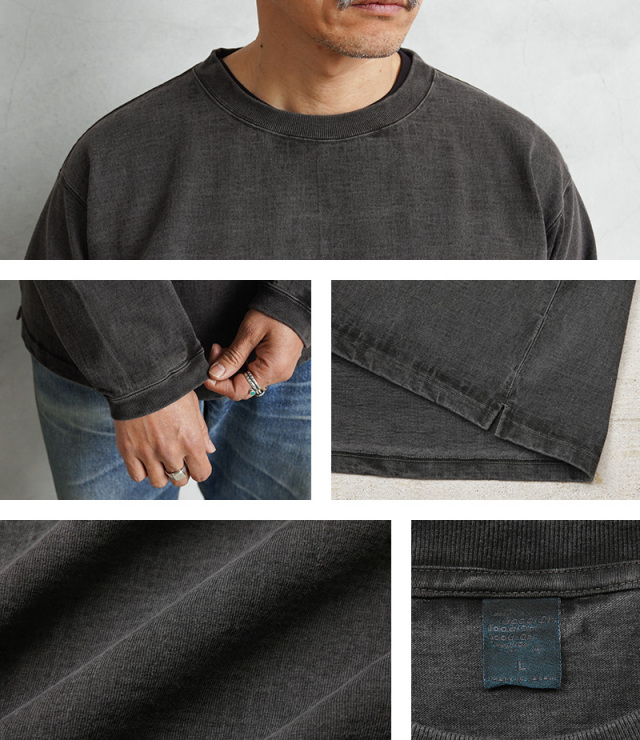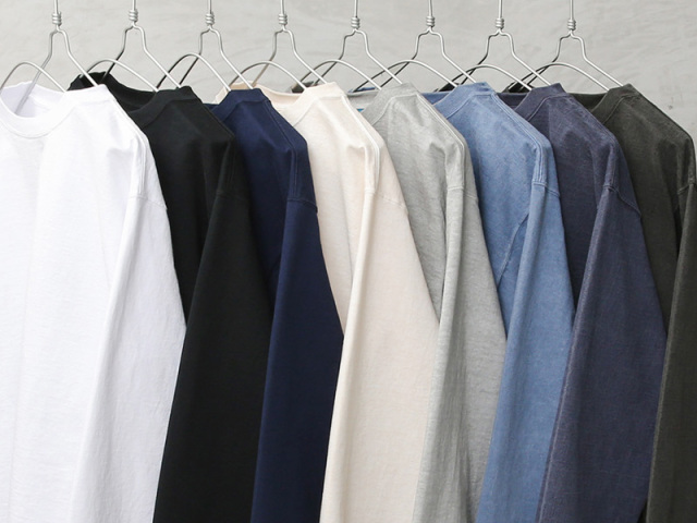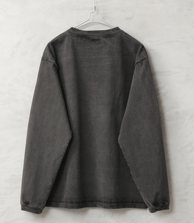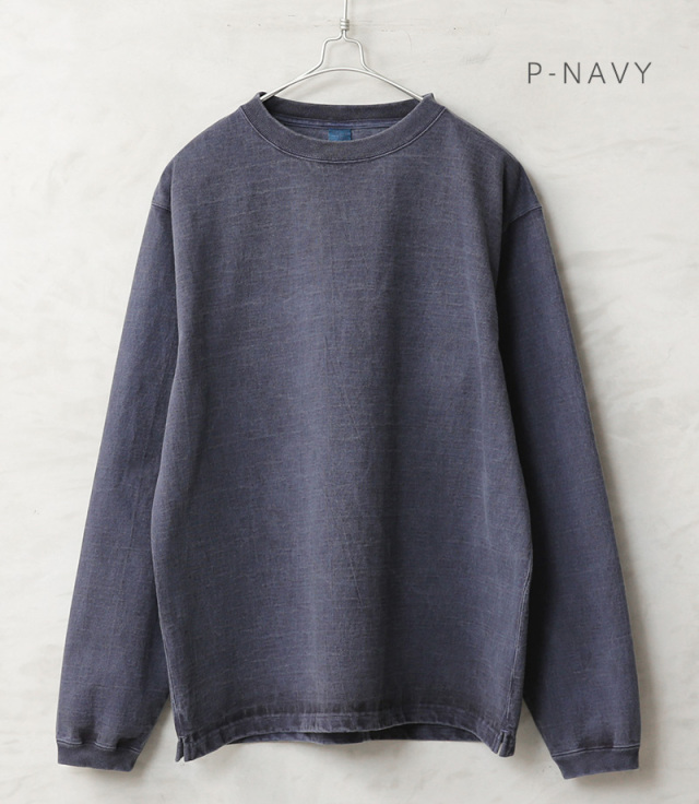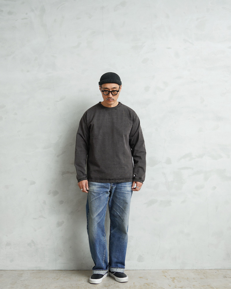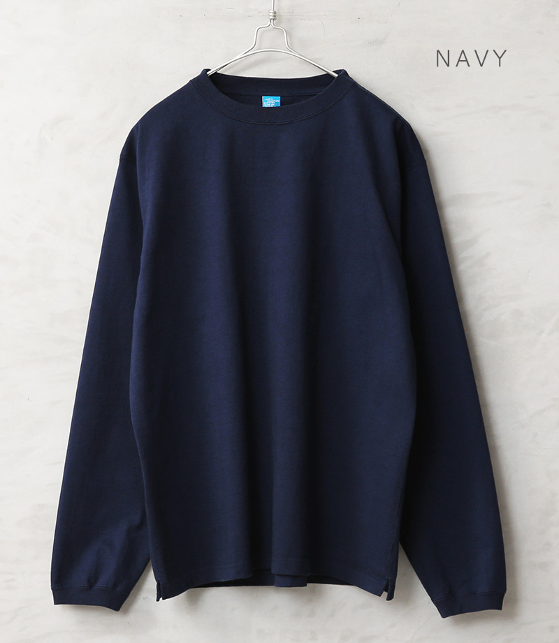 近年、トレンドのヘビーオンスジャージーを使用したロングスリーブTシャツの登場です。生地には程よく厚みのある、9オンスヘビージャージを使用した肌に優しいUSAコットンを使用。無骨でずっしりとした重量感のあるボディは良質なアメリカ綿の着心地を味わうことのできる一枚です。厚みやゴワつきが気にならず着脱しやすいパターンとデザインが特徴。また重厚な生地を支えるための強固でフラットな縫製など優れた耐久性も嬉しいポイントです。上品な仕上がりの反応染めカラーを採用。