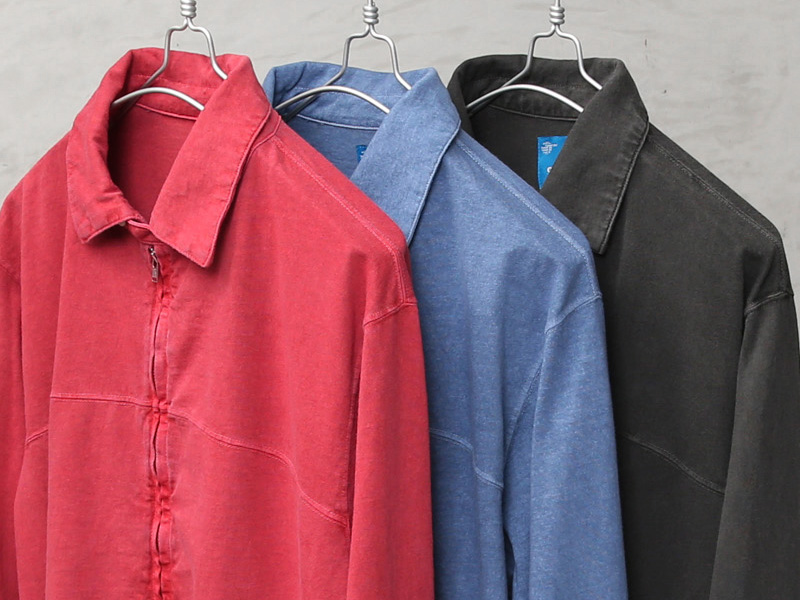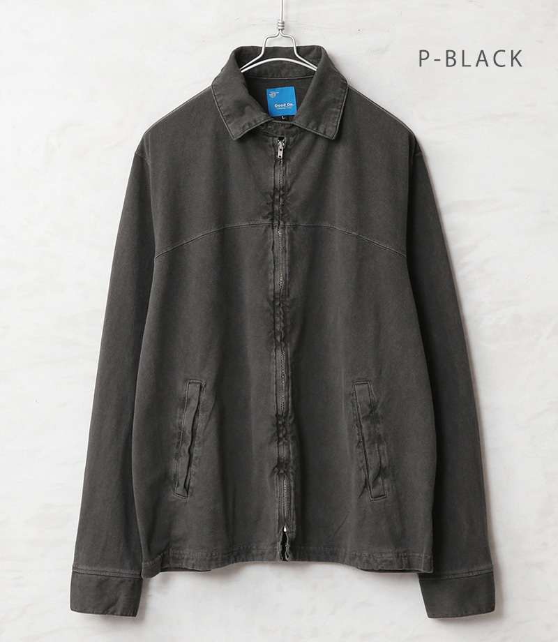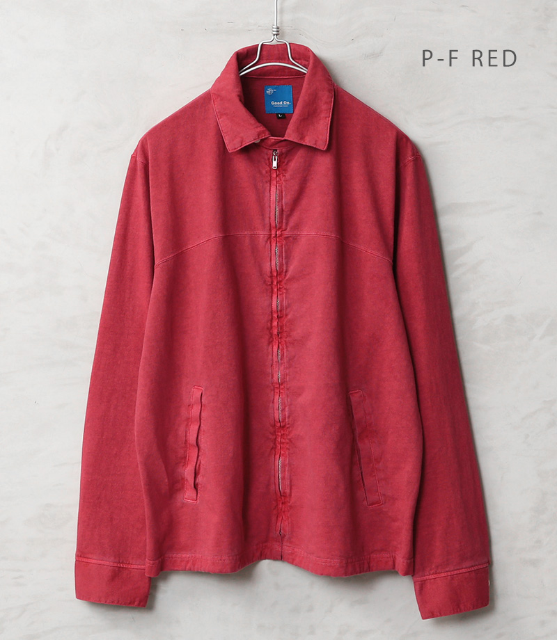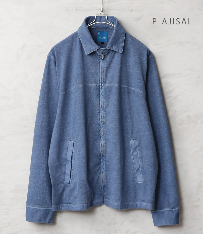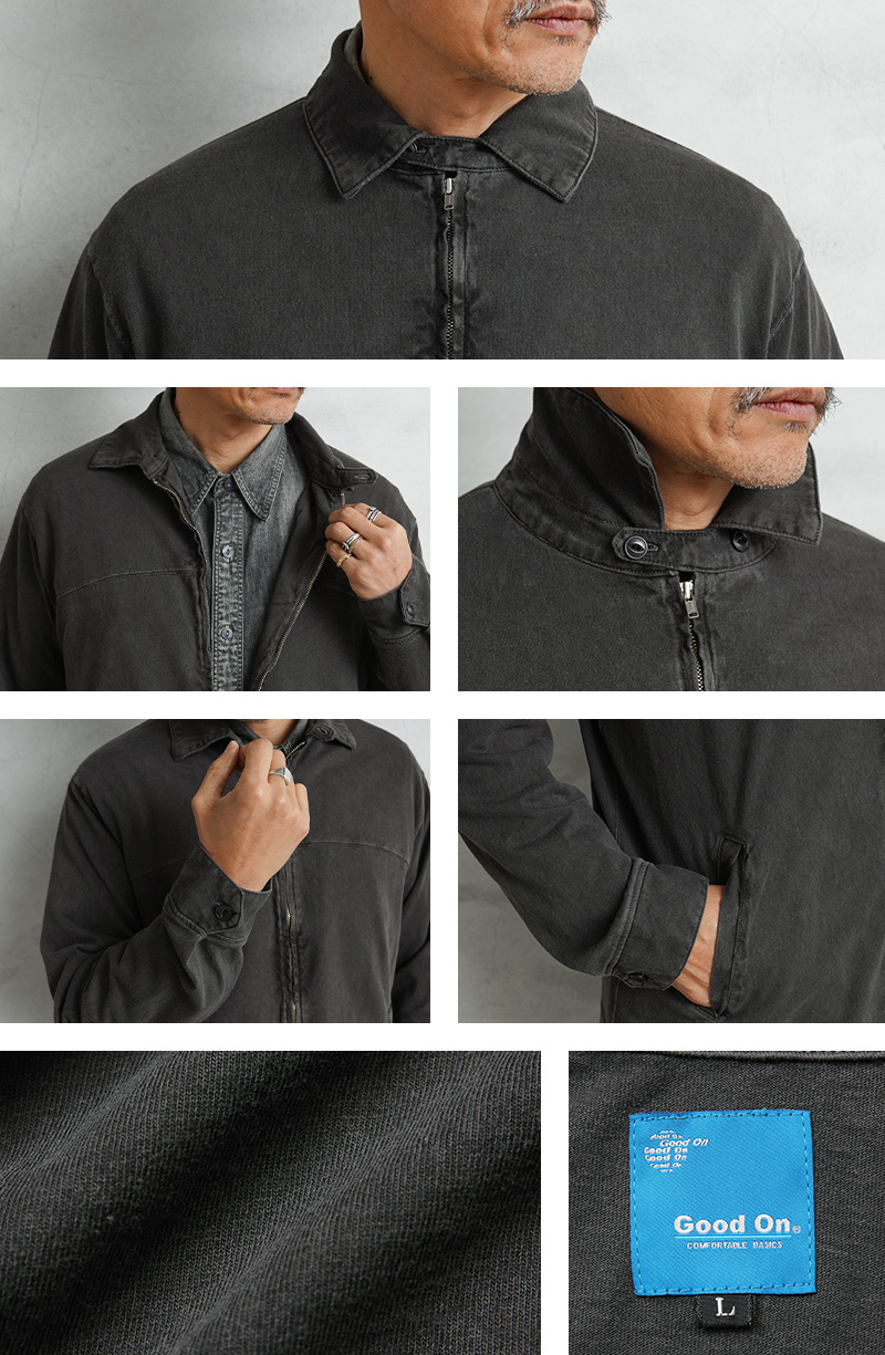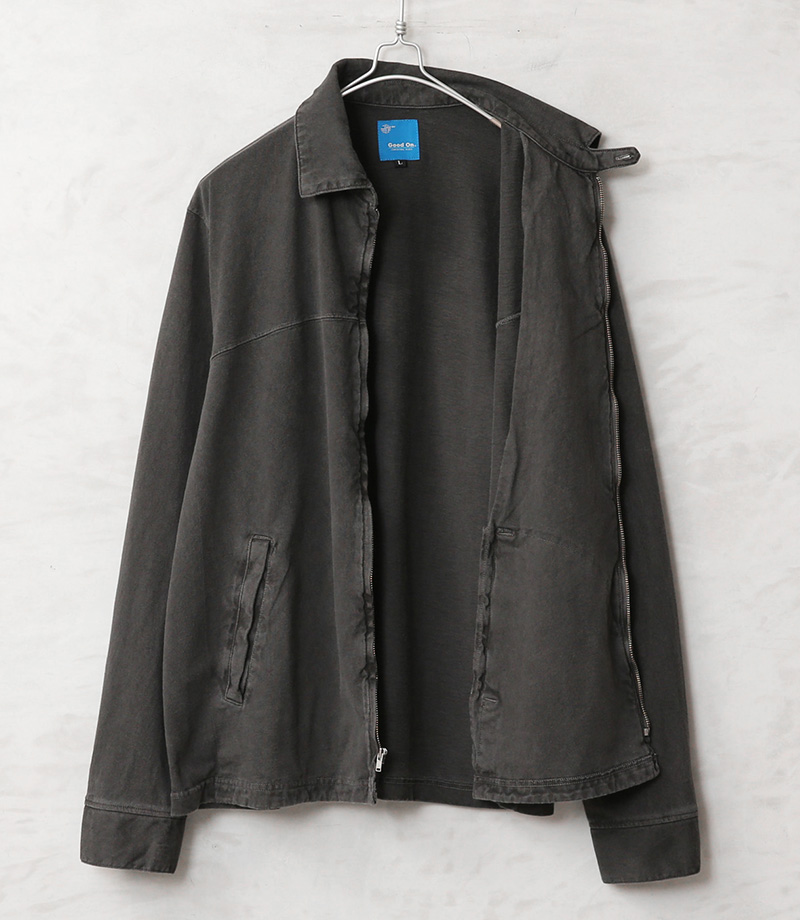Good Onより、綿100%の定番Tシャツ生地を使用した、ショート丈ブルゾンの登場です。Good Onの定番Tシャツなどで使用される綿100%のTシャツ生地(5.5オンスジャージー)を採用。程よい厚みとサラッとした肌触りの良い生地感でオールシーズン快適に着用可能です。 襟元のチンストラップや身頃の玉縁ポケット、胸元の切り替えなど、本格的なスウィングトップのディテールをしっかり取り入れた、完成度の高い一着となっています。
