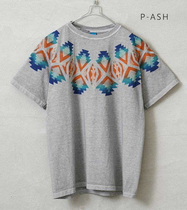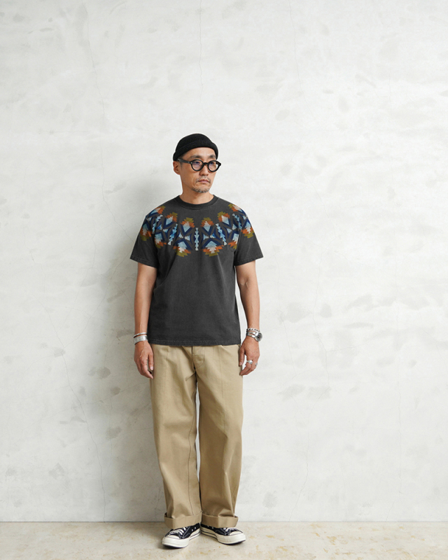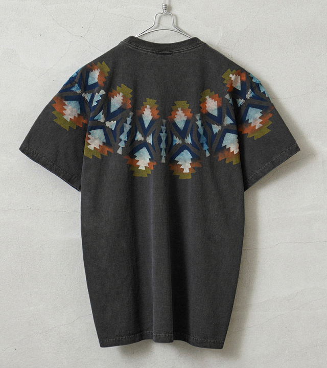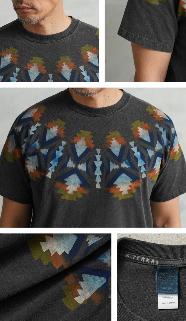 | 商品説明 | Good On×KOUHEI TERRAI ROUND RUG S/S クルーネックTシャツ 日本製 のご紹介です。 品番:KTER-2402 良質なUSAコットンを使用する「Good On」のTシャツに、70年代のアメリカ中心の古着に影響を受け活動している「KOUHEI TERRAI」がアレンジを加えました。 ボディに使用している生地はGood Onではお馴染みの肌に優しく、日本の気候に最適な生地感と強度にも優れたUSAコットンを使用。 首周りには伸びるのを防ぐために、左右両肩ラインから首後ろまで、身頃生地と同じ素材でテープ処理が施されてるので安心です。脇に縫い目がない「丸胴編み」により、ストレスフリーで心地よい着心地を実現。負担のかかる独自の後染めにも耐えうる丈夫な縫製なので、安心して洗濯を繰り返すことができます。 Good OnのTシャツにKohei Terrai氏による繊細な作業工程を用いてネイティブアメリカンのような独特なデザイン・色合いに仕上げました。印刷をするための版作りからプリントまですべて手作業で行うことで、手摺独特のインクの濃淡を出しよりヴィンテージ感を演出しました また一般的なプリントTシャツはフロントやバックなどの範囲でのデザインになりますが、こちらはその制限を超えて胴部分から袖まで一周して手摺りすることでネイティブ調のデザインがより映えるインパクトのある1枚に仕上げています。 Good On×KOUHEI TERRAIのこだわりを感じるディテールやデザインは、シンプルでカジュアルにまとまっているので、気軽にコーディネイトに取り入れやすいアイテムです。 Fabric Made In USA Assembled In Japan |