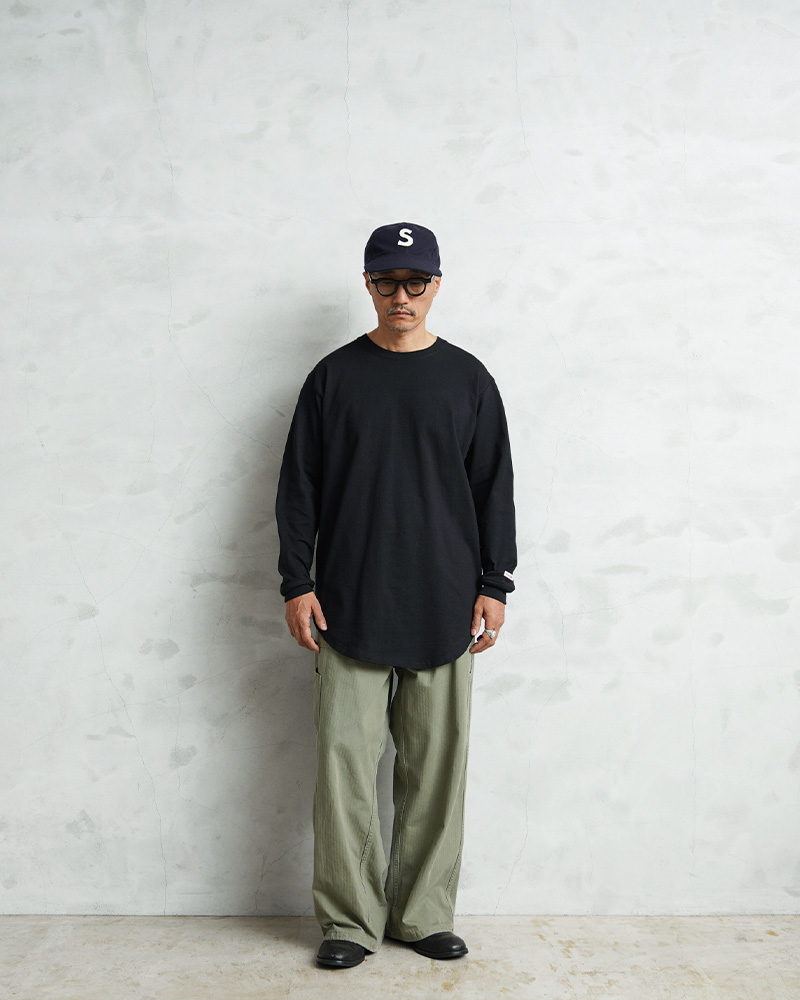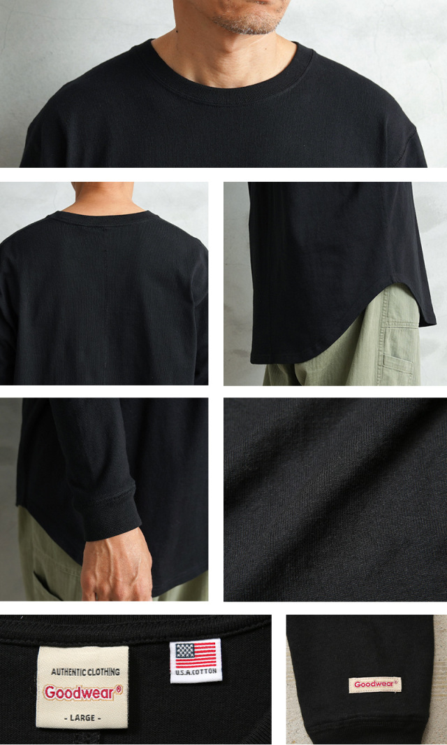 Goodwear グッドウェアより、USAコットンを使用した、ラウンド裾が特徴のロングスリーブTシャツの登場です。生地には、タフで肉厚の7.6オンスUSAヘビーコットンを使用。しっかりとタフな生地感でありながら、洗い加工を施しているので、柔らかく、快適に着用可能です。裾まわりに丸みを持たせたラウンド仕様を採用。レイヤードした際には、アウターやスウェットの下から裾が自然に覗き、スタイリング全体に立体感が生まれるのも魅力。縦のラインを強調してくれるので、スッキリとした印象で着こなせます。またドライ感とコシがあるのが特徴で使い込み、洗いを重ねることでヴィンテージ感の風合いを楽しめるのも嬉しいポイントです。