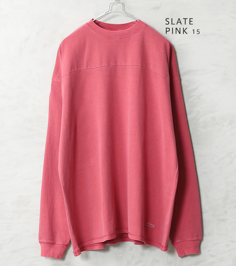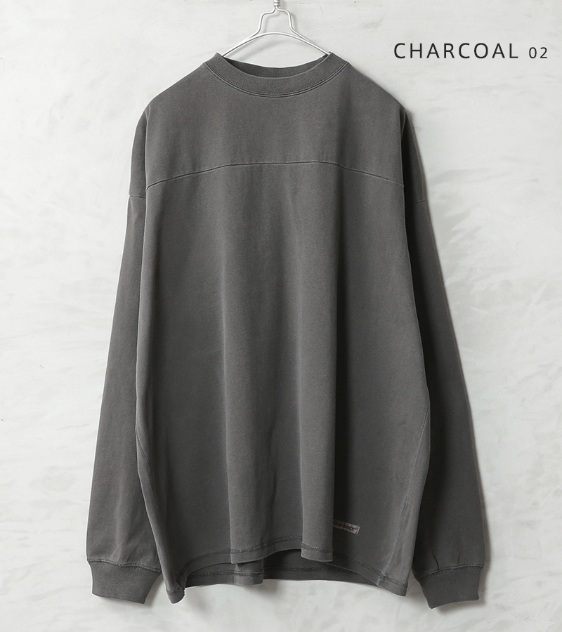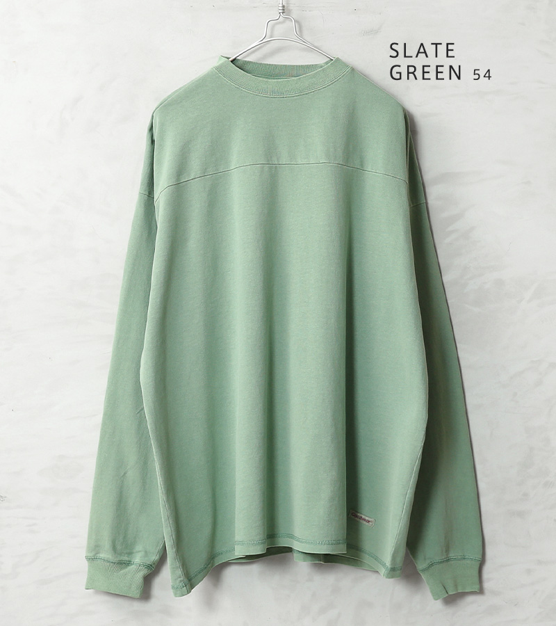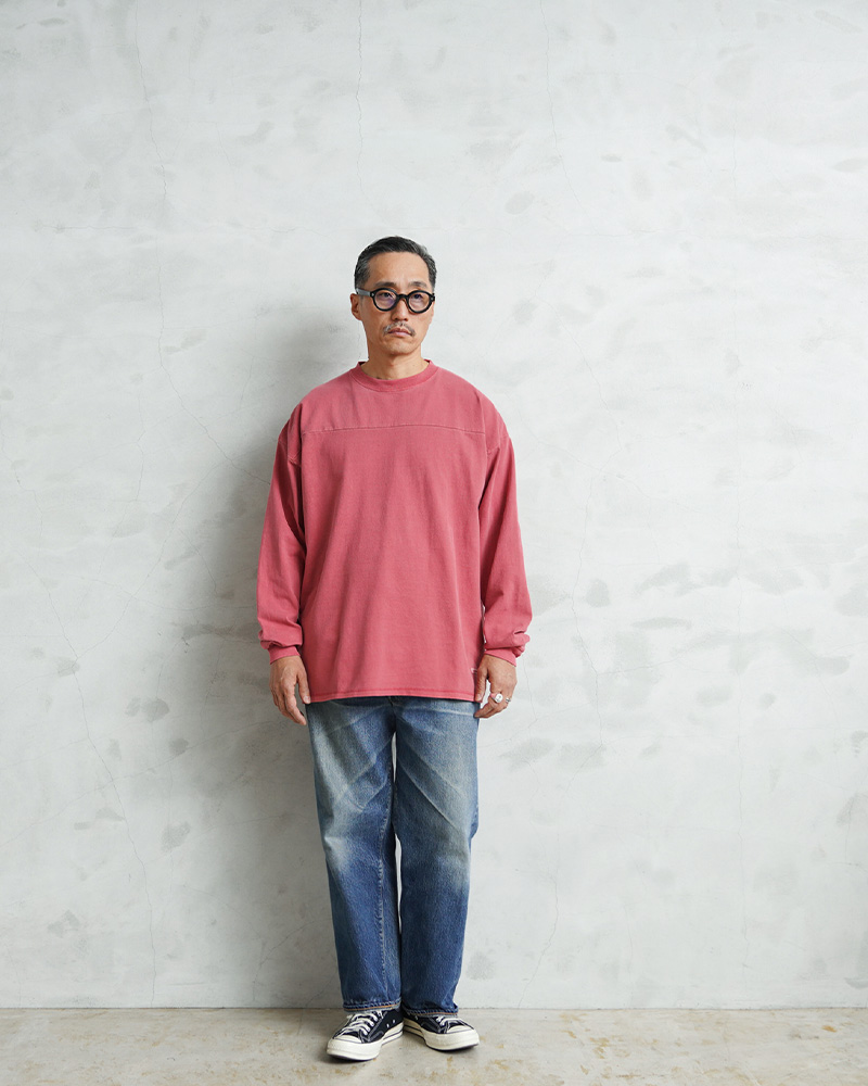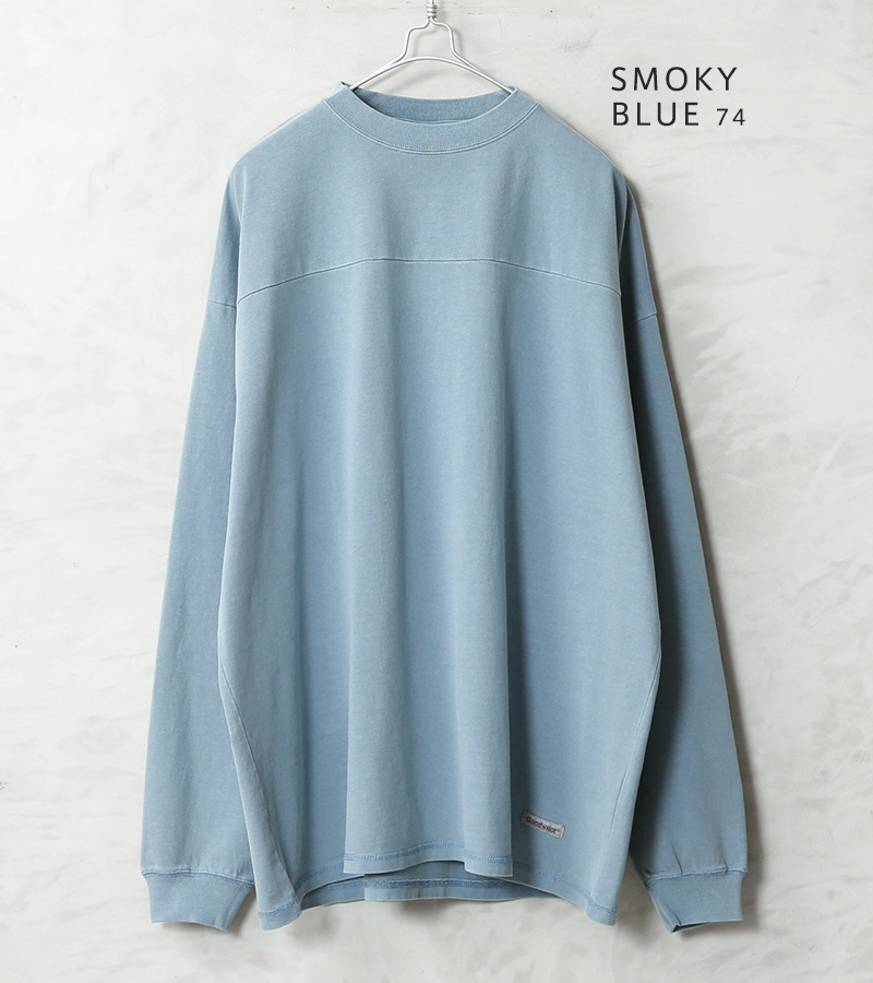 Goodwear グッドウェアより、ガーメントダイ(製品染め)を施した、フットボールTシャツの登場です。生地には、タフで肉厚の7.6オンスUSAヘビーコットンを使用。しっかりとタフな生地感でありながら、洗い加工を施しているので、柔らかく、快適に着用可能です。ゆったりとした身幅で、トレンド感のあるオーバーサイズシルエットで1枚でも抜け感のある着こなしが可能です。切り替えデザインを取り入れることで、無地ではあるものの立体感が生まれ、単調になりがちなビッグシルエットにしっかりと表情をプラスしています。
