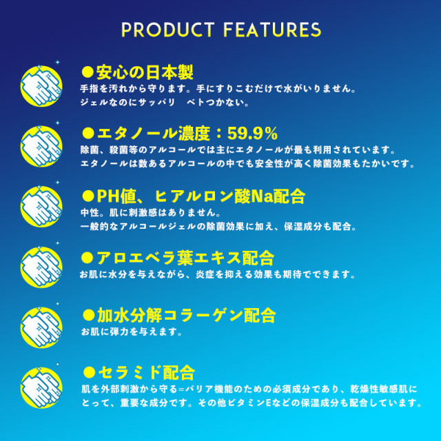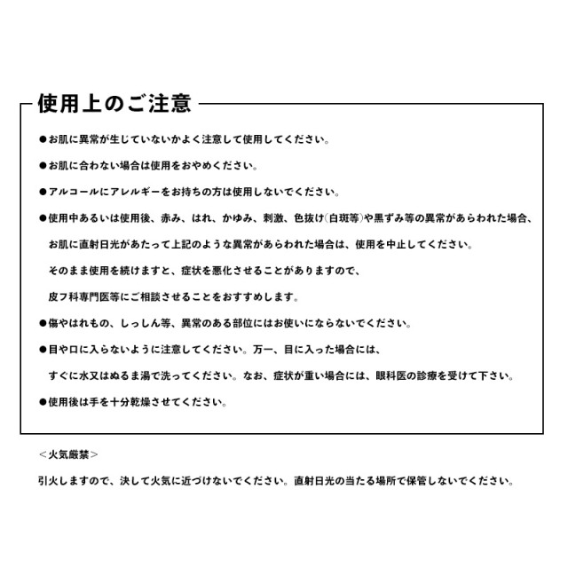 | 素材 | エタノール(59.9%)、水、グリセリン、ヒアルロン酸Na、アロエベラ葉エキス、加水分解コラーゲン、セラミドE、ビタミンC、ビタミンE、カルボマー、TEA |