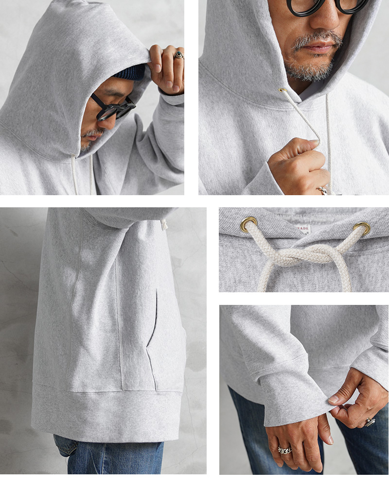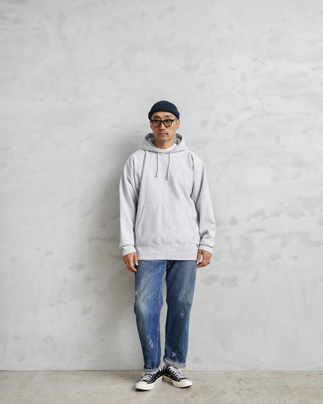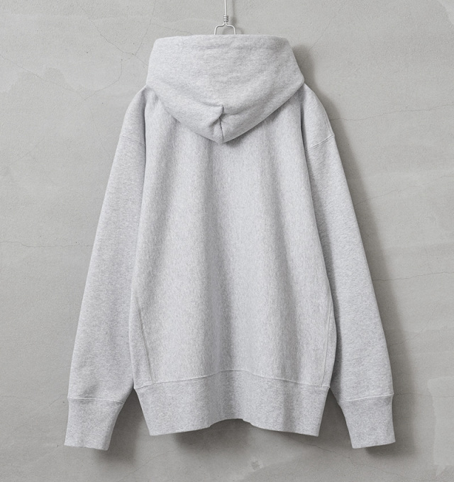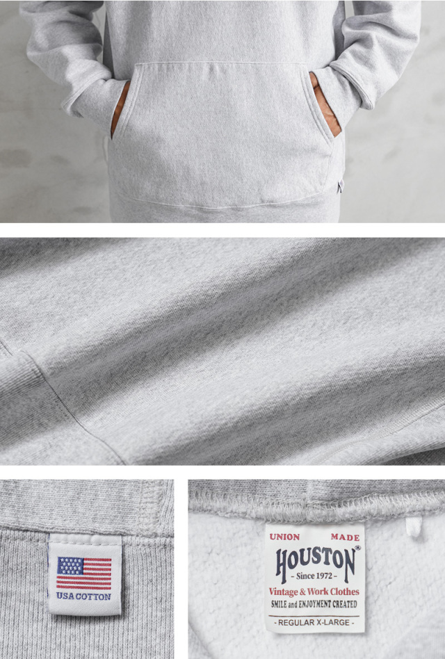 HOUSTONから、脇にリブの切り替えが入った定番スタイルの、裏起毛フーディースウェットが登場しました。贅沢に、丈夫で肌に優しいU.S.コットンを使用し、再現性の難しい特徴的な杢感のグレーは糸から選定し、できるだけ忠実にビンテージのスウェットを表現しています。極シンプルでややゆとりのあるシルエットに、カンガルーポケットやフードなど定番のカジュアルデザイン。脇にリブの切り替えが入ることで、横の縮みへの影響を少なくし、動きやすさにも配慮されています。左前裾にある【USA COTTON】のピスネームが程よいアクセント。