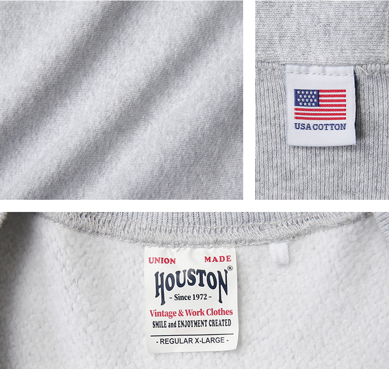 HOUSTONから、脇にリブの切り替えが入った定番スタイルの、裏起毛スウェットが登場しました。贅沢に、丈夫で肌に優しいU.S.コットンを使用し、再現性の難しい特徴的な杢感のグレーは糸から選定。できるだけ忠実にビンテージのスウェットを表現しています。