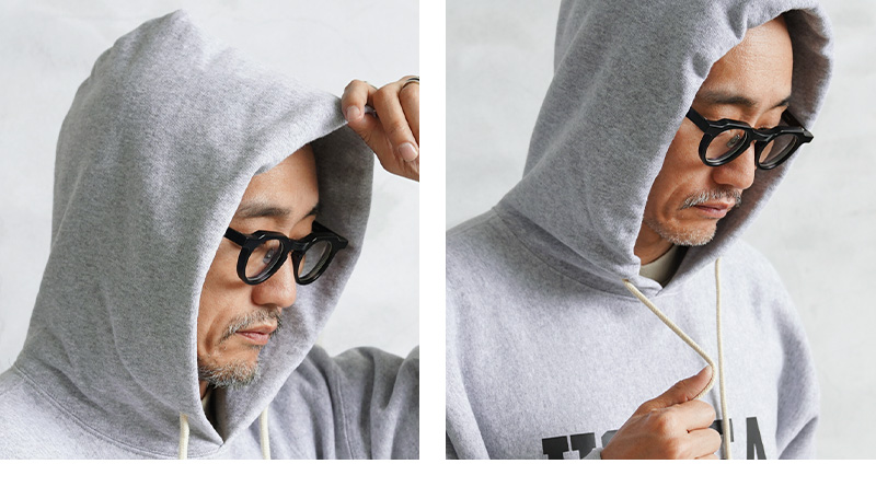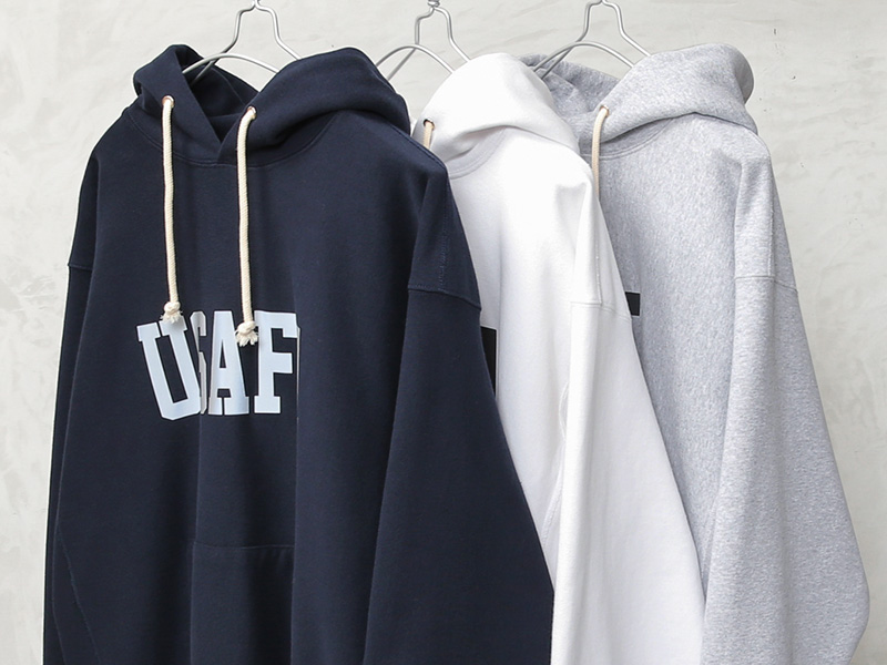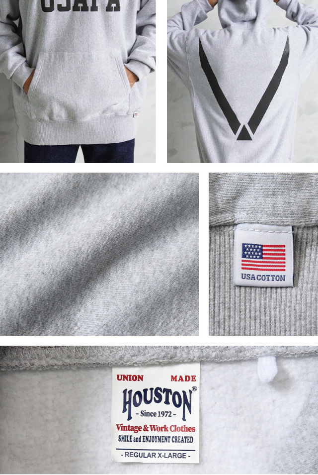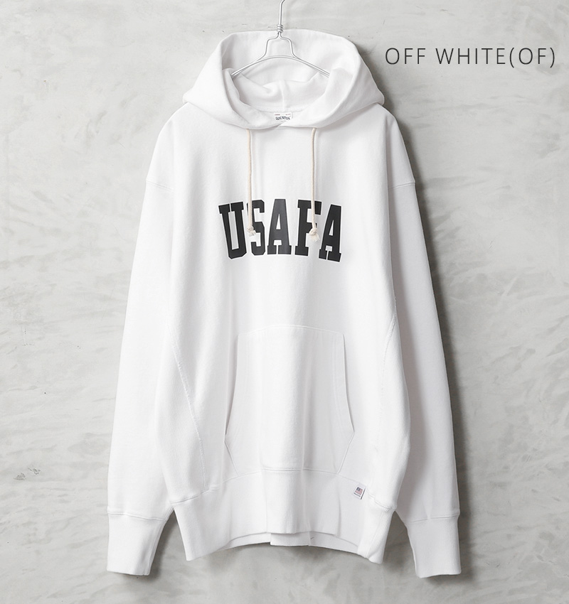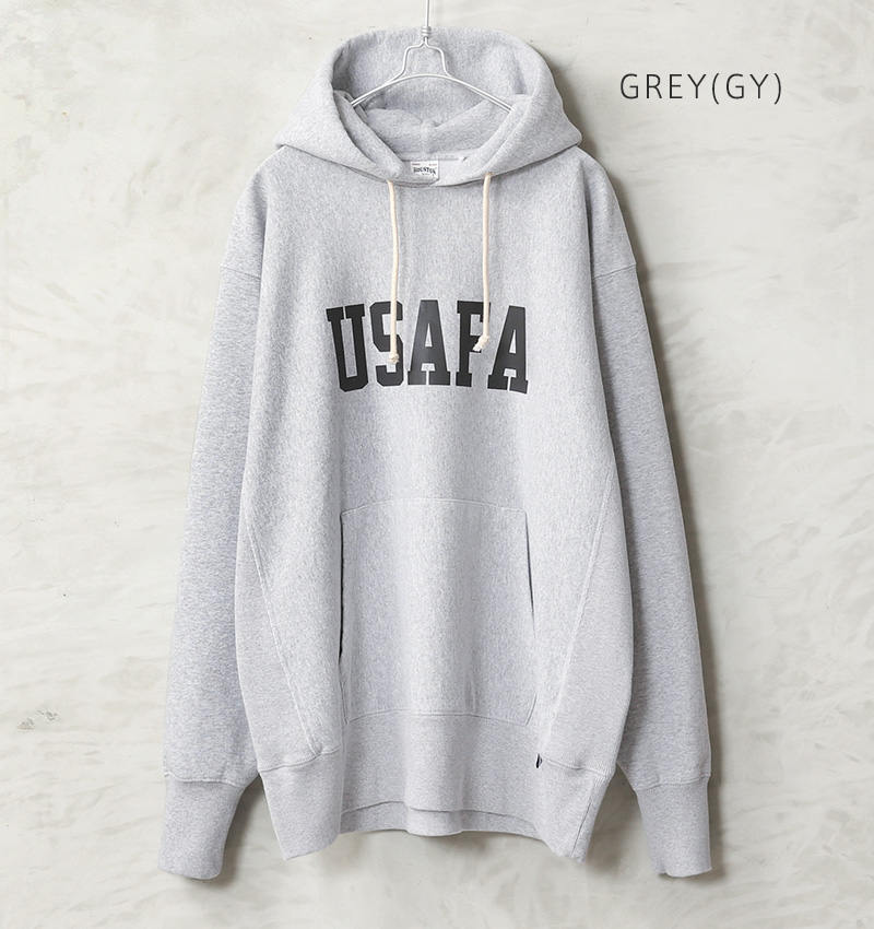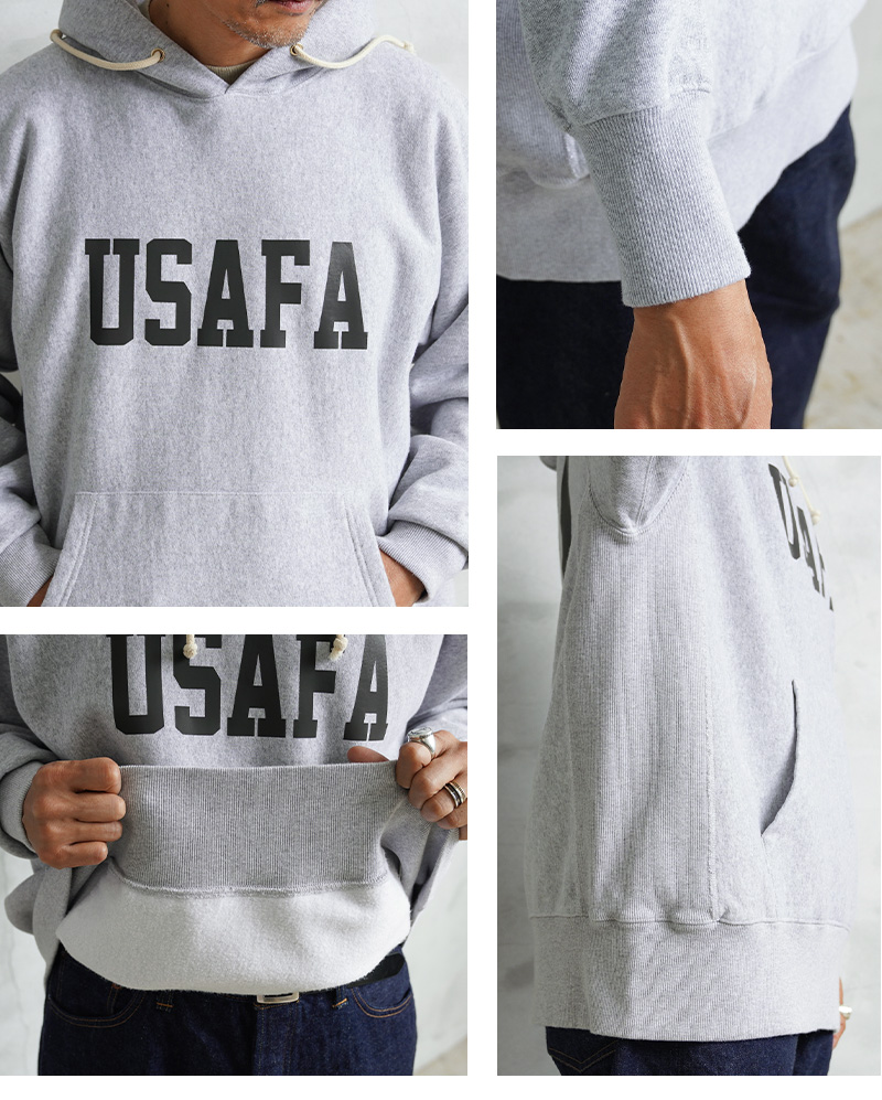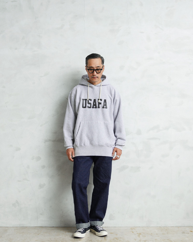 HOUSTONから、脇にリブの切り替えが入った定番スタイルの、裏起毛フーディースウェットが登場しました。ドライな質感のU.S.Aコットンを使用。再現性の難しい特徴的な杢感のグレーは糸から選定し、ビンテージスウェットを意識したアイテムです。フロントと背中には「USAFA」(アメリカ合衆国空軍士官学校)のインパクトあるプリント。近年ではビンテージミリタリー&アカデミー系のロゴとしても希少性が高く、ミリタリーファンの間では密かな人気を誇ります。